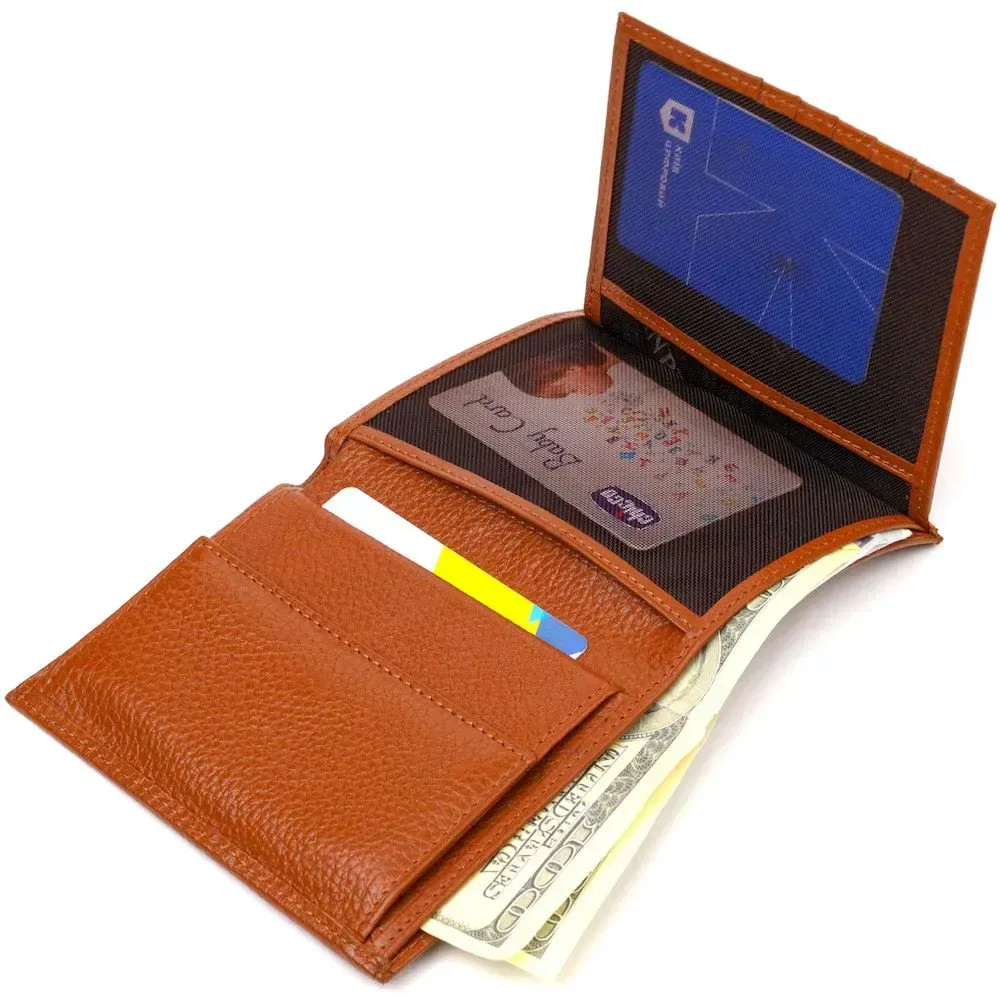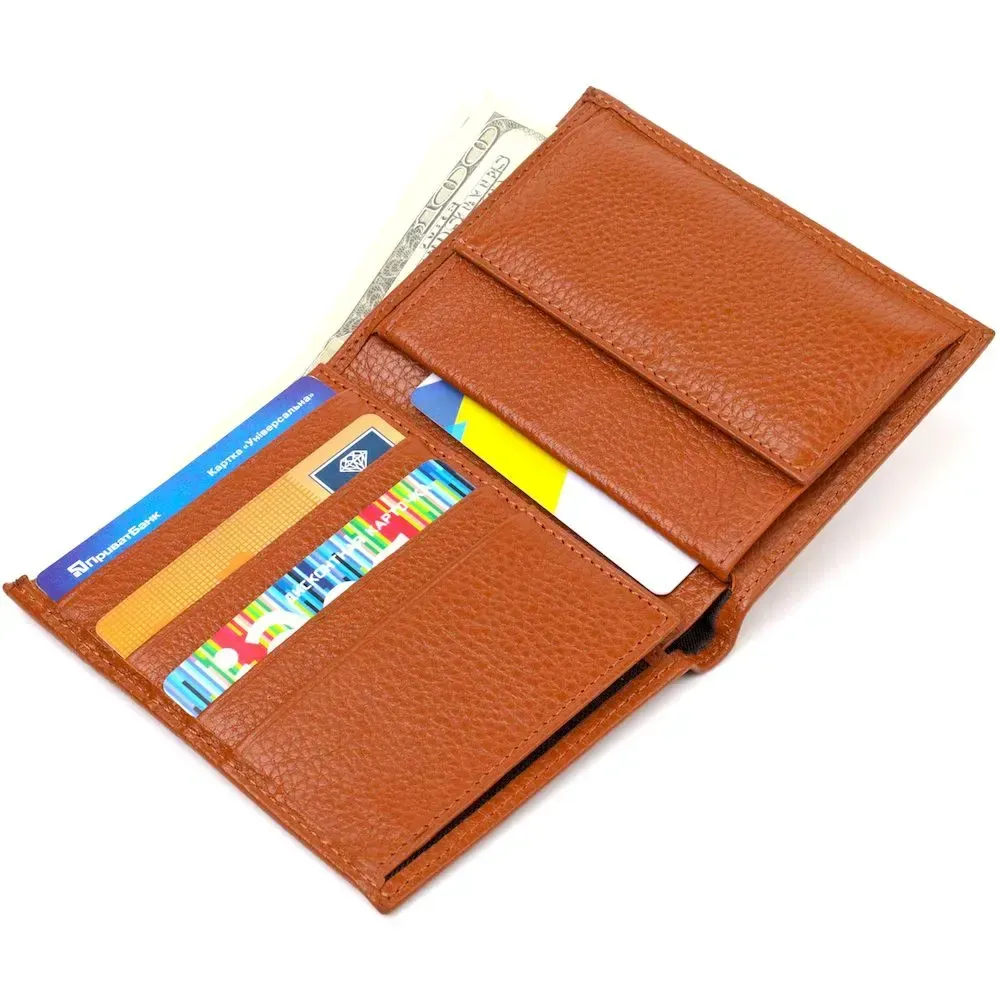 Ультрамодний чоловічий гаманець в оригінальному кольорі, з натуральної шкіри. Аксесуар має одне основне відділення з перегородкою, в яке поміщаються купюри всіх номіналів, шість кишень для карток, дві кишені під сіточкою для документів, монетницю та одну прилеглу кишеню. Закривається аксесуар навпіл без застібки. Запакований гаманець картонну коробку. Шкіряний гаманець є чудовим подарунком для рідних та близьких людей.
