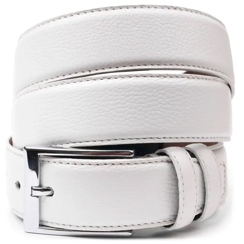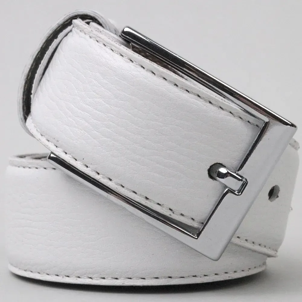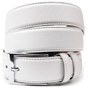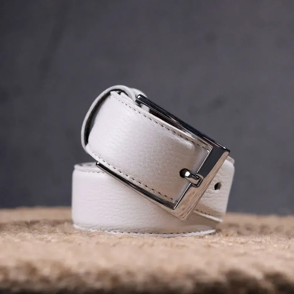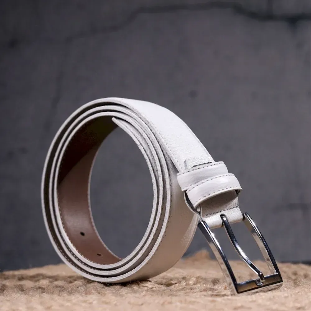 Добротний чоловічий ремінь середньої довжини для чоловіків. Має гарний білий колір, зернисту фактуру та класичну пряжку з простим та надійним механізмом. Виконано виріб із натуральної висококласної шкіри. Такий ремінь можна сміливо подавати як чудовий подарунок.