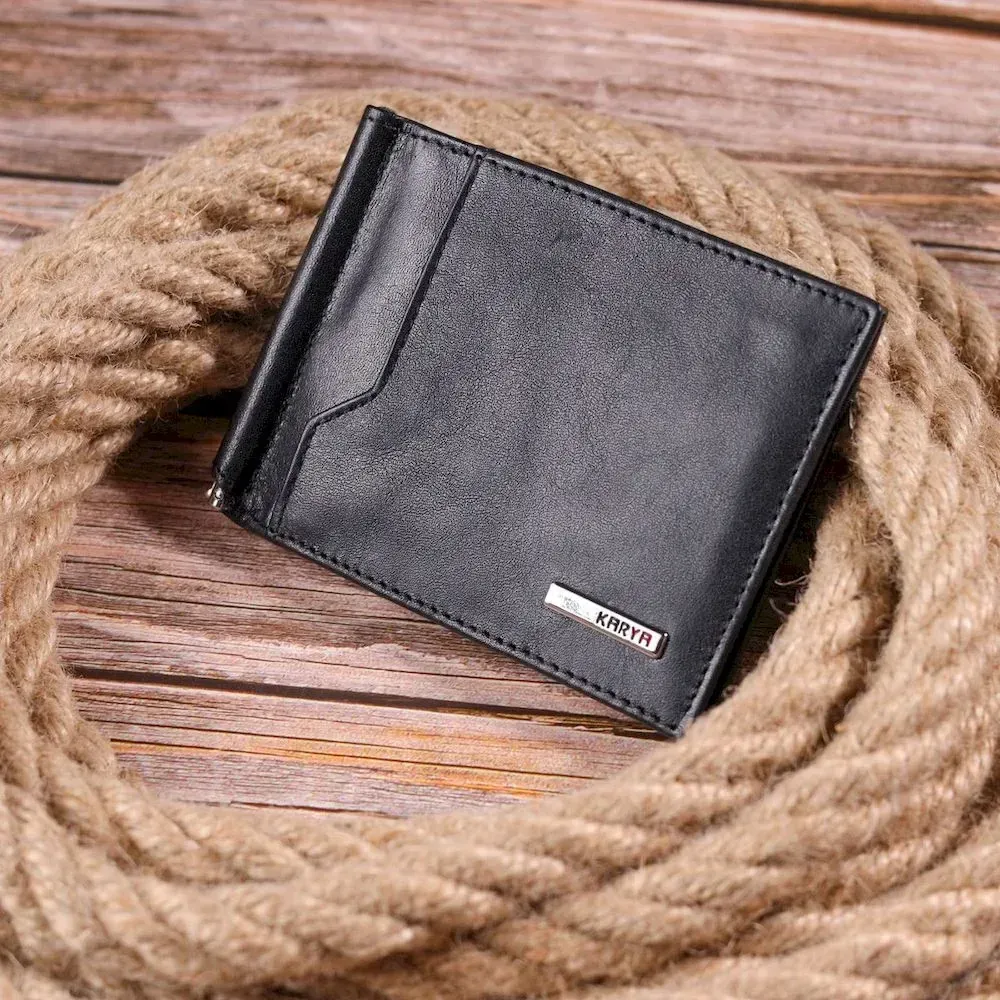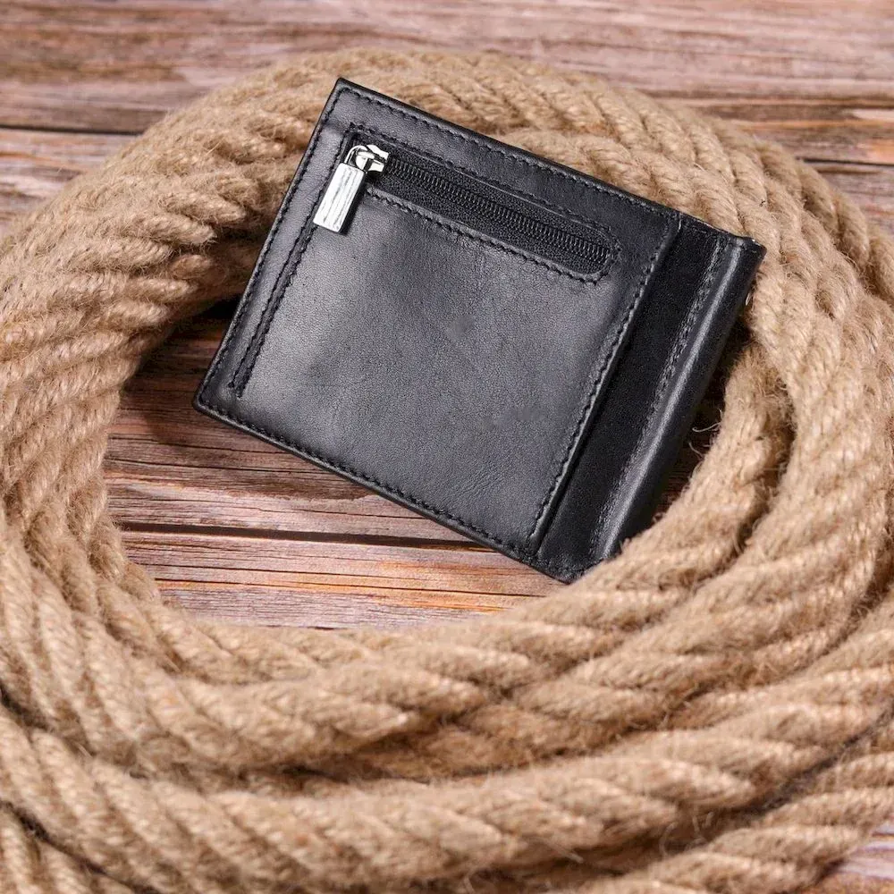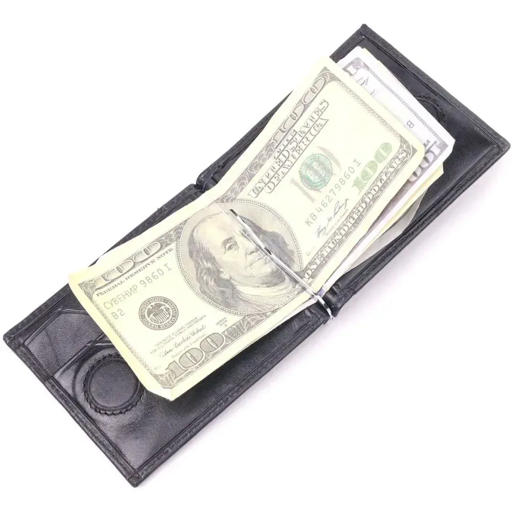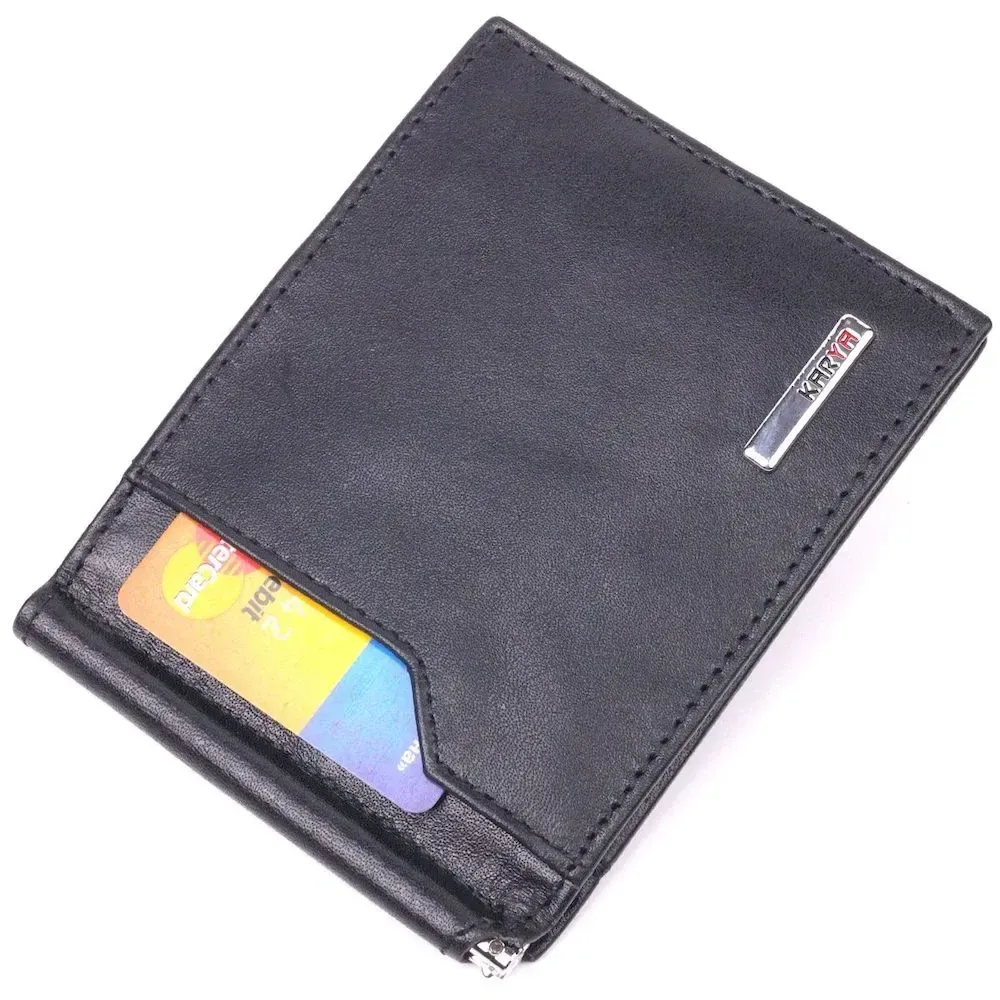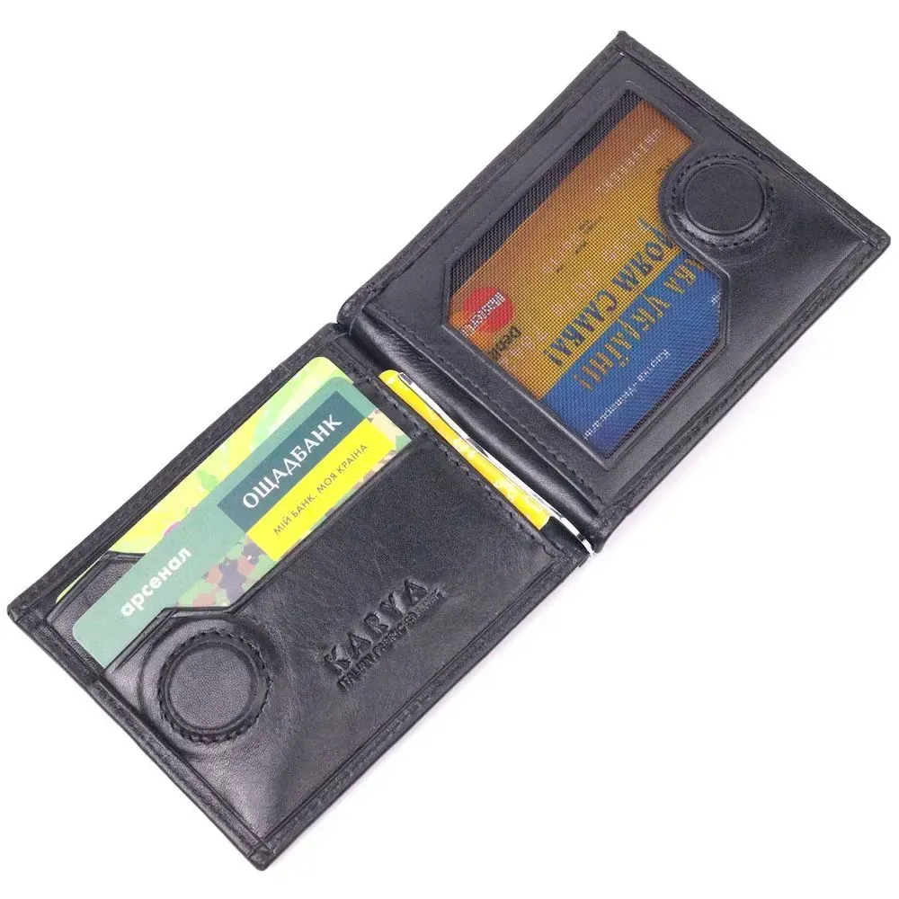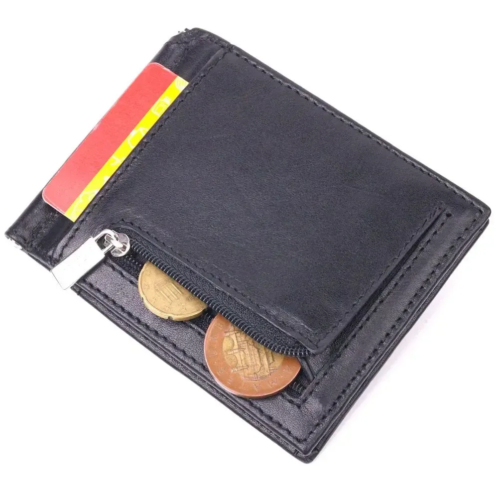 - виріб упакований у фірмову коробку. Стильний чоловічий затискач з натуральної гладкої шкіри, в чорному кольорі. Виріб закривається у два складання на магніт. Затискач складається з металевого утримувача для купюр, трьох осередків для кредитних карток, трьох прилеглих кишень, відділення під сіточкою та монетниці, що закривається на блискавку. Аксесуар упакований у фірмову коробочку. Вироби з натуральної шкіри завжди будуть чудовим подарунком для близької людини.