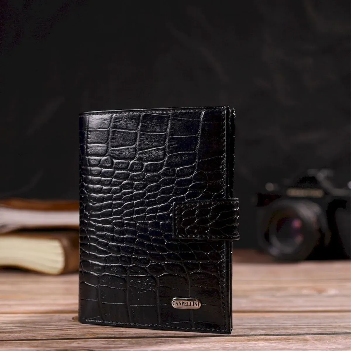 Стильний вертикальний чоловічий гаманець середнього розміру з натуральної шкіри з тисненням під крокодила CANPELLINI 21736 Чорний