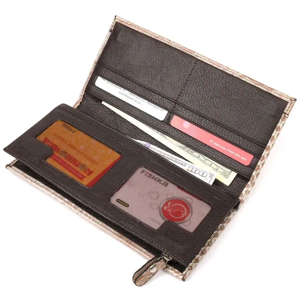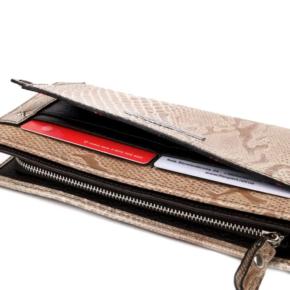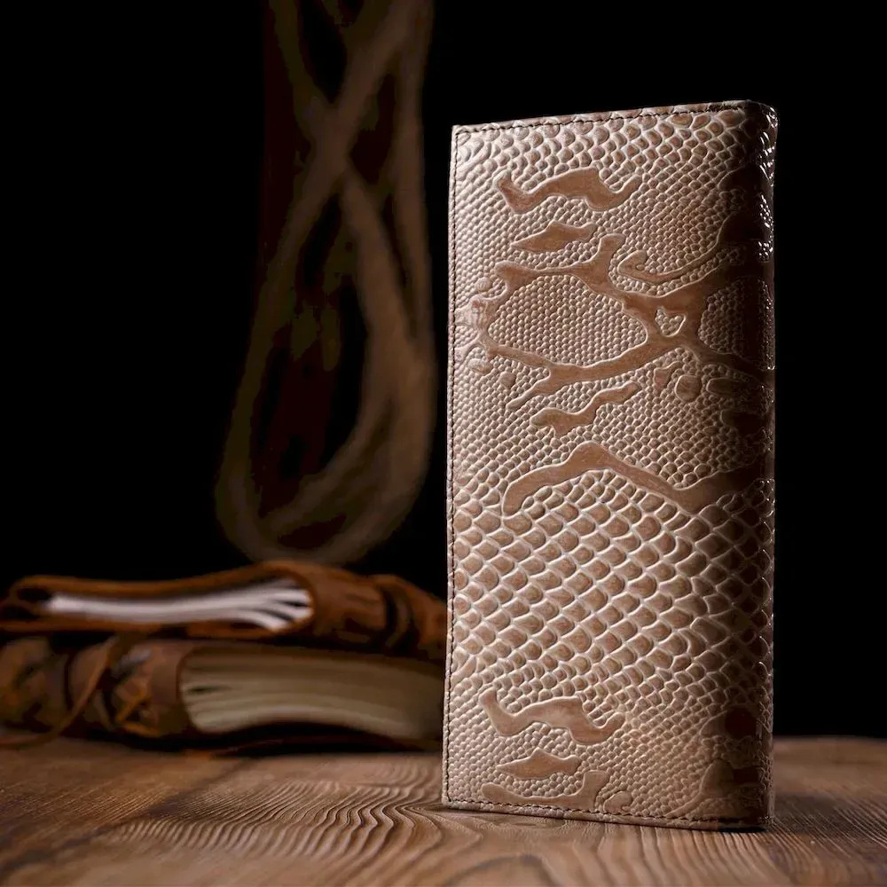 Стильний жіночий гаманець з лакованої натуральної шкіри, тисненням під рептилію. На лицьовій стороні блок для карток, який прошитий білою ниткою для декору та закривається хлястиком на кнопку. Всередині відділення для карт і документів, що закривається на магніти. Відділення на блискавці для купюр без складання. Запакований аксесуар у фірмову коробку та пакет бренду. Вироби з натуральної шкіри завжди будуть чудовим подарунком для близької людини.