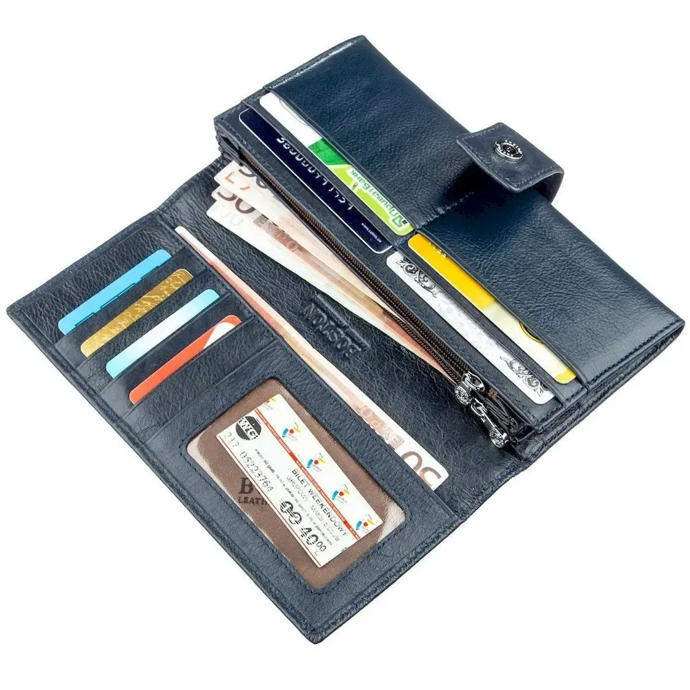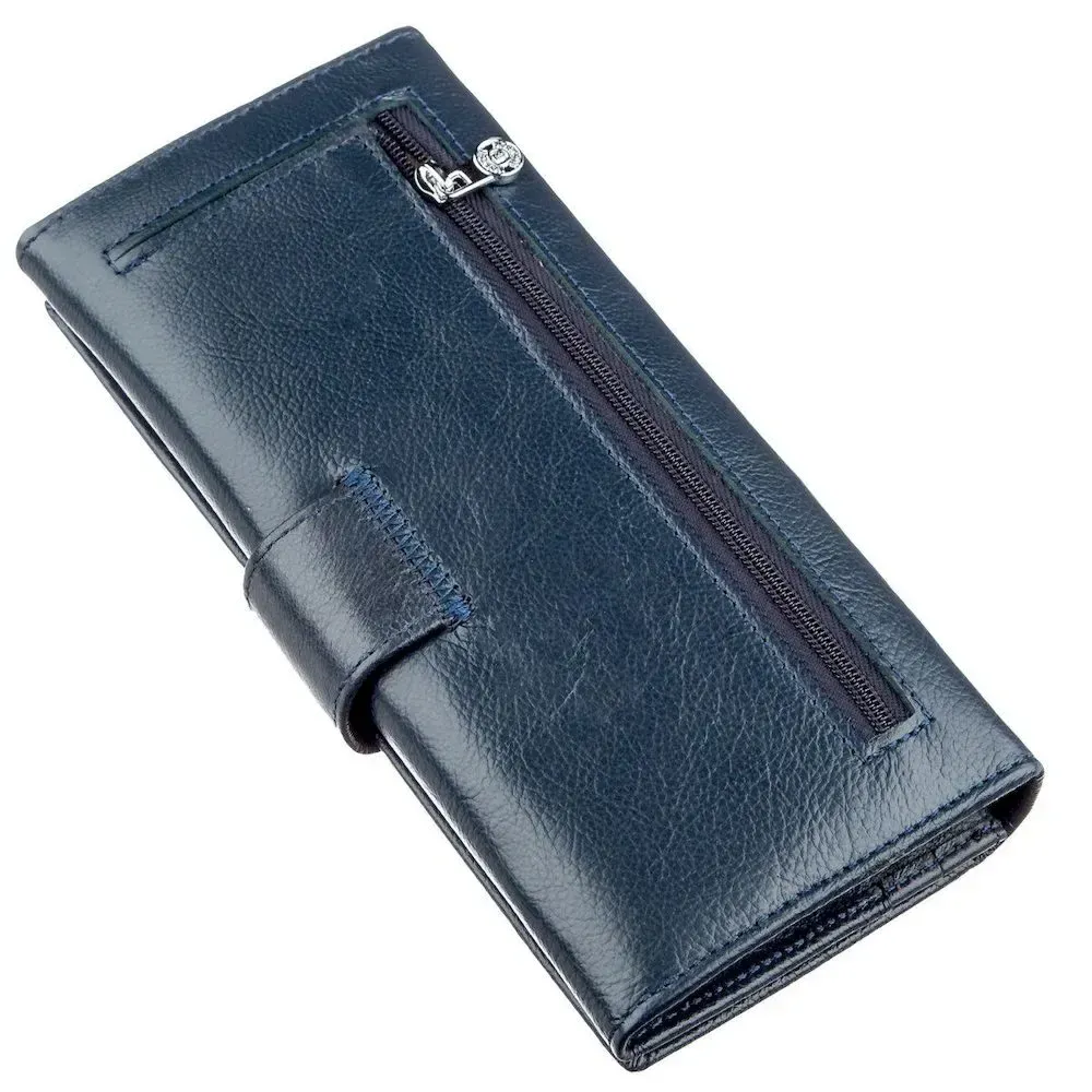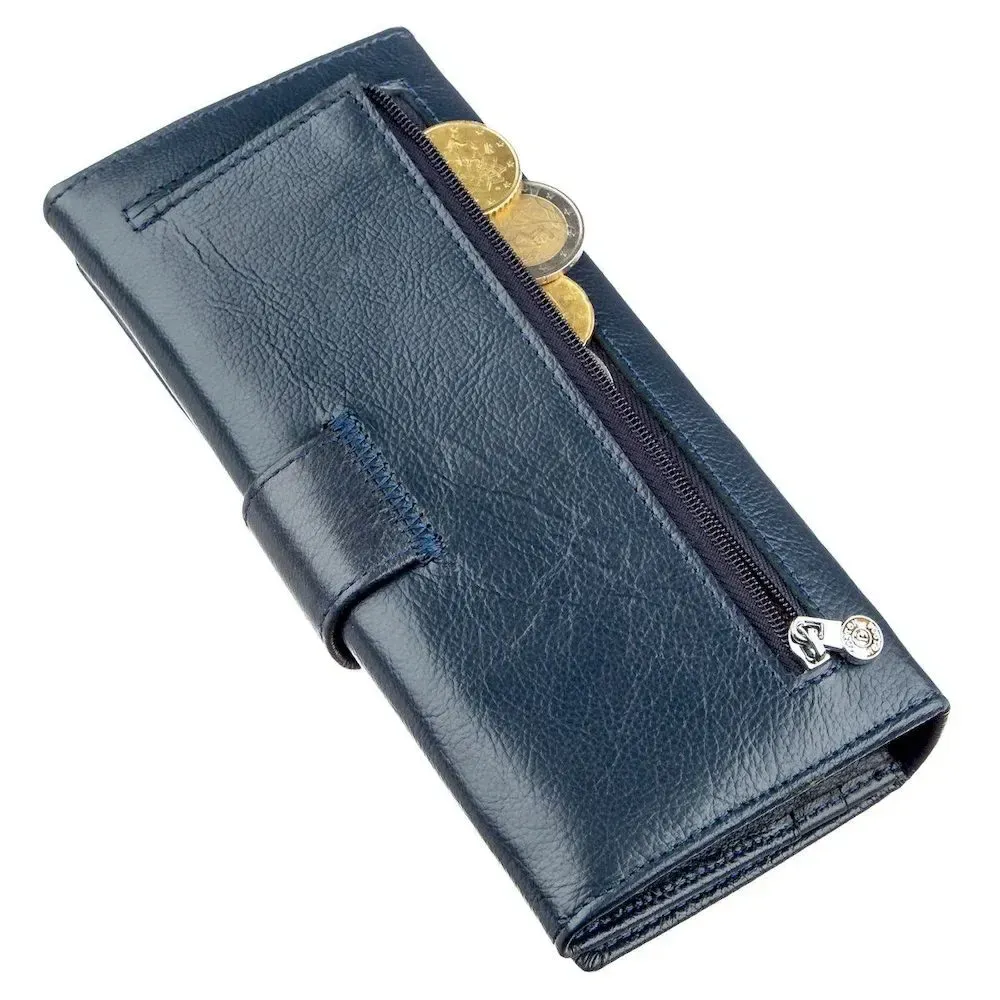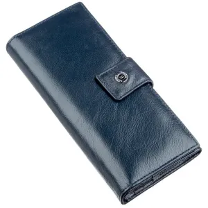 Стильний жіночий гаманець із якісної шкіри для екстравагантних жінок. Колір виробу – сіро-блакитний з матовим відтінком, виглядає дуже стильно та модно. Власниця даного аксесуара неодмінно має гарний смак. Гаманець легко закривається на зручну кнопку. Має чотири місткі відділення для купюр, монетницю на блискавці на тильній стороні, кишені для візиток та інших пластикових карток. Ця модель стане чудовим подарунком близькій і дорогій людині. Запакований гаманець у білу картонну коробку з логотипом виробника.