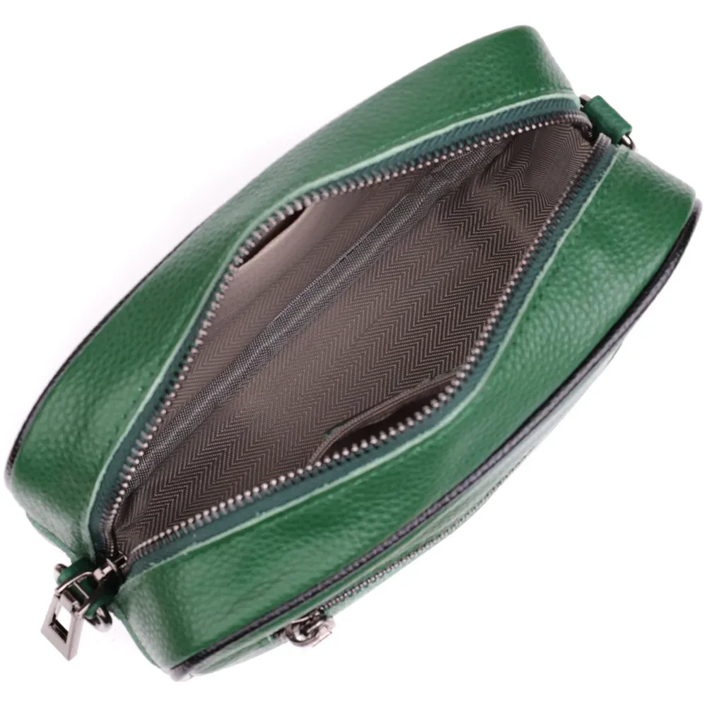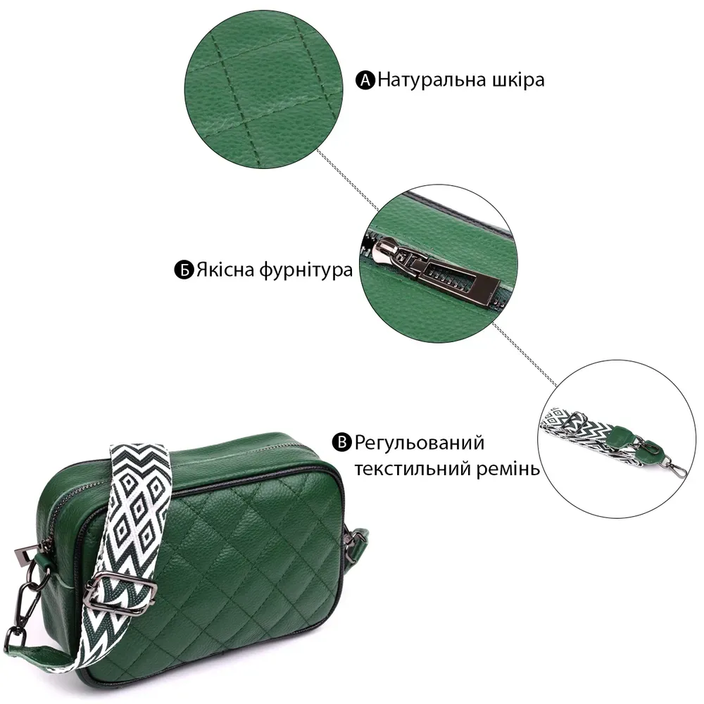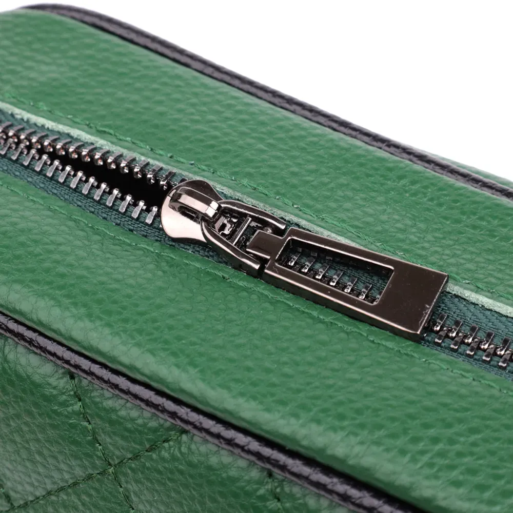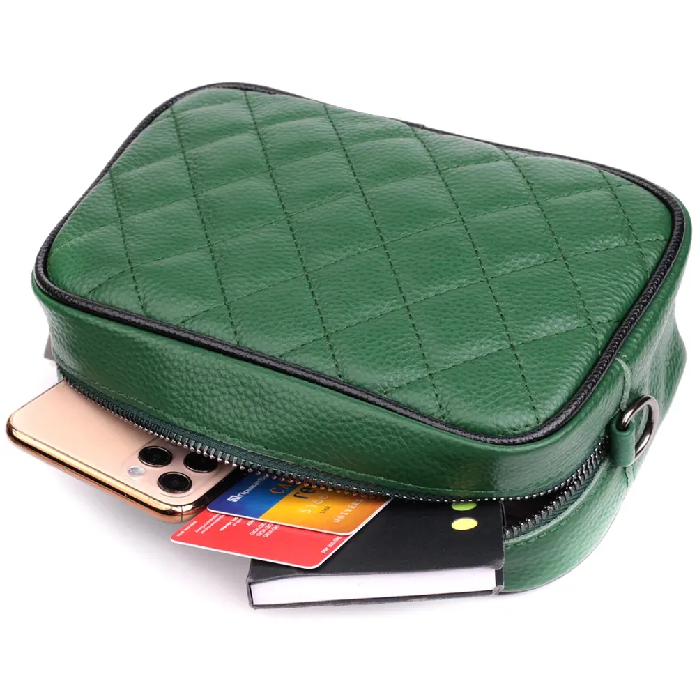 Стегана ромбами на лицьовій стороні сумка для жінок з натуральної шкіри, в красивому зеленому кольорі. Аксесуар складається з одного основного відділення всередині якого розташована кишеня відкритого типу і кишеня на блискавці, також зовні розташована кишеня на блискавці, на тильній стороні. Носити сумку можна в руці як клатч, на плечі та через плече, для цього є текстильний ремінь, що знімається. У виробі використано якісну фурнітуру кольору темного срібла. Універсальний варіант сумки як на вечір так і як сумочка на кожен день.