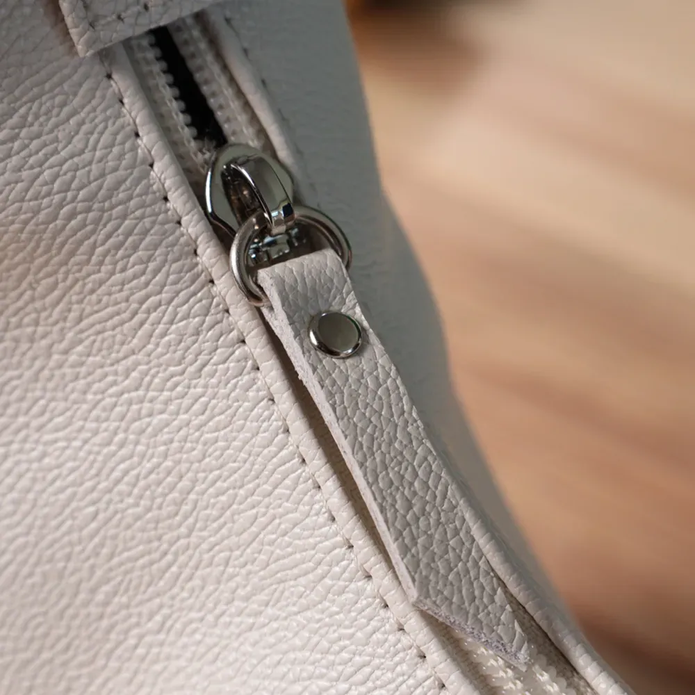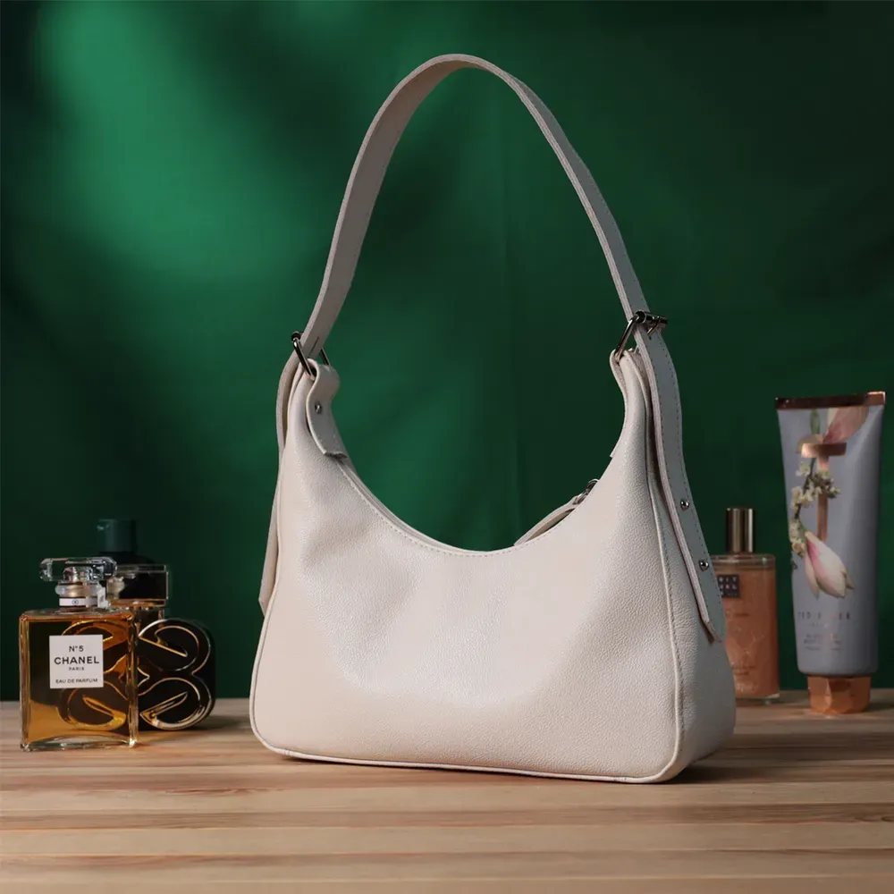 Жіноча сумка для тих, хто любить красивий дизайн без зайвих деталей. Така сумка у модному світі має назву – сумка багет. Це невелика сумка з коротким ременем, яку зручно носити під рукою, вона набула своєї популярності завдяки своєму універсальному дизайну та незвичайній формі. Колір виробу – благородний бежевий, фактура – зерниста. Матеріал виконання – натуральна шкіра з високими показниками якості. Відмінний варіант сумки на кожен день, адже вона не тільки приваблива зовні, але й оснащена розумною системою внутрішніх відділень, що дозволить організувати простір усередині.