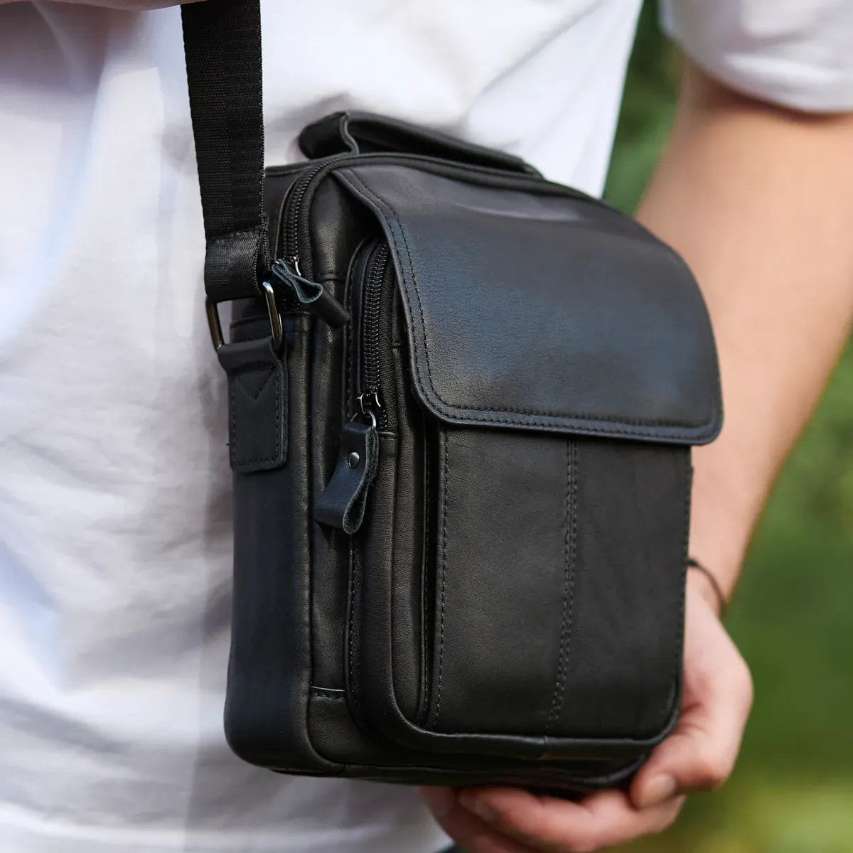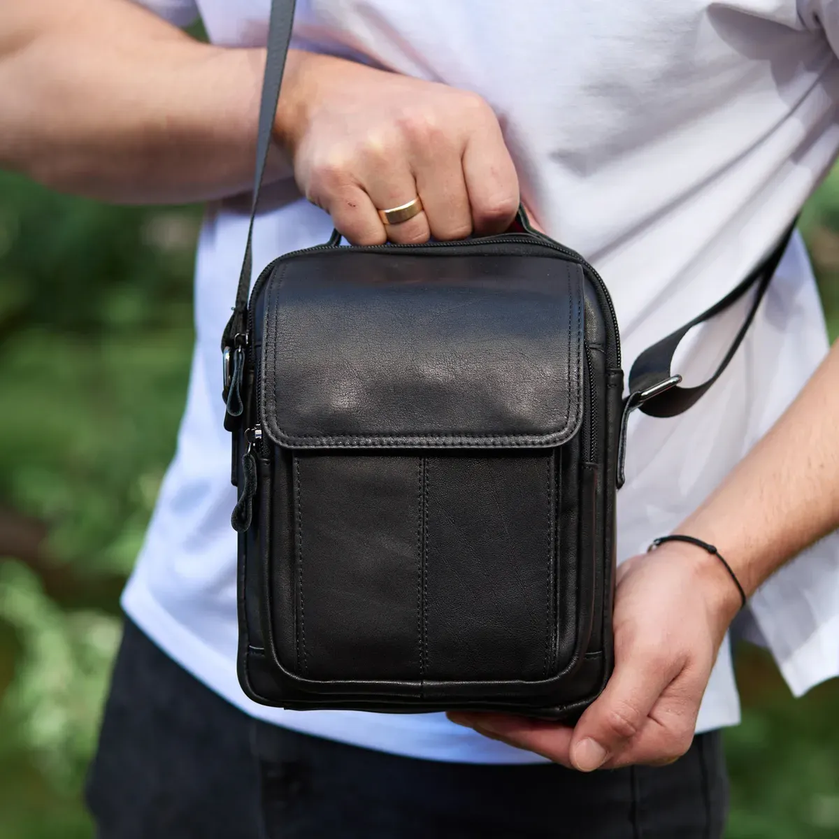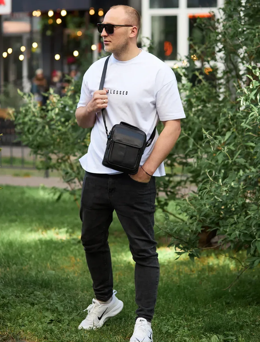 Доволі вмістовна чоловіча сумка через плече, виконана з м'якої високоякісної натуральної шкіри. Має одне основне відділення. З тильної частини сумки знаходиться кишеня на блискавці, а з лицьової частини – глибоке відділення без застібки під накидкою та додаткове відділення на блискавці. Відділення застібаються за допомогою якісної фурнітури. Внутрішнє оздоблення сумки - щільна підкладка. Ремінь сумки текстильний, не знімний.