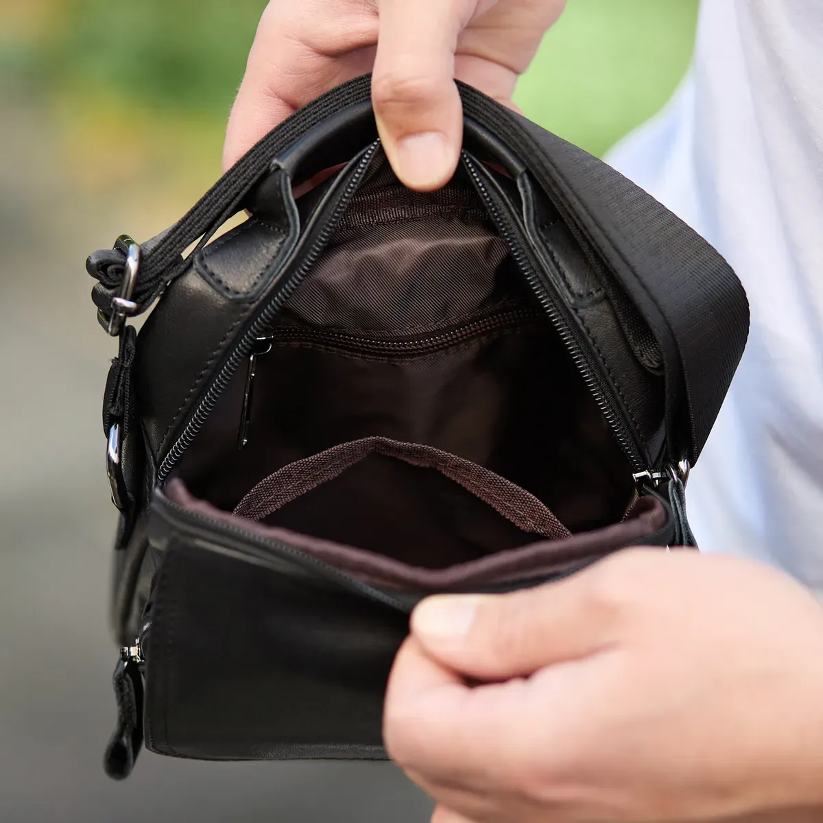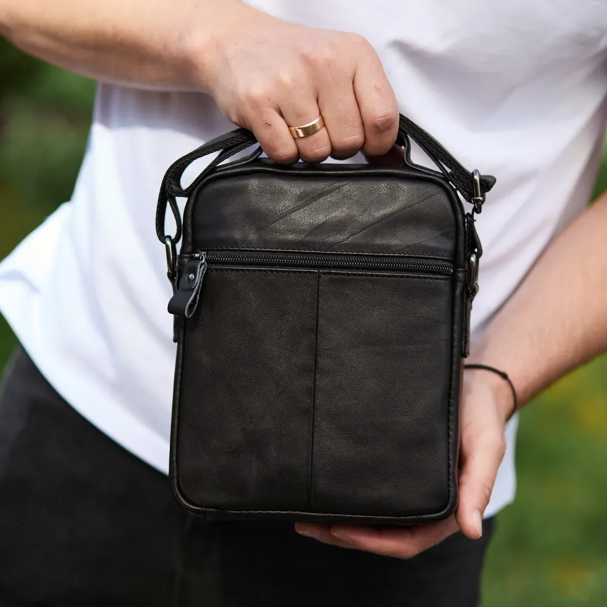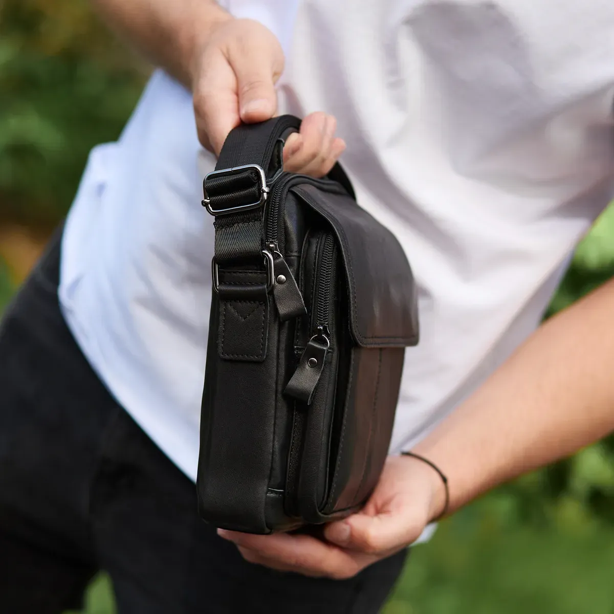 Доволі вмістовна чоловіча сумка через плече, виконана з м'якої високоякісної натуральної шкіри. Має одне основне відділення. З тильної частини сумки знаходиться кишеня на блискавці, а з лицьової частини – глибоке відділення без застібки під накидкою та додаткове відділення на блискавці. Відділення застібаються за допомогою якісної фурнітури. Внутрішнє оздоблення сумки - щільна підкладка. Ремінь сумки текстильний, не знімний.