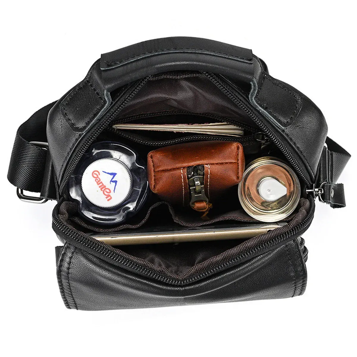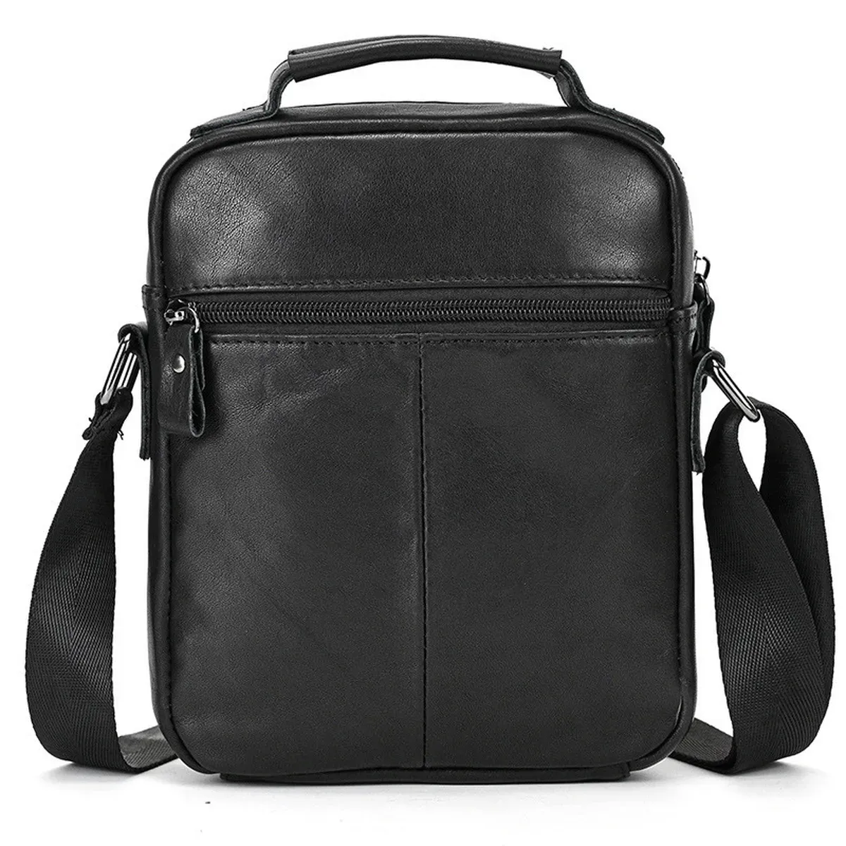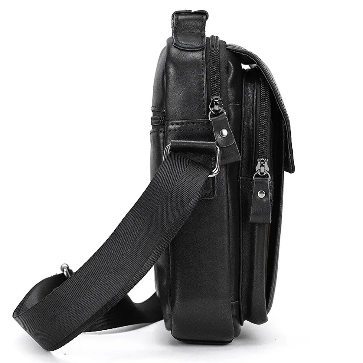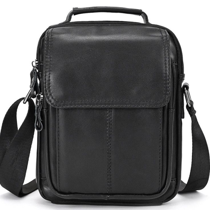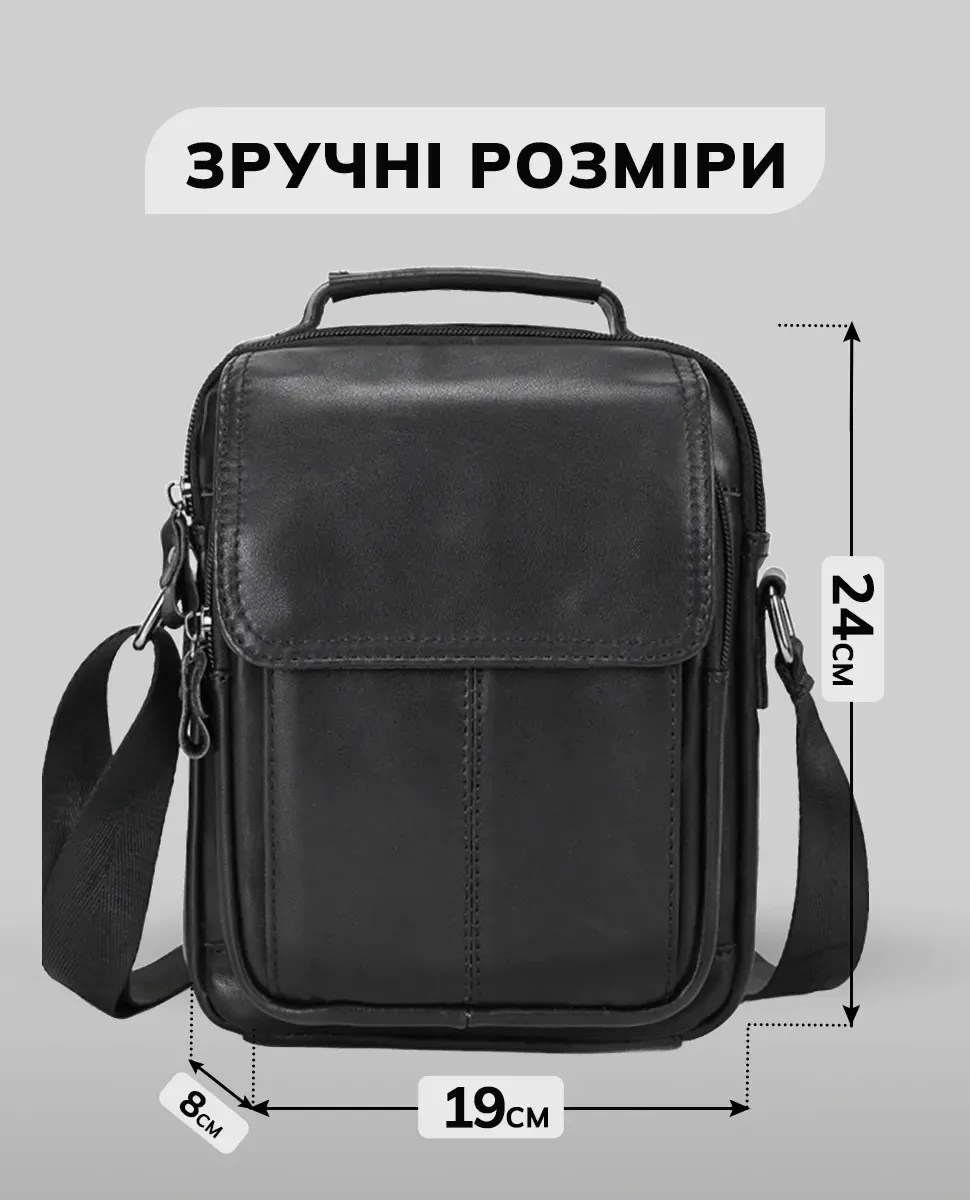 Доволі вмістовна чоловіча сумка через плече, виконана з м'якої високоякісної натуральної шкіри. Два основних відділення рівномірні, одне з них має бокову кишеню на блискавці, а також кишеню відкритого типу. Між основними відділеннями є додаткове відділення на магнітній кнопці. З тильної частини сумки знаходиться кишеня на блискавці, а з лицьової частини – глибоке відділення без застібки під накидкою. Відділення застібаються за допомогою якісної фурнітури. Внутрішнє оздоблення сумки - щільна підкладка. Ремінь сумки текстильний, знімний, надійно кріпиться за допомогою карабіна.