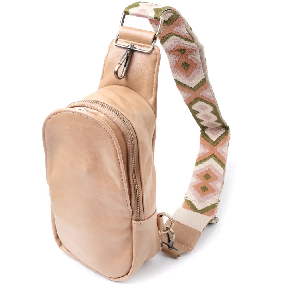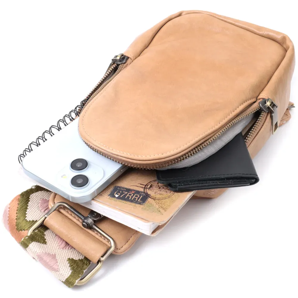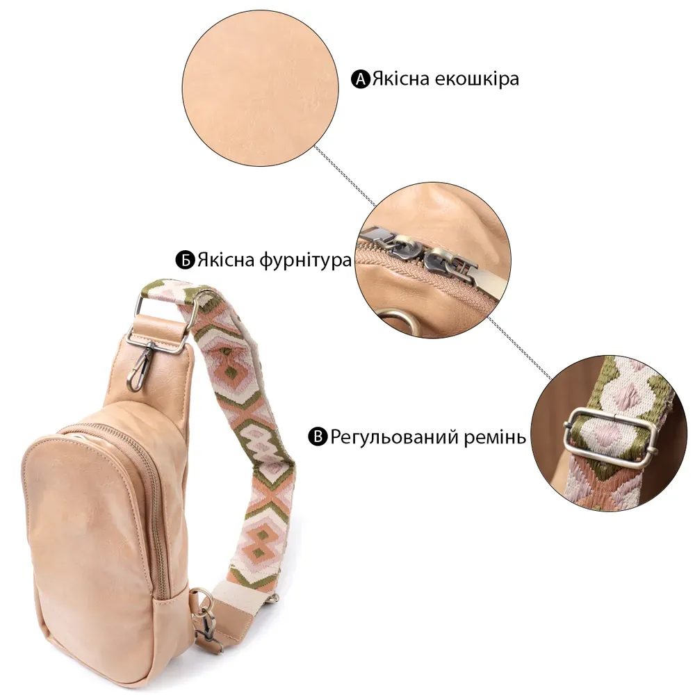 Невелика жіноча сумка через плече на кожен день з якісної екошкіри, яка є альтернативою натуральній шкірі. Дана модель складається з одного основного відділення, яке закривається на блискавку і в якому знаходяться три кишені для кредитних карток усередині, а також однієї потайної кишені на лицьовій стороні, що закривається на карабін. Акцентом даної моделі є зручний регульований плечовий ремінець у етнічному стилі, що дуже модно вже кілька сезонів. Екошкіра - високоякісна альтернатива натуральному матеріалу, яка дуже стійка до тертя, до низьких температур, відмінно носиться на відміну від інших штучних матеріалів, а також має гіпоалергенний склад на відміну від натуральної шкіри. Мода не стоїть на місці, на зміну класичним сумкам приходять нові моделі, які обумовлені сучасним часом, саме такою є слінг сумка - зручна, практична, невелика, але містка і головне якісна.