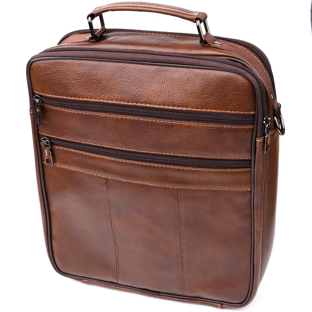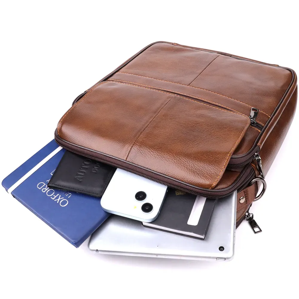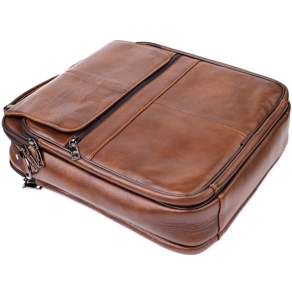 Зручна шкіряна сумка виконана з високоякісної натуральної шкіри та поєднує в собі функціональність та стиль. Модель оснащена двома основними відділеннями на блискавці, одне з яких включає таємну кишеню на блискавці на задній стінці для надійного зберігання важливих дрібниць.