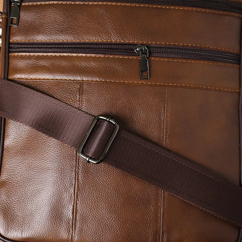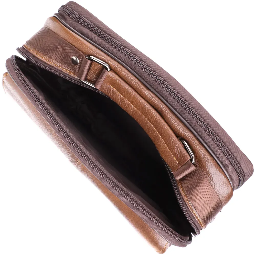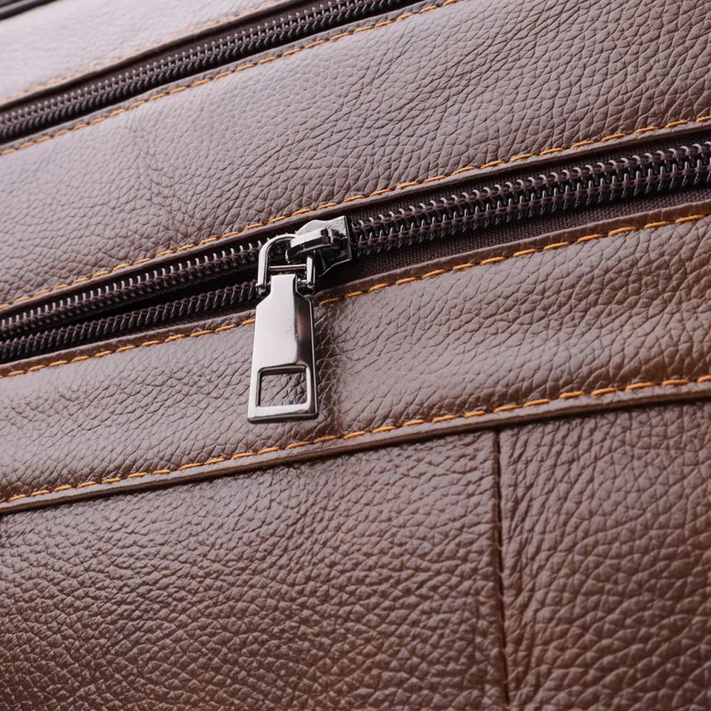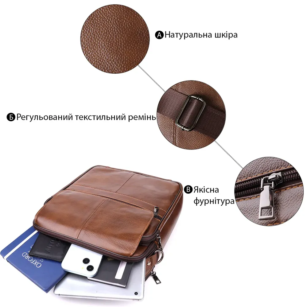 Зручна шкіряна сумка виконана з високоякісної натуральної шкіри та поєднує в собі функціональність та стиль. Модель оснащена двома основними відділеннями на блискавці, одне з яких включає таємну кишеню на блискавці на задній стінці для надійного зберігання важливих дрібниць.