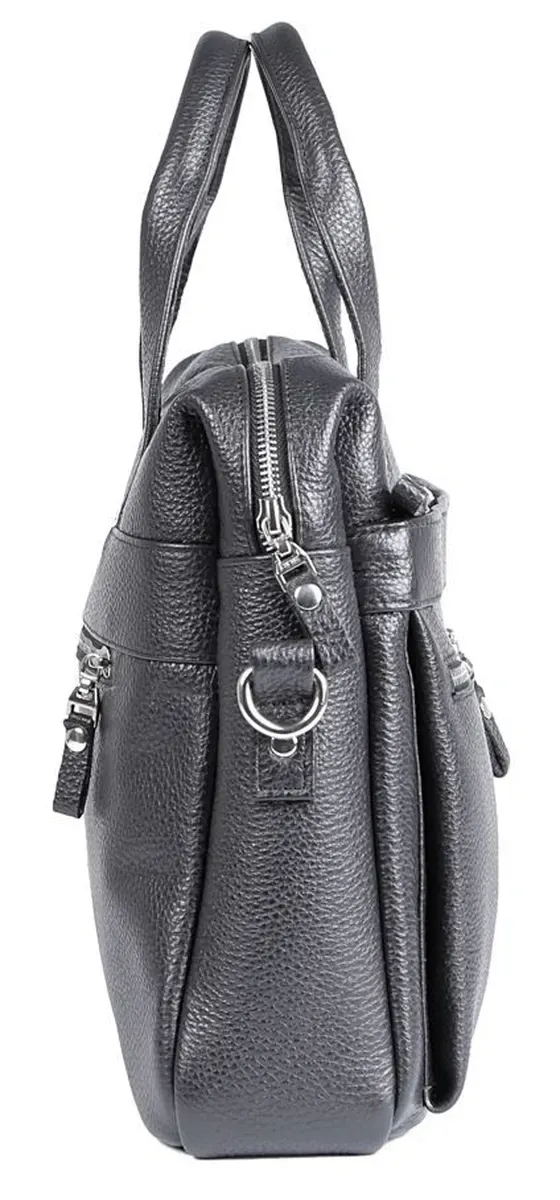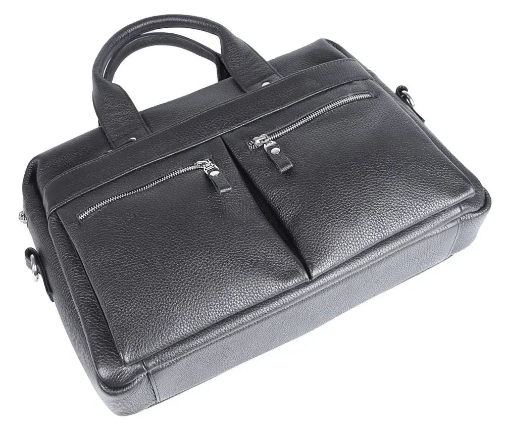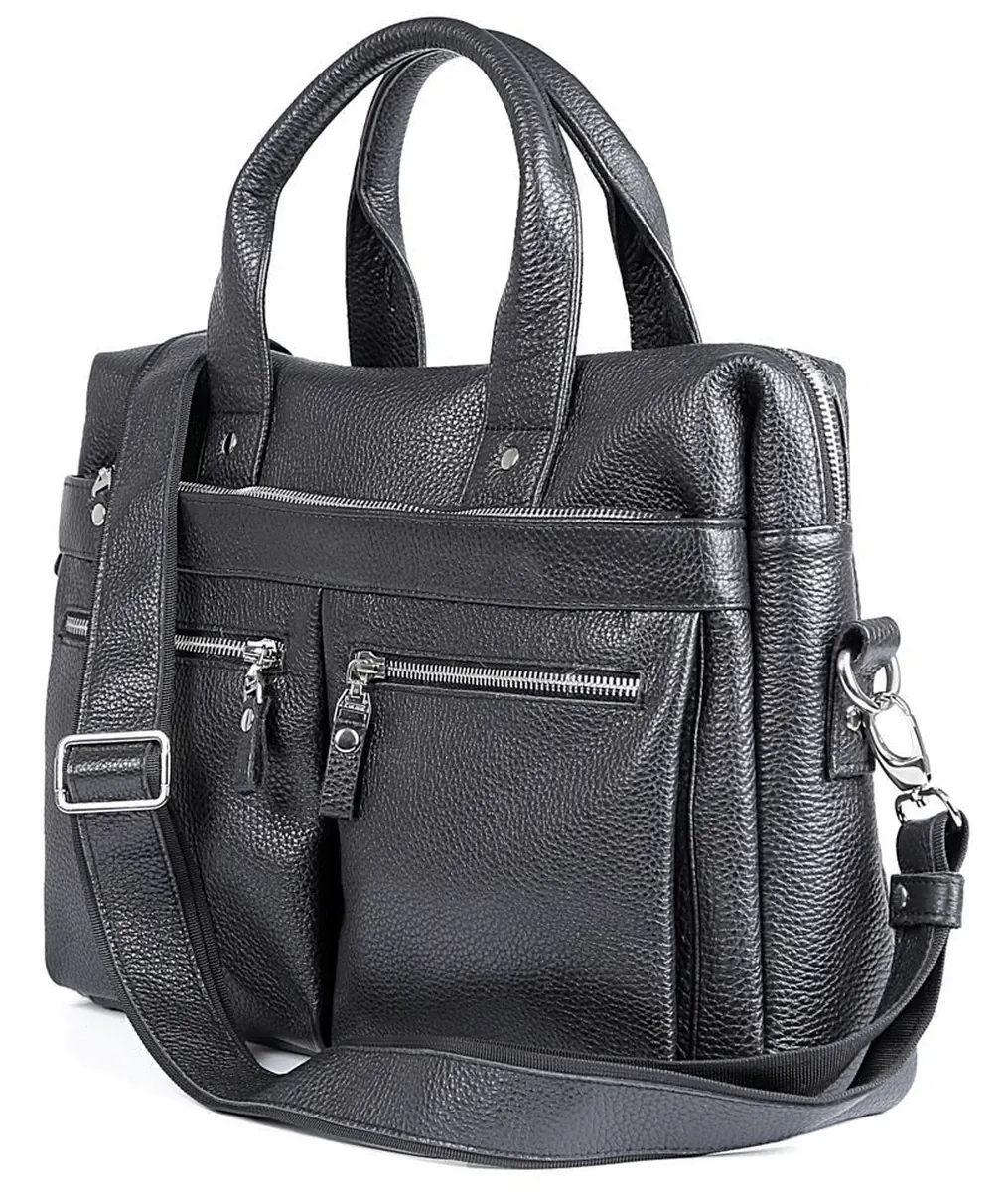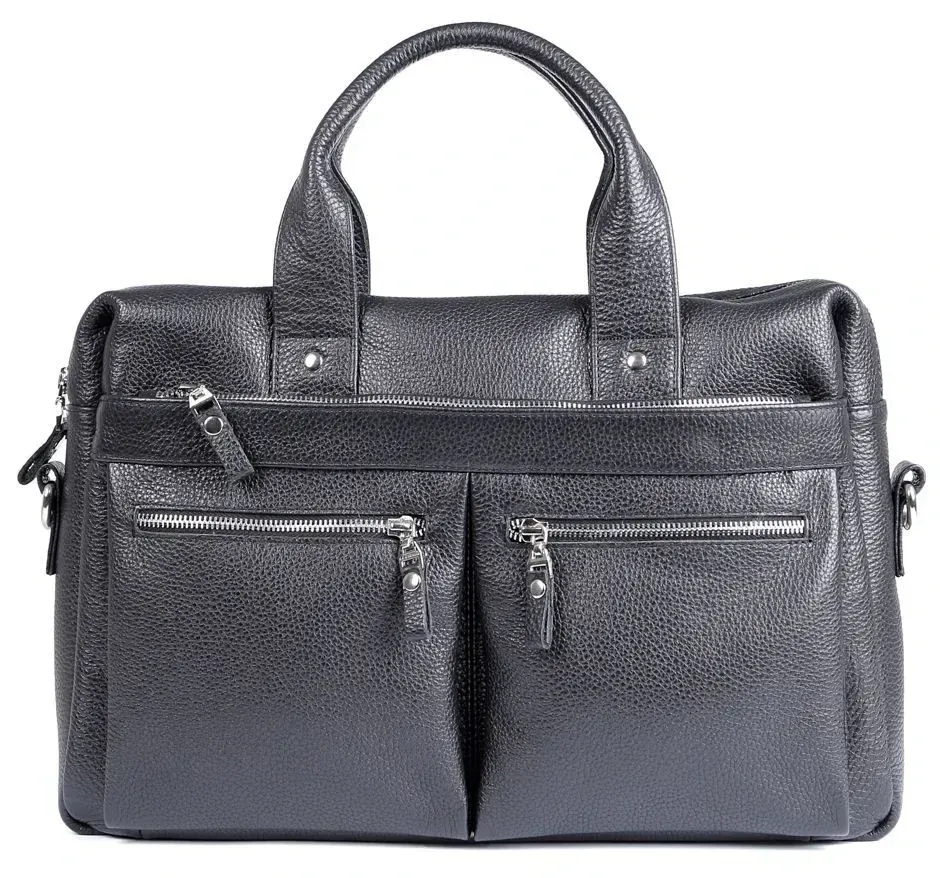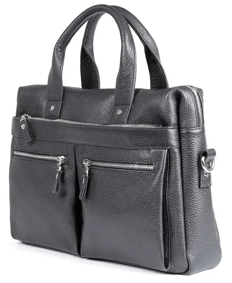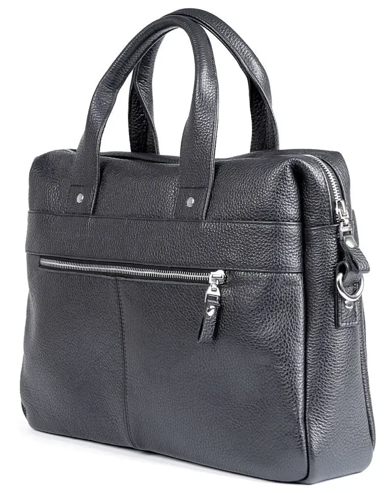 Высококачественная мужская сумка с отделением для небольшого ноутбука. Аксессуар выполнен из натуральной приятной на ощупь кожи черного цвета. На лицевой стороне данного изделия расположены одно отделение и два кармана на молниях. На задней внешней стороне находится еще одно отделение на молнии. Сумку можно переносить в руке при помощи удобных кожаных ручек, а также через плечо (в комплекте съемный, регулируемый плечевой ремень, который выполнен в комбинации текстильного материала и натуральной кожи). Цвет фурнитуры: серебро.