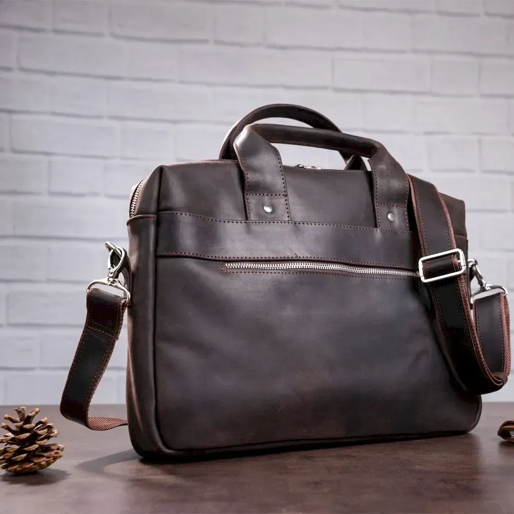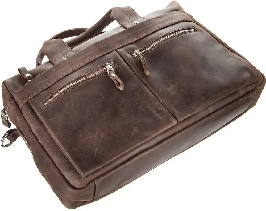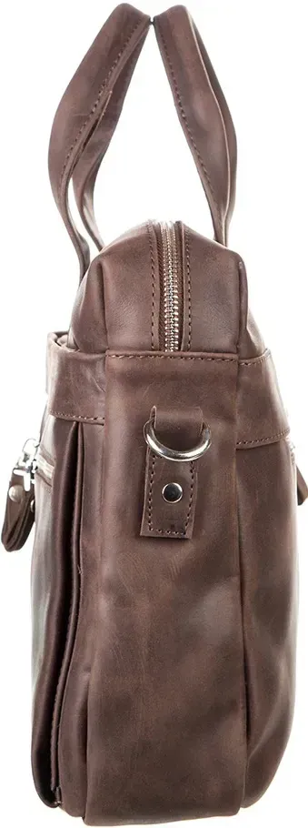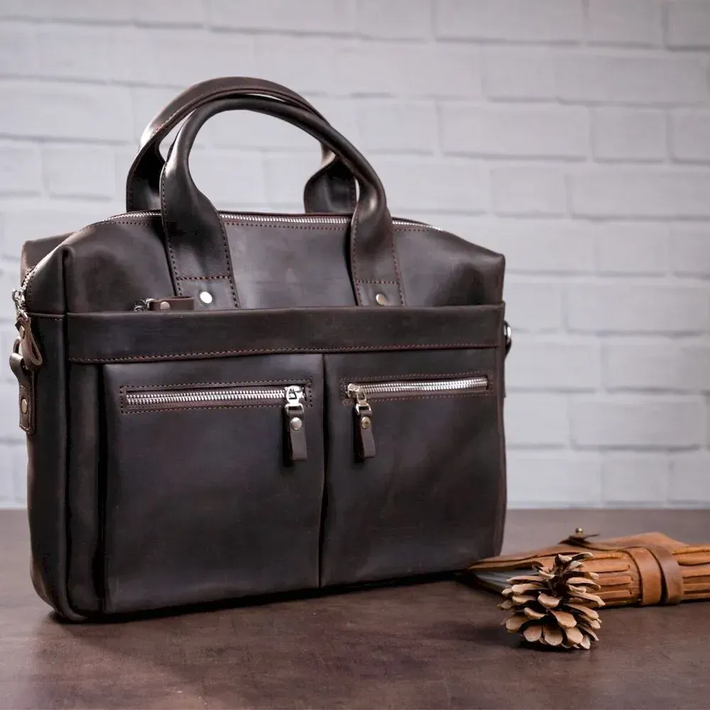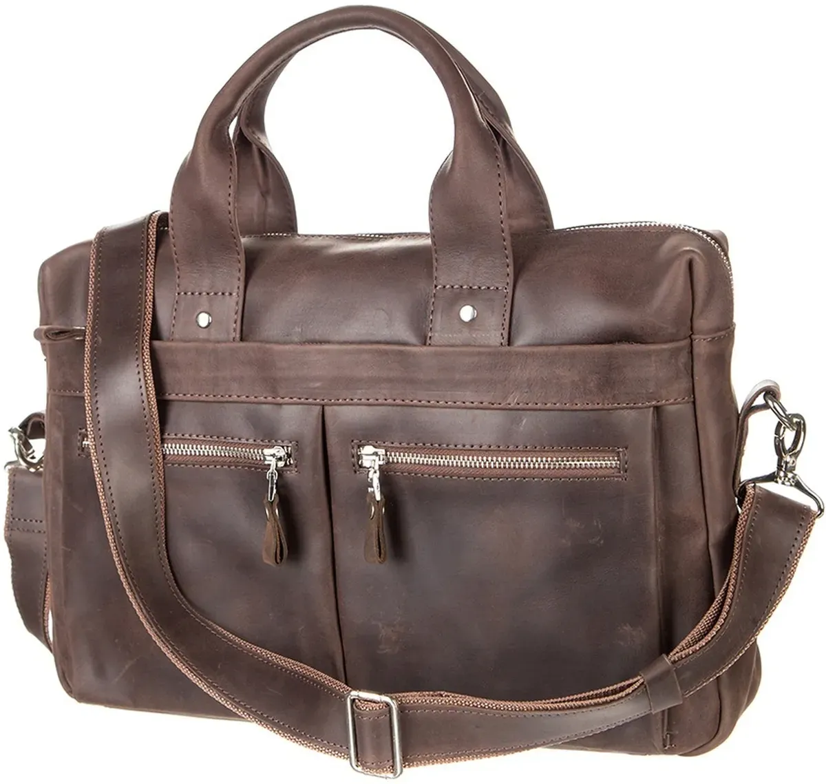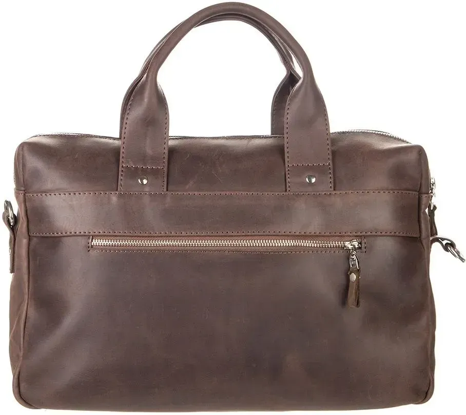 Ексклюзивна та надійна сумка  ;виготовлена з натуральної шкіри, яка зветься «crazy horse», для неї характерні потертості та неоднорідність забарвлення . Виріб надійно прошито надміцною ниткою, все зроблено якісно та акуратно. На лицьовій стороні сумки розташовані дві невеликі симетричні кишені на блискавці, а також відділення на блискавці. На задній зовнішній стороні знаходиться прихована кишеня на блискавці. Основне відділення закривається блискавкою кольору срібла. Переносити цей аксесуар можна в руці, а також через плече за допомогою плечового ременя яким укомплектована сумка.