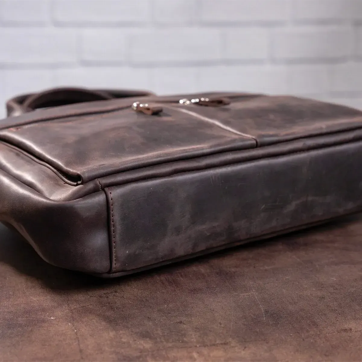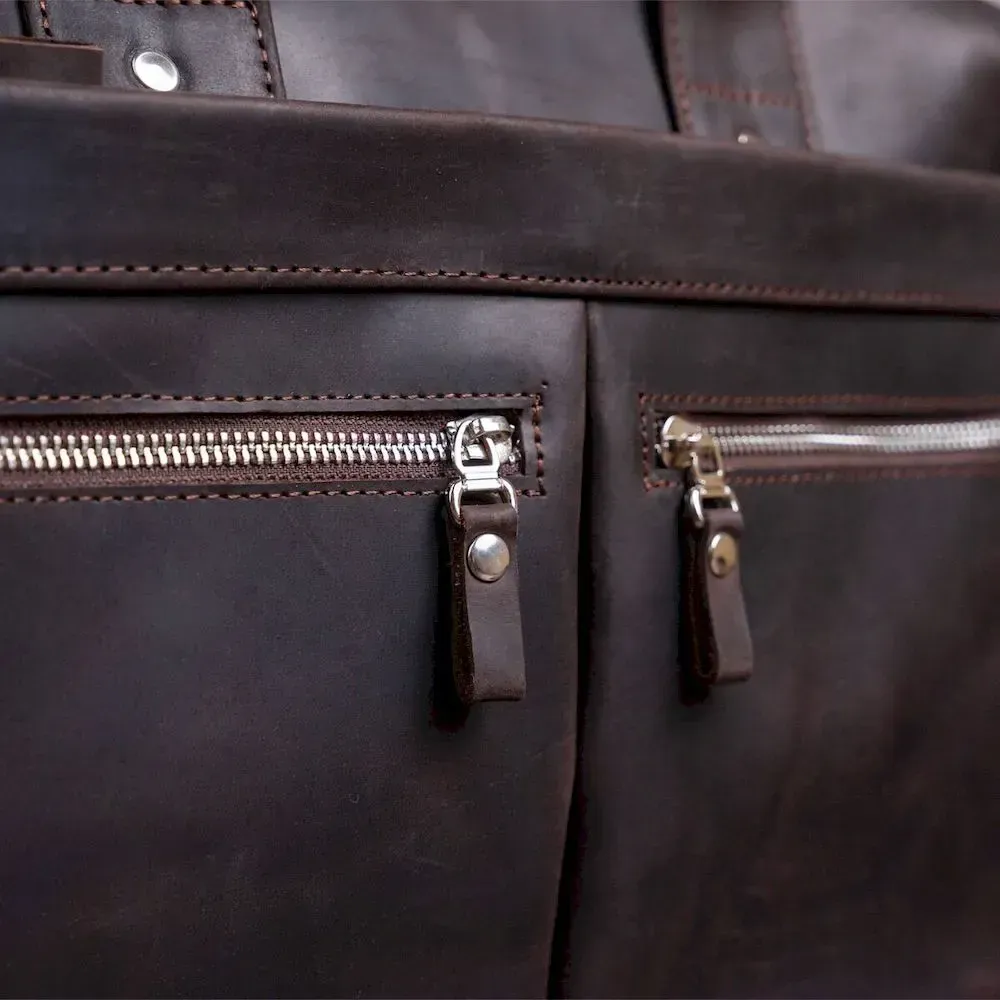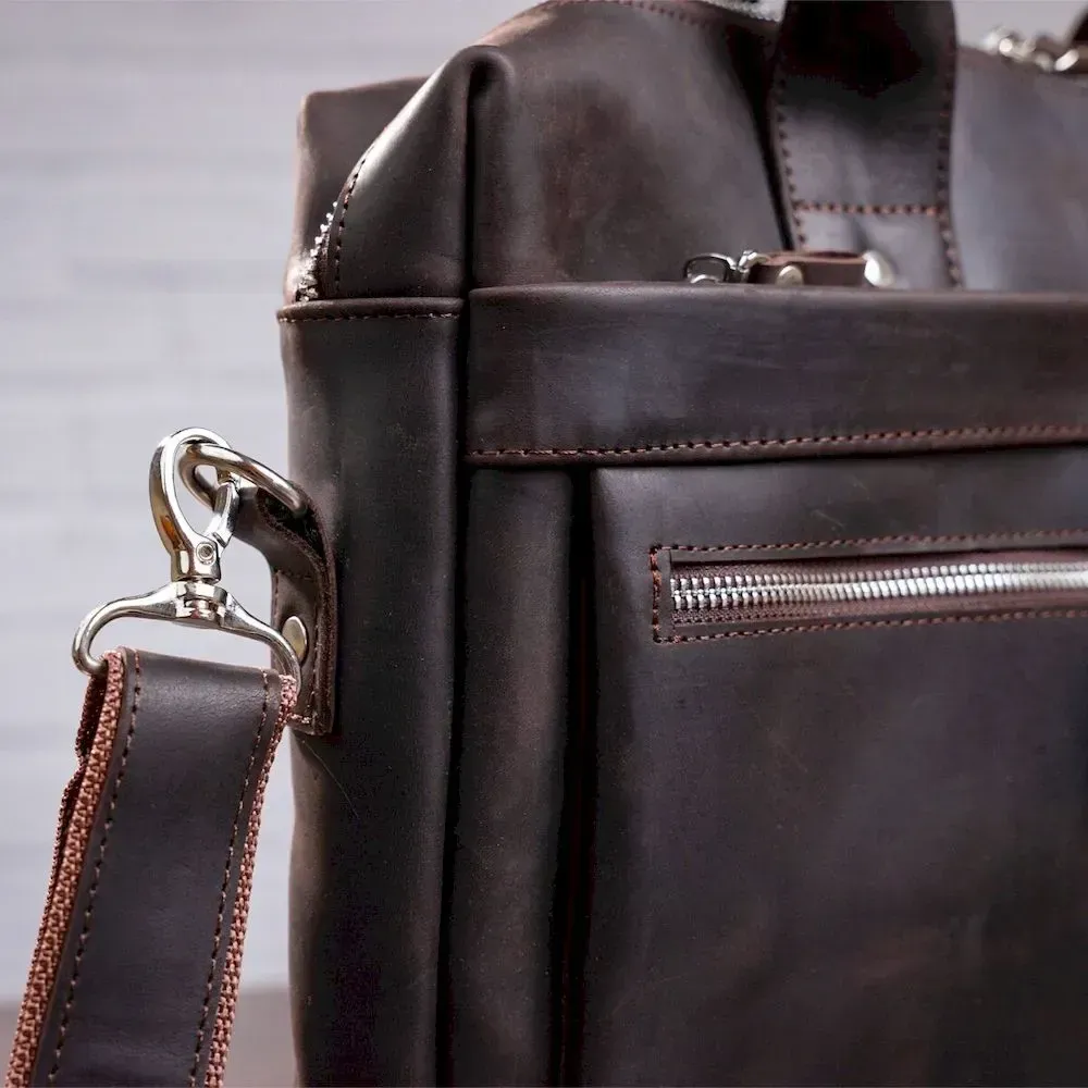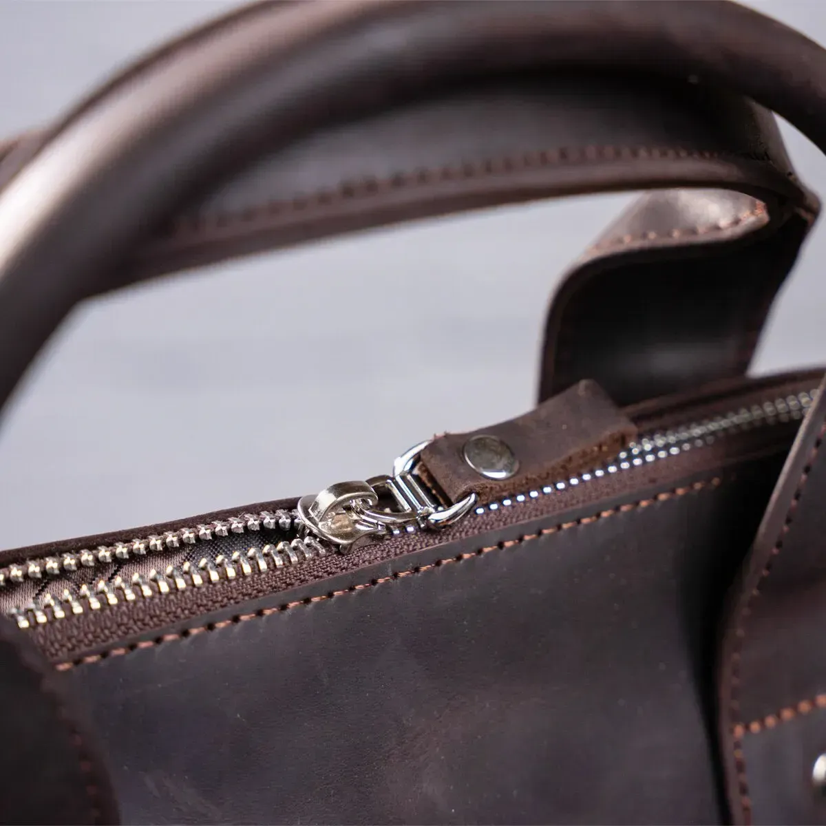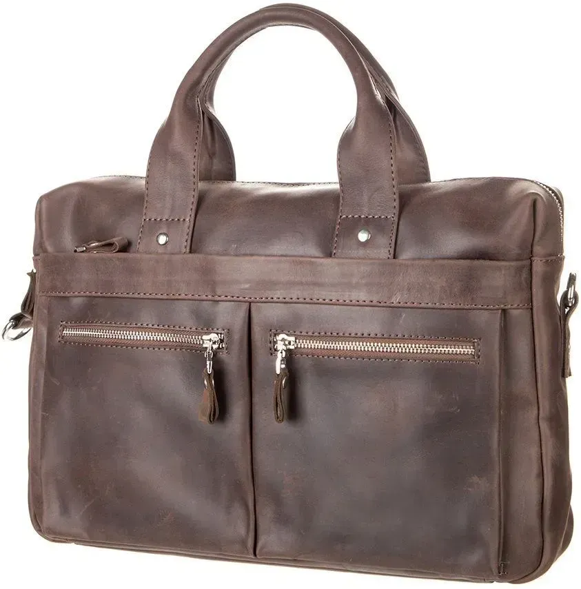 Ексклюзивна та надійна сумка  ;виготовлена з натуральної шкіри, яка зветься «crazy horse», для неї характерні потертості та неоднорідність забарвлення . Виріб надійно прошито надміцною ниткою, все зроблено якісно та акуратно. На лицьовій стороні сумки розташовані дві невеликі симетричні кишені на блискавці, а також відділення на блискавці. На задній зовнішній стороні знаходиться прихована кишеня на блискавці. Основне відділення закривається блискавкою кольору срібла. Переносити цей аксесуар можна в руці, а також через плече за допомогою плечового ременя яким укомплектована сумка.