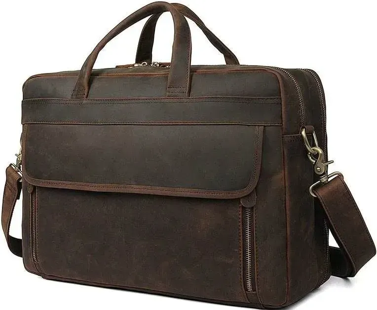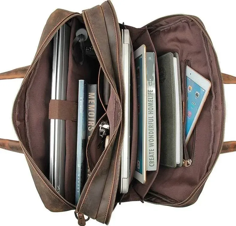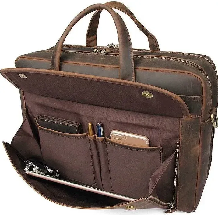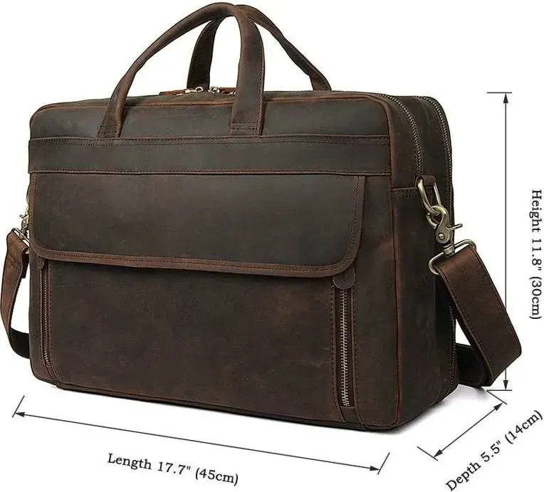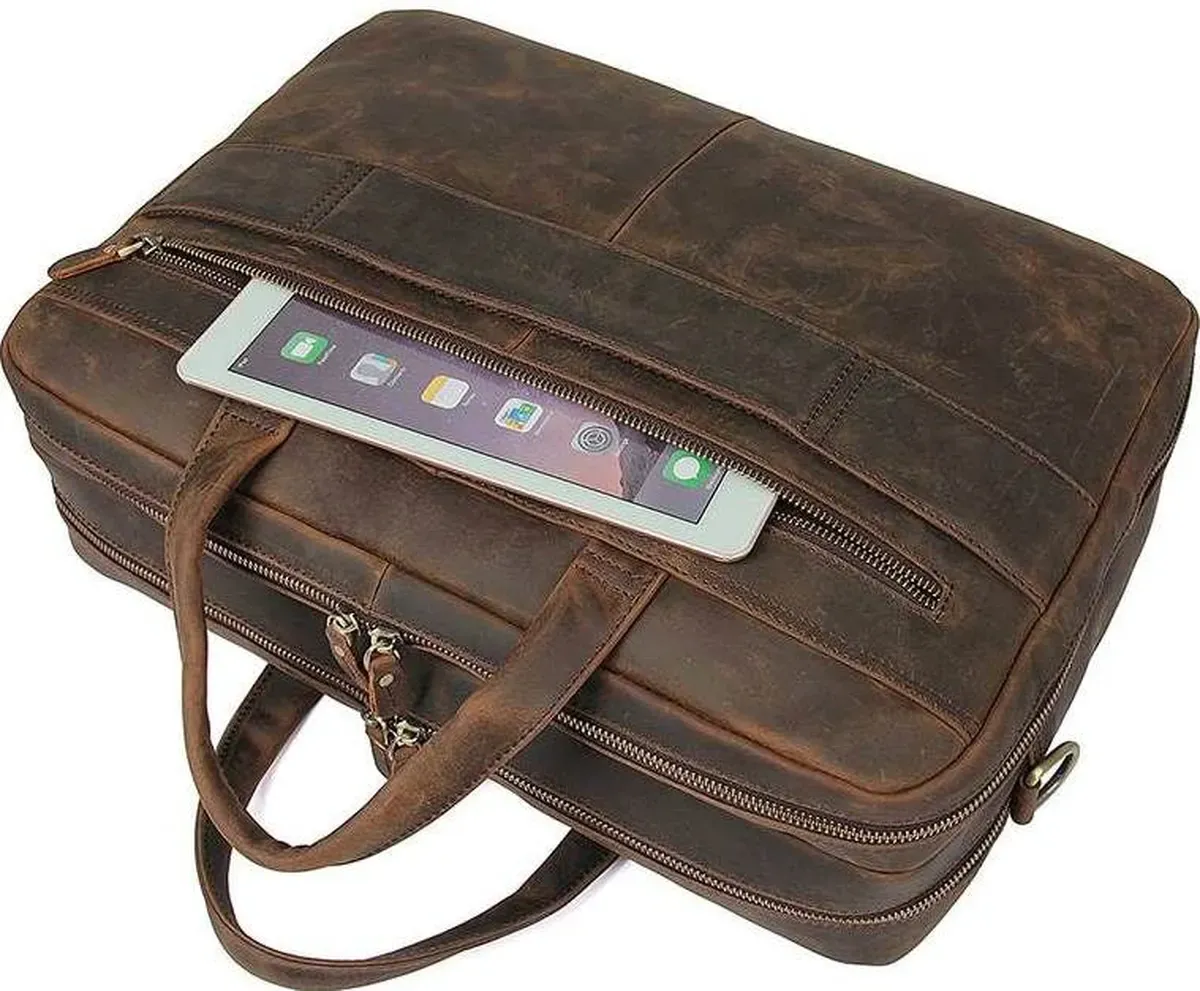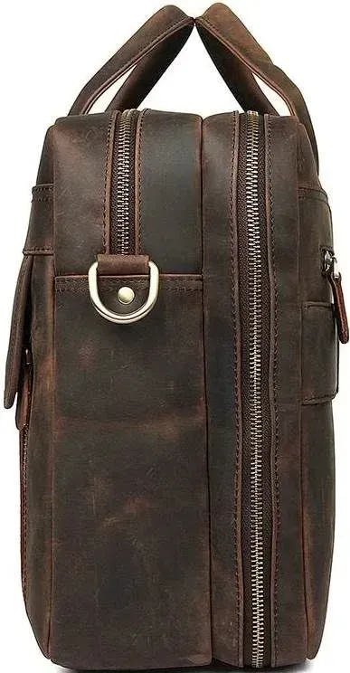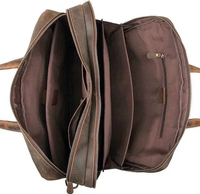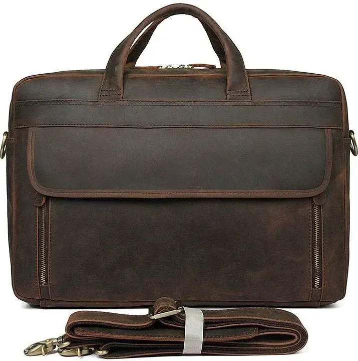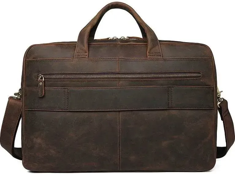 Практична та функціональна сумка коричневого кольору, з якісної натуральної вінтажної шкіри. У таку сумку з легкістю поміщається ноутбук із діагоналлю 17". Колір фурнітури: латунь. На лицьовій стороні знаходиться велика дизайнерська накладна кишеня на двох магнітних кнопках, в якій знаходяться 2 слоти для ручок і 2 nbsp; накладні кишені. На задній зовнішній стороні розташоване велике відділення на блискавці, а також шкіряний пришитий ремінь, який можна повісити на висувну ручку валізи. Підкладка виконана з міцного текстильного матеріалу темно-коричневого кольору. Сумка володіє двома місткими автономними відділеннями, які закриваються на блискавці.