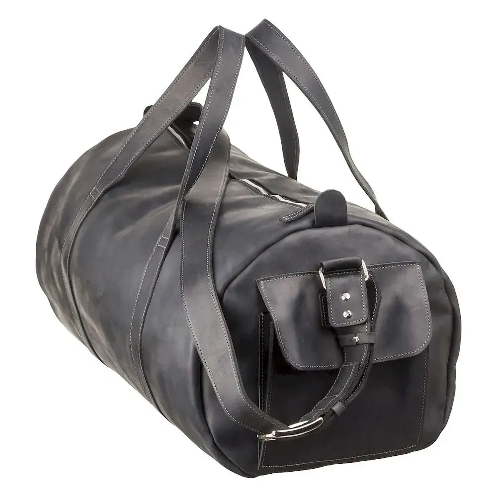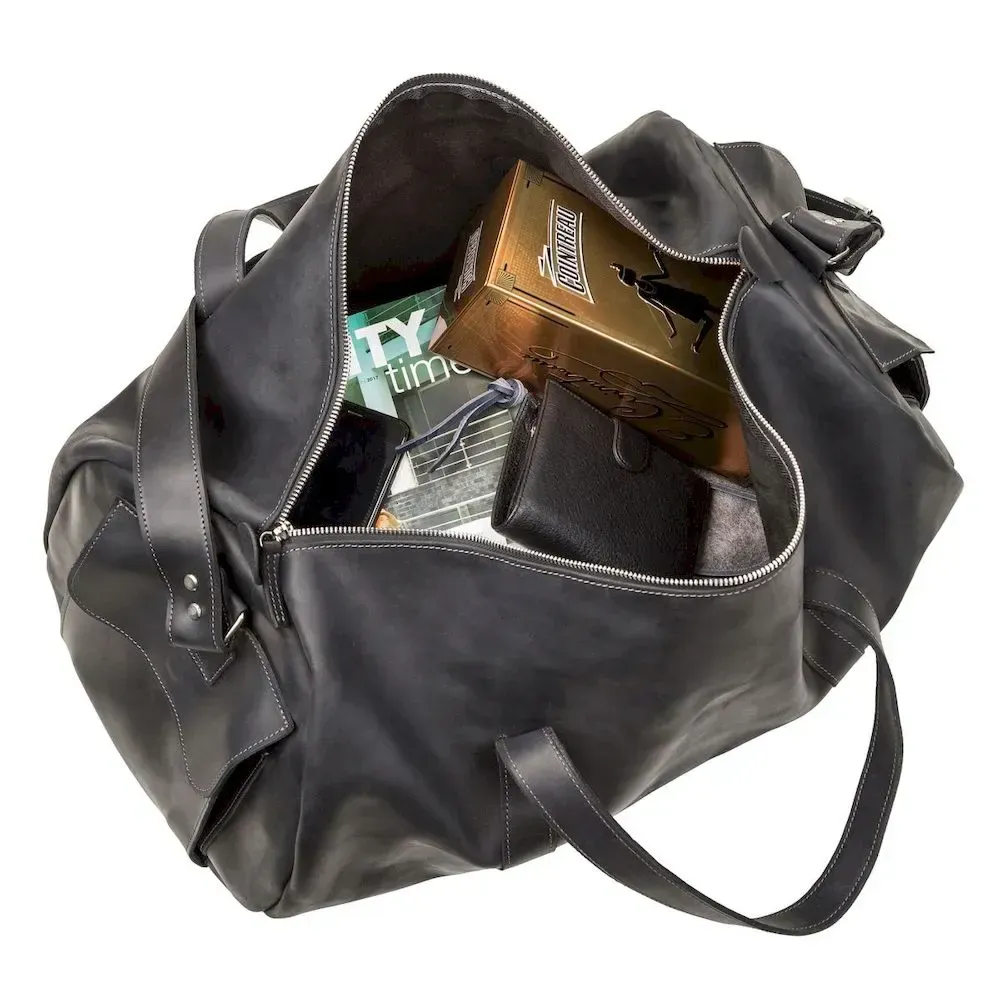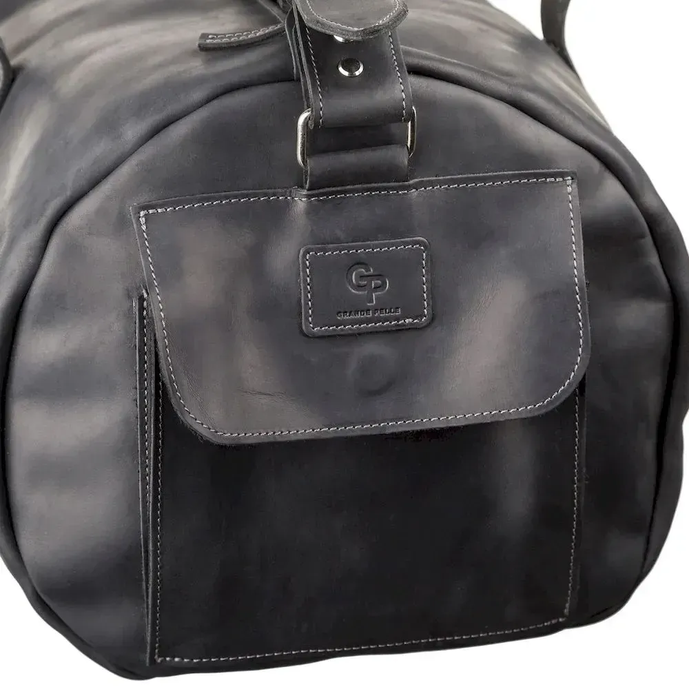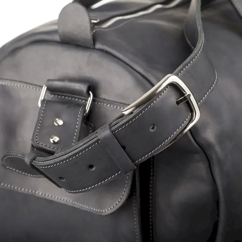 Міцна чорна дорожня сумка виконана виключно з цільної товстої, якісної, вінтажної шкіри, характерними ознаками якої, є: неоднорідність і потертості, які надають виробу вишуканого, індивідуального вигляду. Сумка поєднує мінімалізм і функціональність. Вся фурнітура вищої якості, в сумці немає картону, немає підкладочних тканин, форма виробу зберігається завдяки пружності цільної шкіри. Завдяки цьому виріб має високу зносостійкість та благородний зовнішній вигляд.