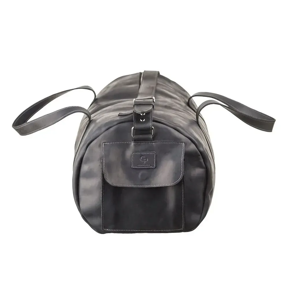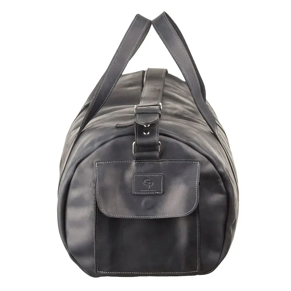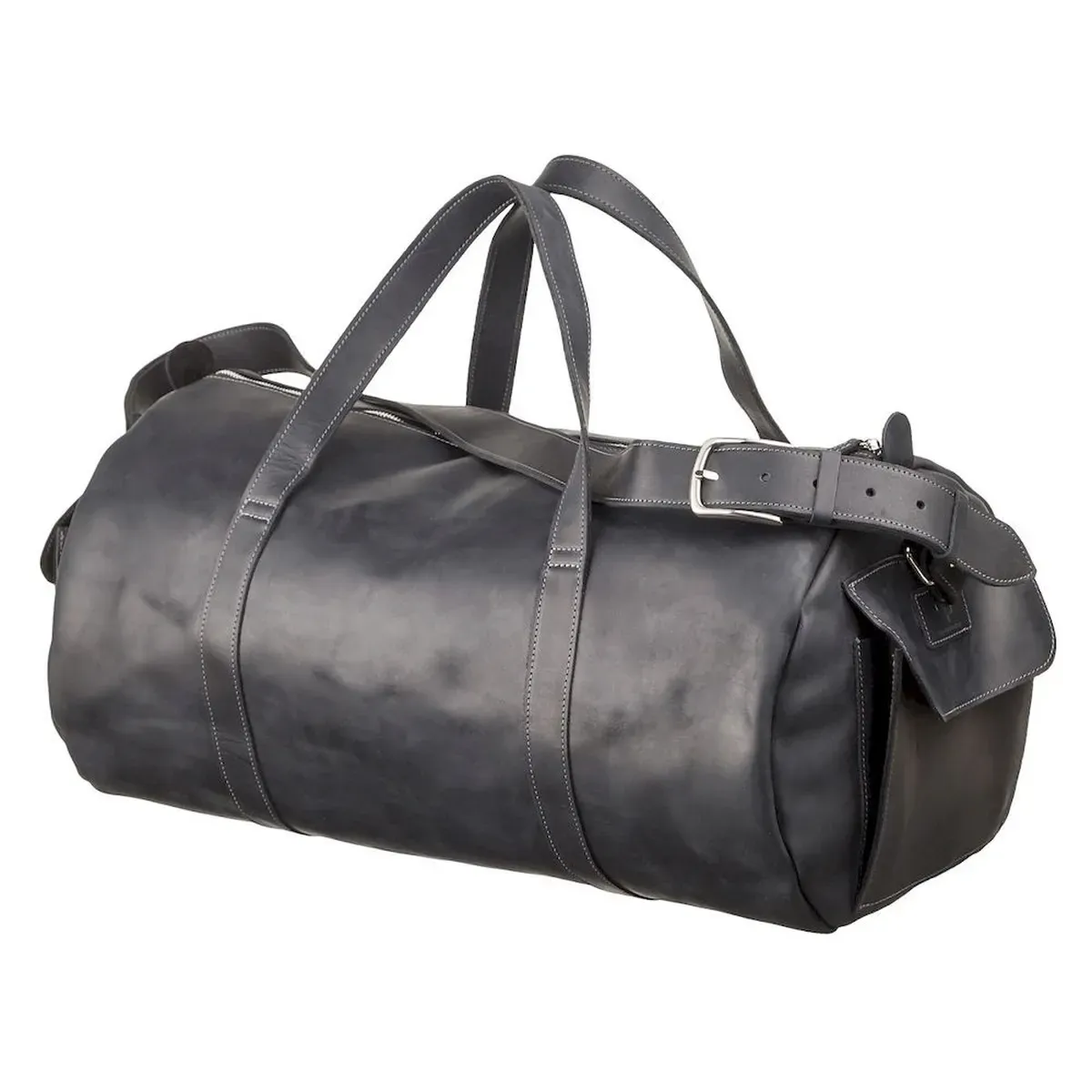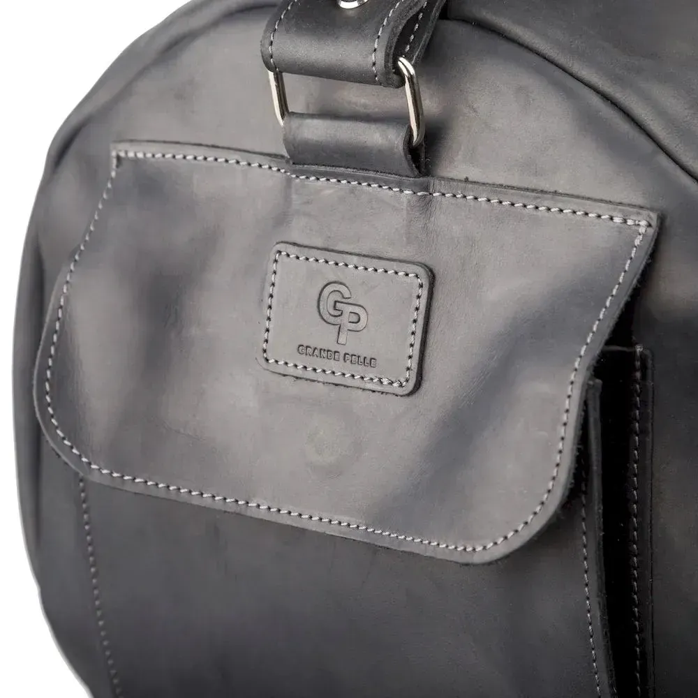 Міцна чорна дорожня сумка виконана виключно з цільної товстої, якісної, вінтажної шкіри, характерними ознаками якої, є: неоднорідність і потертості, які надають виробу вишуканого, індивідуального вигляду. Сумка поєднує мінімалізм і функціональність. Вся фурнітура вищої якості, в сумці немає картону, немає підкладочних тканин, форма виробу зберігається завдяки пружності цільної шкіри. Завдяки цьому виріб має високу зносостійкість та благородний зовнішній вигляд.