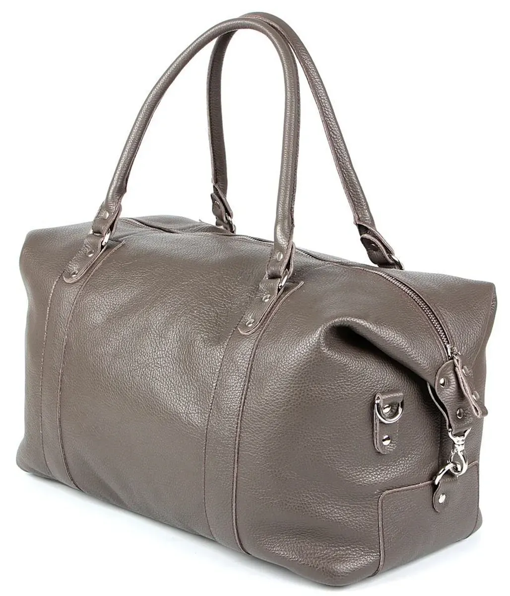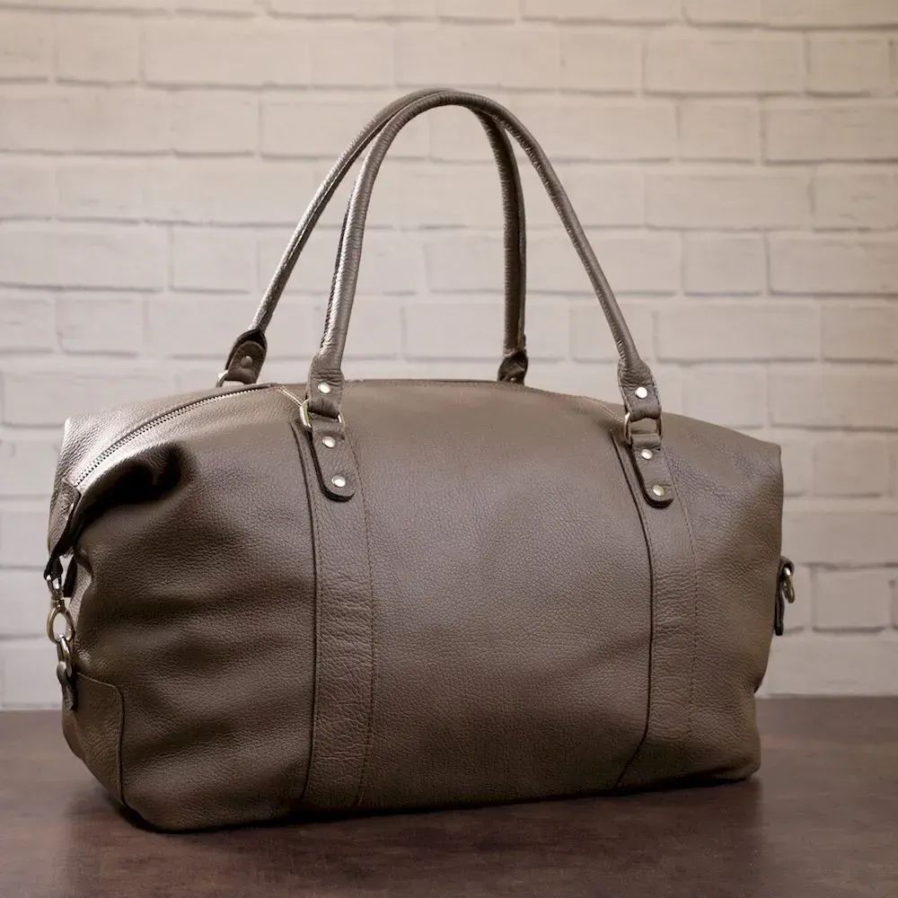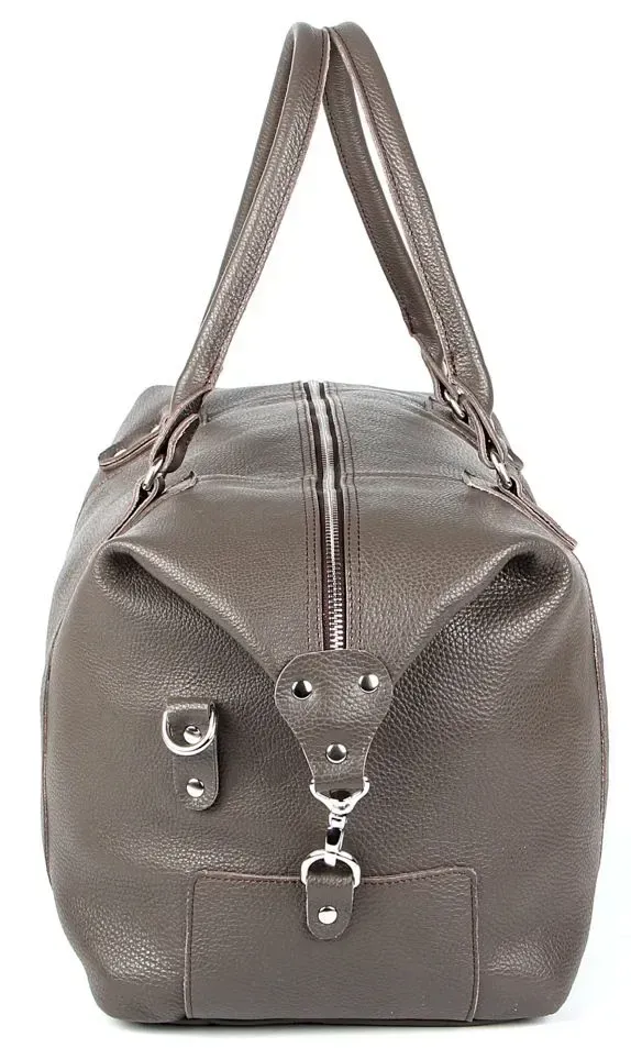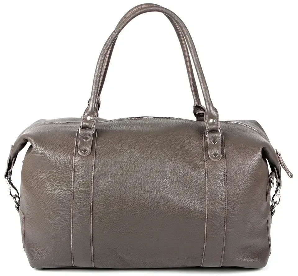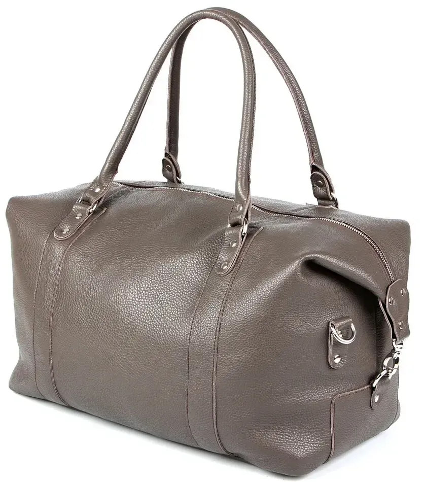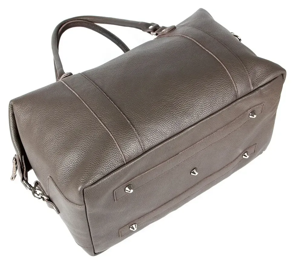 Сверхпрочная дорожная сумка из натуральной высококачественной кожи. Аксессуар выполнен в сером цветовом решении. Цвет фурнитуры: серебро. Дно сумки защищено металлическими ножками. Изделие может быть использовано для недлительного уикенда или похода в спортзал. Аксессуар упакован в текстильный пылезащитный чехол.
