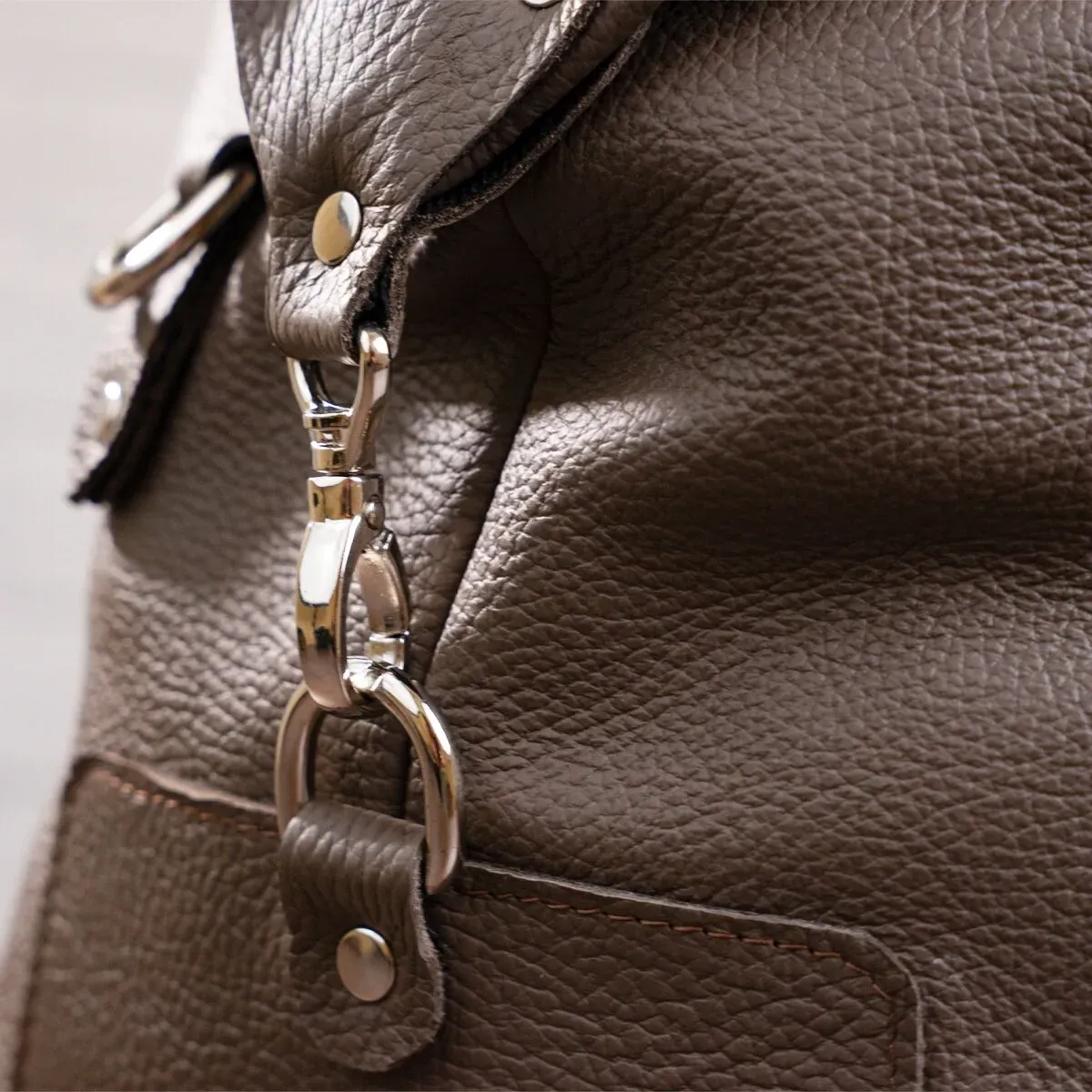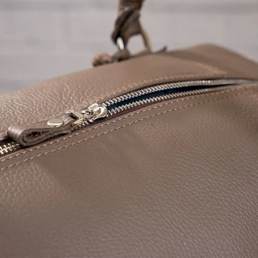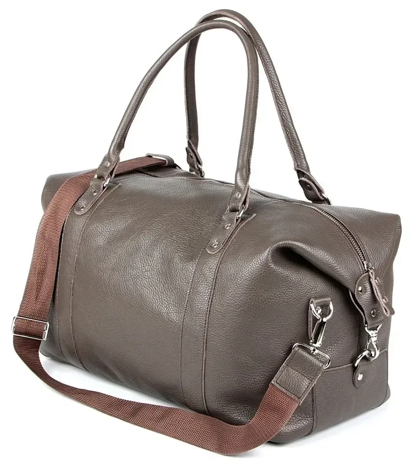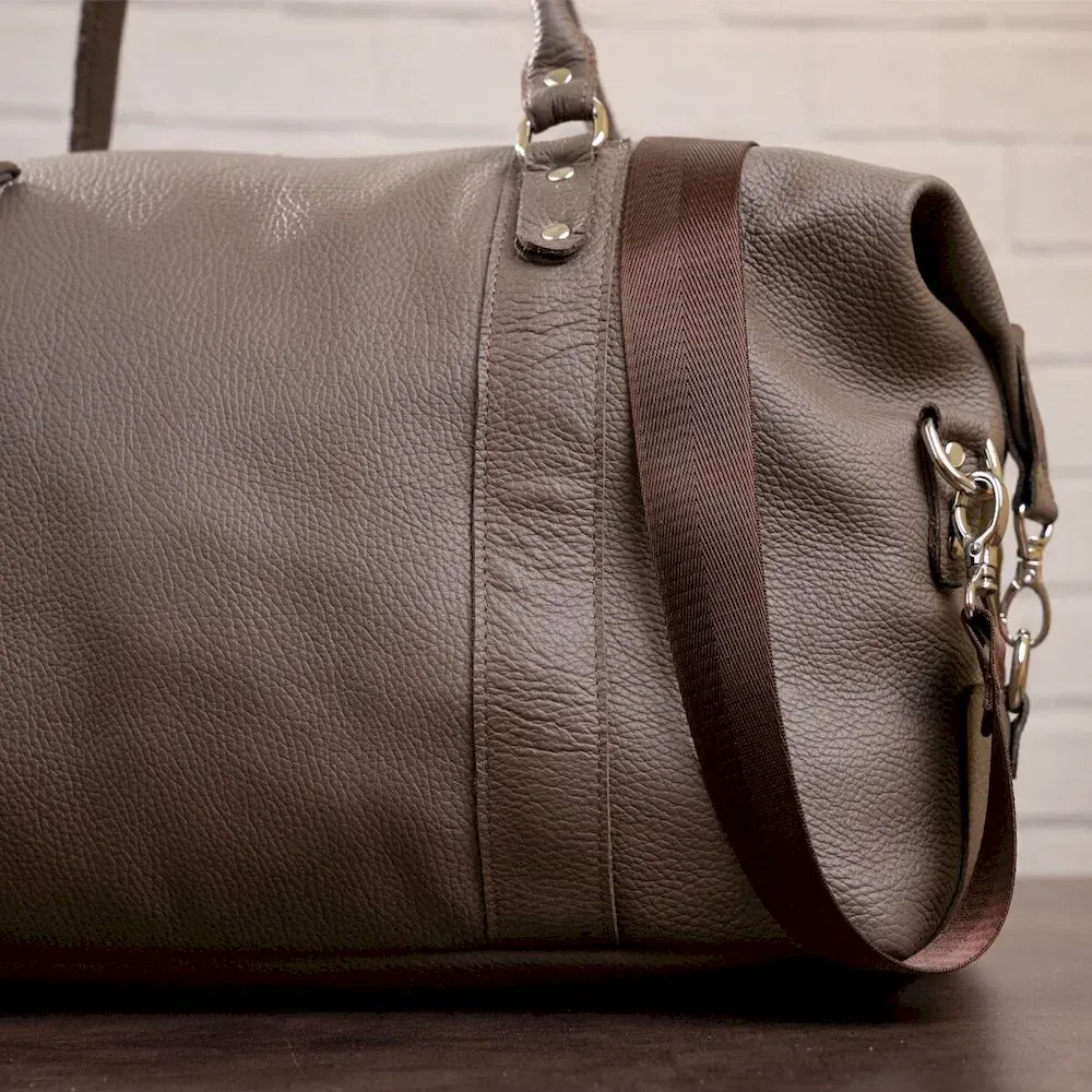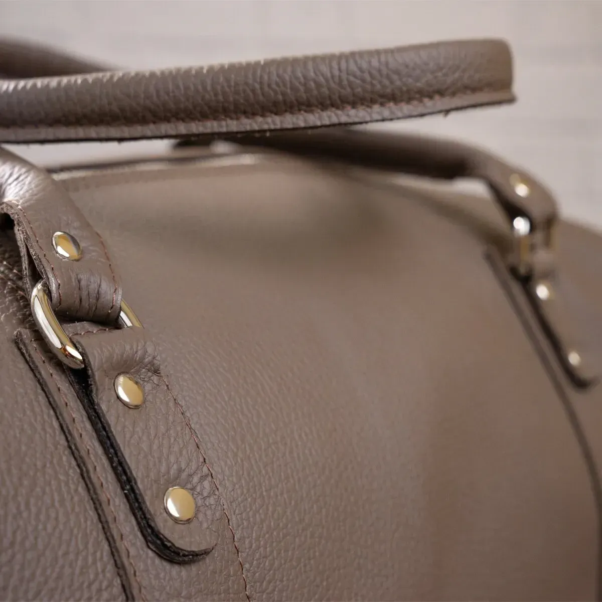 Сверхпрочная дорожная сумка из натуральной высококачественной кожи. Аксессуар выполнен в сером цветовом решении. Цвет фурнитуры: серебро. Дно сумки защищено металлическими ножками. Изделие может быть использовано для недлительного уикенда или похода в спортзал. Аксессуар упакован в текстильный пылезащитный чехол.