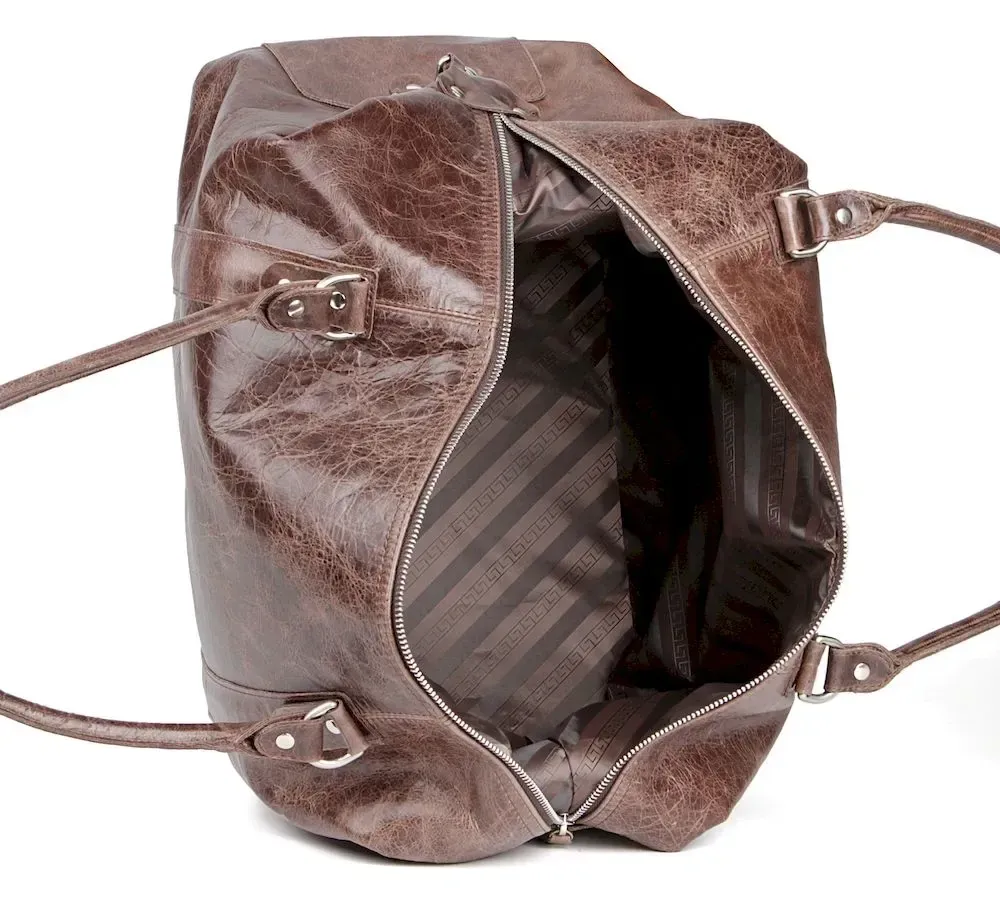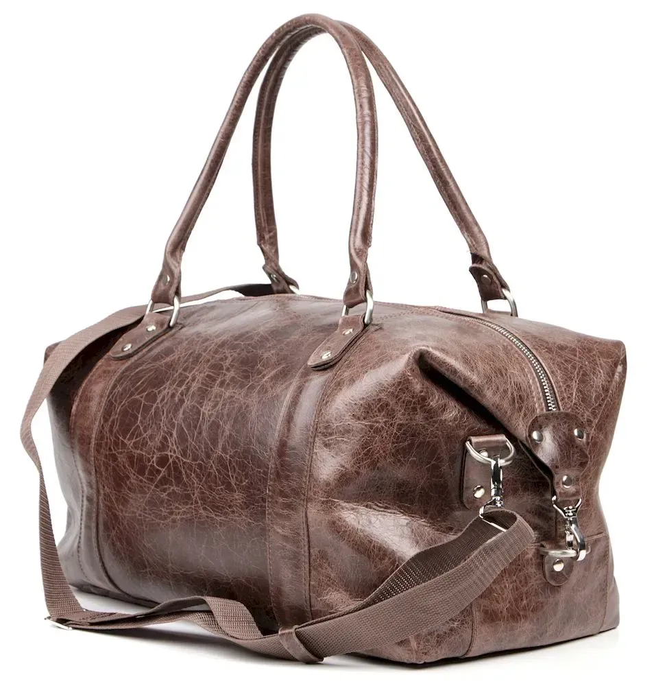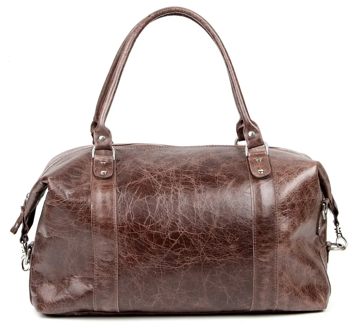 Отличная, вместительная спортивно-дорожная сумка. Аксессуар изготовлен из высококачественной натуральной кожи с винтажной фактурой. Цвет фурнитуры: серебро. Переносить такой аксессуар можно на плече (в комплекте съемный плечевой ремень), а также в руке при помощи 2-х удобных кожаных ручек.