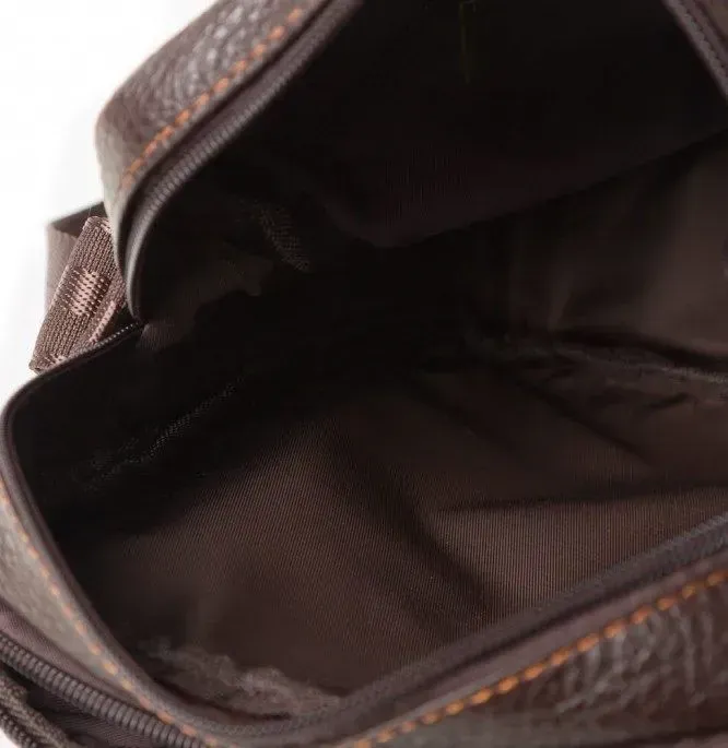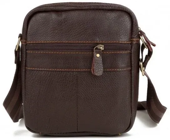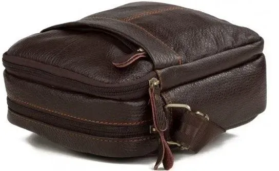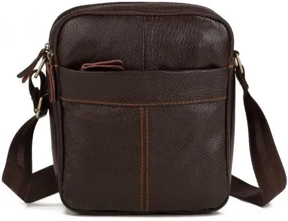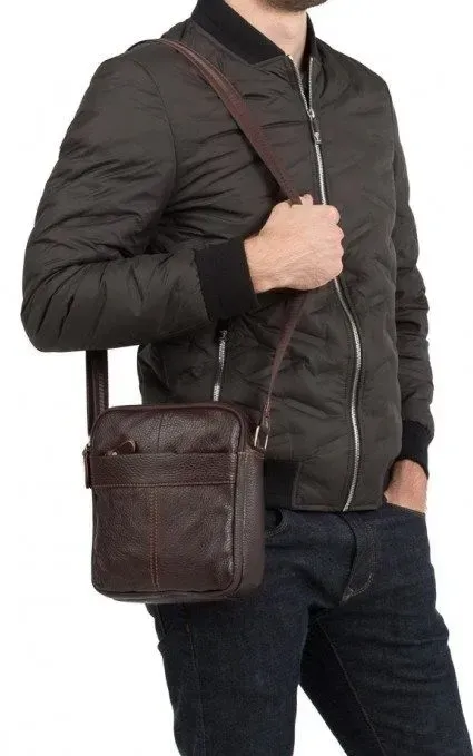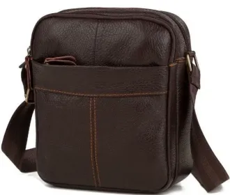 Сучасна чоловіча сумка через плече. Аксесуар виконаний із натуральної високоякісної зернистої шкіри. Колір фурнітури: срібло. Сумка надійно прошита міцною коричневою ниткою. Шви – рівні, акуратні. Відмінний варіант для подарунка, рідним та близьким людям.