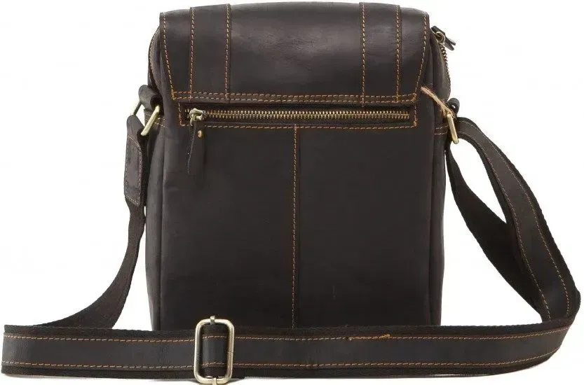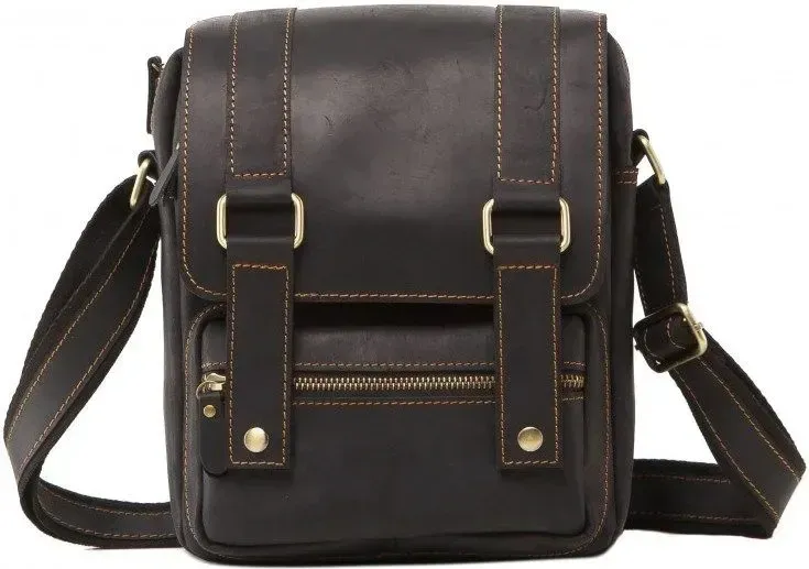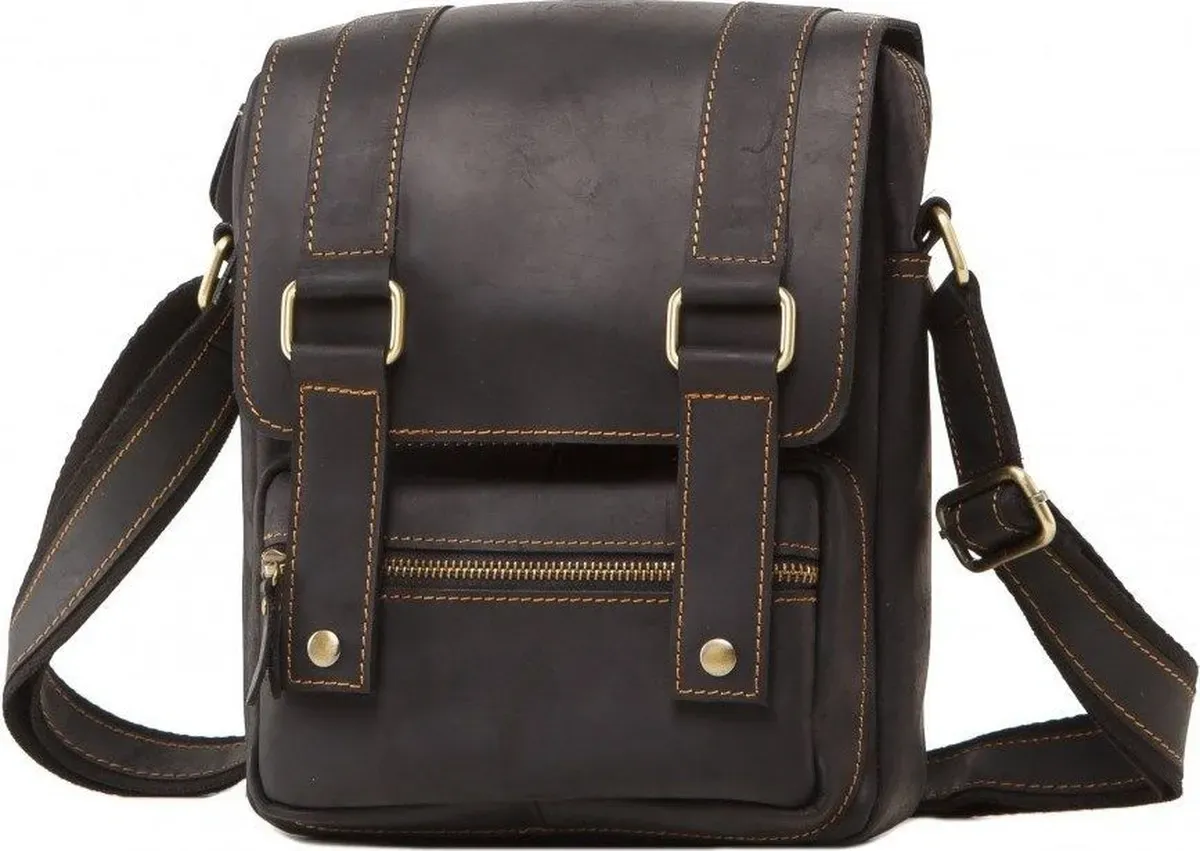 Міцна чорна шкіряна сумка з натуральної вінтажної шкіри, іноді її називають «crazy horse» або просто «crazy», для неї характерні потертості, штучні подряпини та неоднорідність забарвлення. Через це вироби з такої шкіри довше мають презентабельний зовнішній вигляд. Аксесуар обладнаний надійною металевою фурнітурою та міцним текстилем для внутрішньої підкладки. У таку сумку легко помістяться документи, гаманець, телефон, планшет, а також всі необхідні речі.