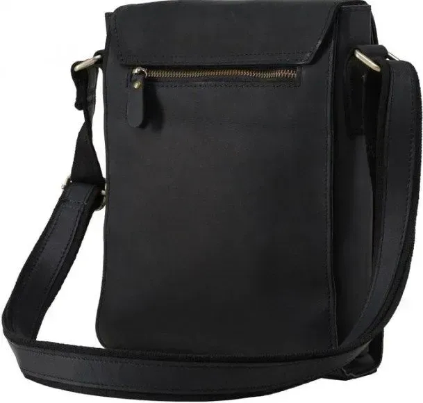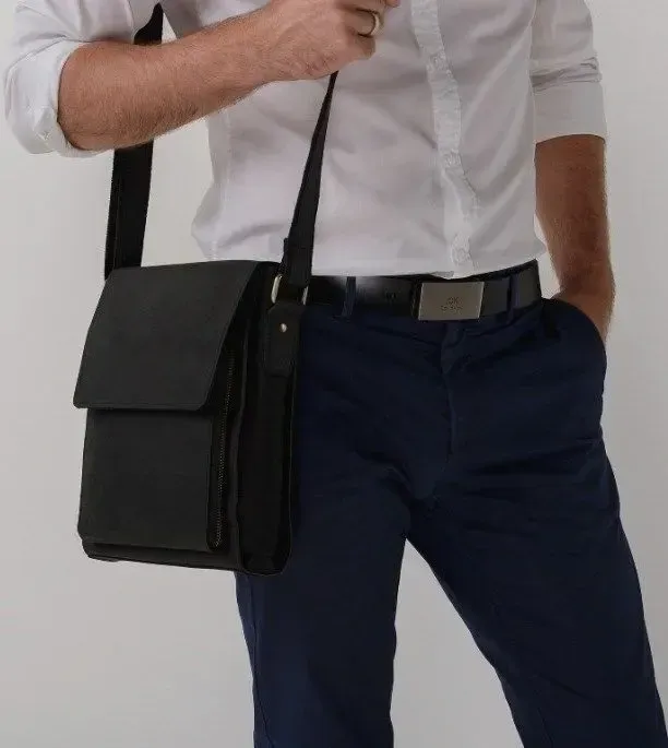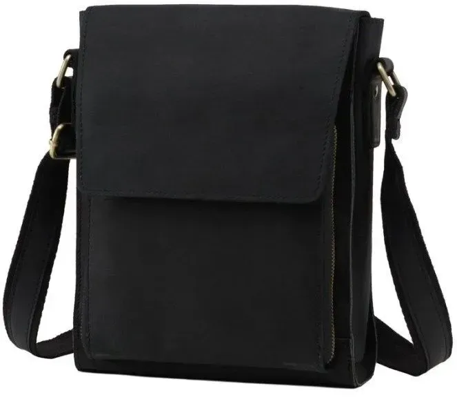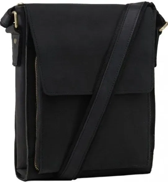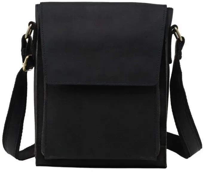 Чорна шкіряна сумка з натуральної вінтажної шкіри, іноді її називають «crazy horse» або просто «crazy», для неї характерні потертості, штучні подряпини та неоднорідність забарвлення. Через це вироби з такої шкіри довше мають презентабельний зовнішній вигляд. Аксесуар обладнаний надійною металевою фурнітурою та міцним текстилем для внутрішньої підкладки. У таку сумку легко помістяться документи, гаманець, телефон, планшет, а також всі необхідні речі.