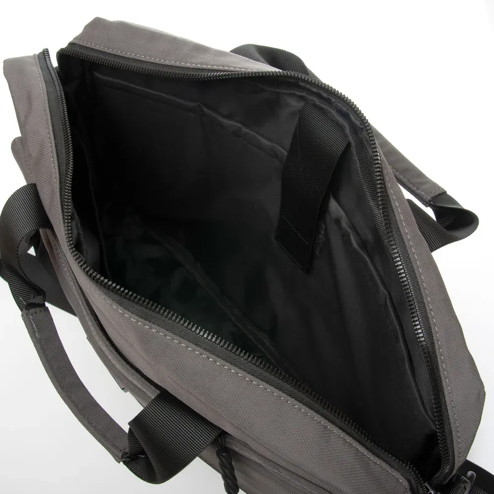 Одно основное отделение закрывается на молнию. Внутри есть карман для ноутбука, двойной открытый боковой карман. Снаружи сумки на фасаде расположены два больших кармана: один на молнии, а второй на застежке-липучке под клапаном. На обратной стороне сумки есть вместительный карман на молнии и крепление на ручку чемодана.