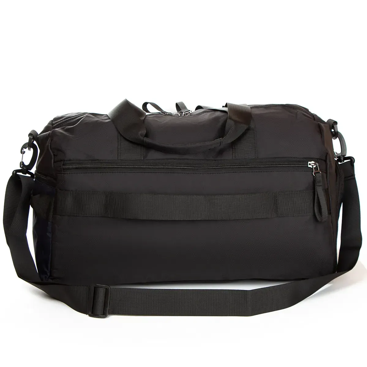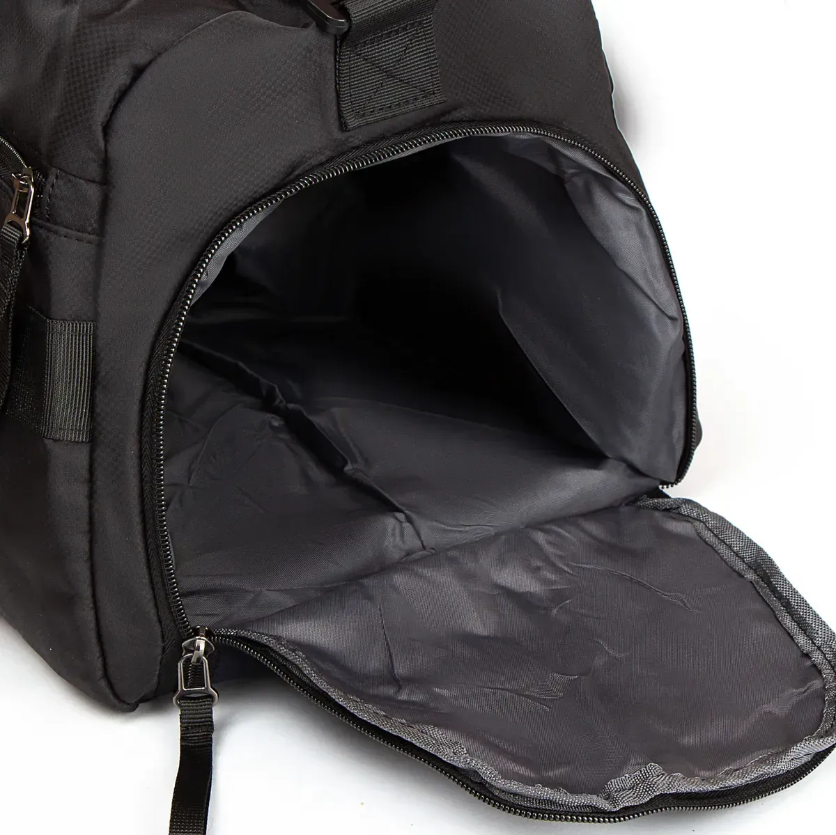 Чоловіча дорожня/спортивна сумка Lanpad. Одне відділення закривається на блискавку. Усередині відділення є кишеня на блискавці та подвійна відкрита кишеня. На фасаді знаходяться дві кишені на блискавці. На звороті розташована велика кишеня на блискавці з герметичною підкладкою. На торцях сумки розташовані кишеня для взуття та кишеня на блискавці.