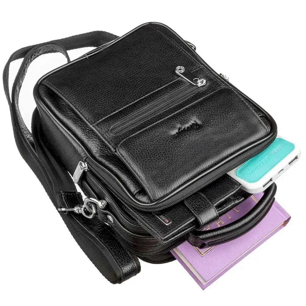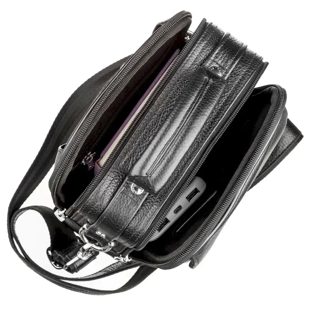 Стильна компактна та одночасно містка сумка виконана з натуральної шкіри з текстурною зернистістю. Модель легко вмістить телефон, ключі, сигарети, документи. Підійде для щоденного використання. Має витриманий, елегантний чоловічий дизайн, а висока якість забезпечить вам приємне та довге носіння. Фурнітура виготовлена із міцного металу сріблястого кольору. Блискавки кишень мають по 2 собачки. Відмінний варіант для подарунка чоловікові.