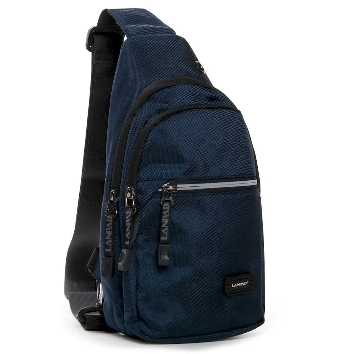 Чоловіча сумка Lanpad. Виготовлена із щільного матеріалу. Два відділення, що закриваються на блискавку. Усередині одного відділення є відкрита кишеня. На фасаді та на звороті знаходяться кишені на блискавці. Регульований ремінь, шириною 4см. можна переставляти на ліву/праву сторону.
