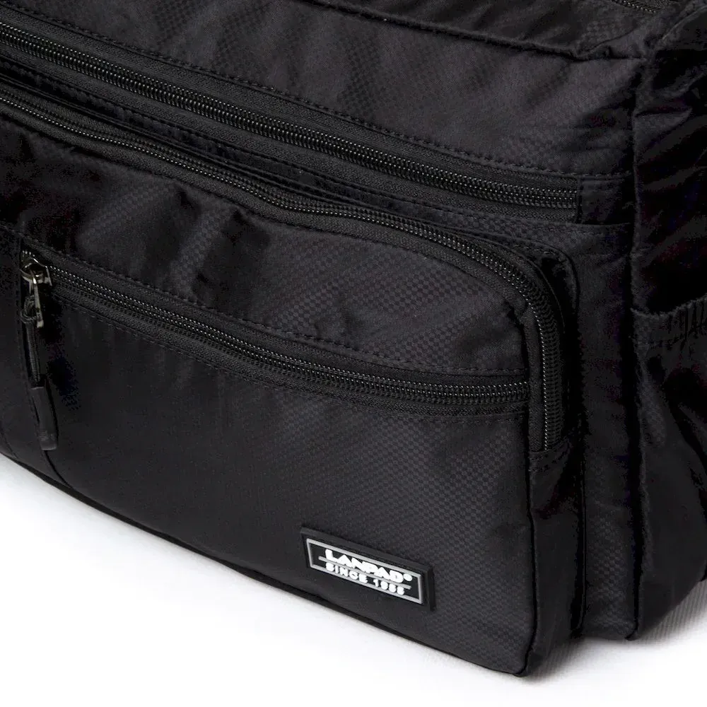 Чоловіча сумка Lanpad. Закривається на блискавку. Усередині знаходиться подвійне відділення, розділене перегородкою, кишеня на блискавці та відкрита подвійна кишеня. На фасаді та зворотному боці знаходяться місткі кишені на блискавці. На торцях сумки також розташовані відкриті кишені. Регульований плечовий ремінь, шириною 4см. Розмір (см) 33*17*25