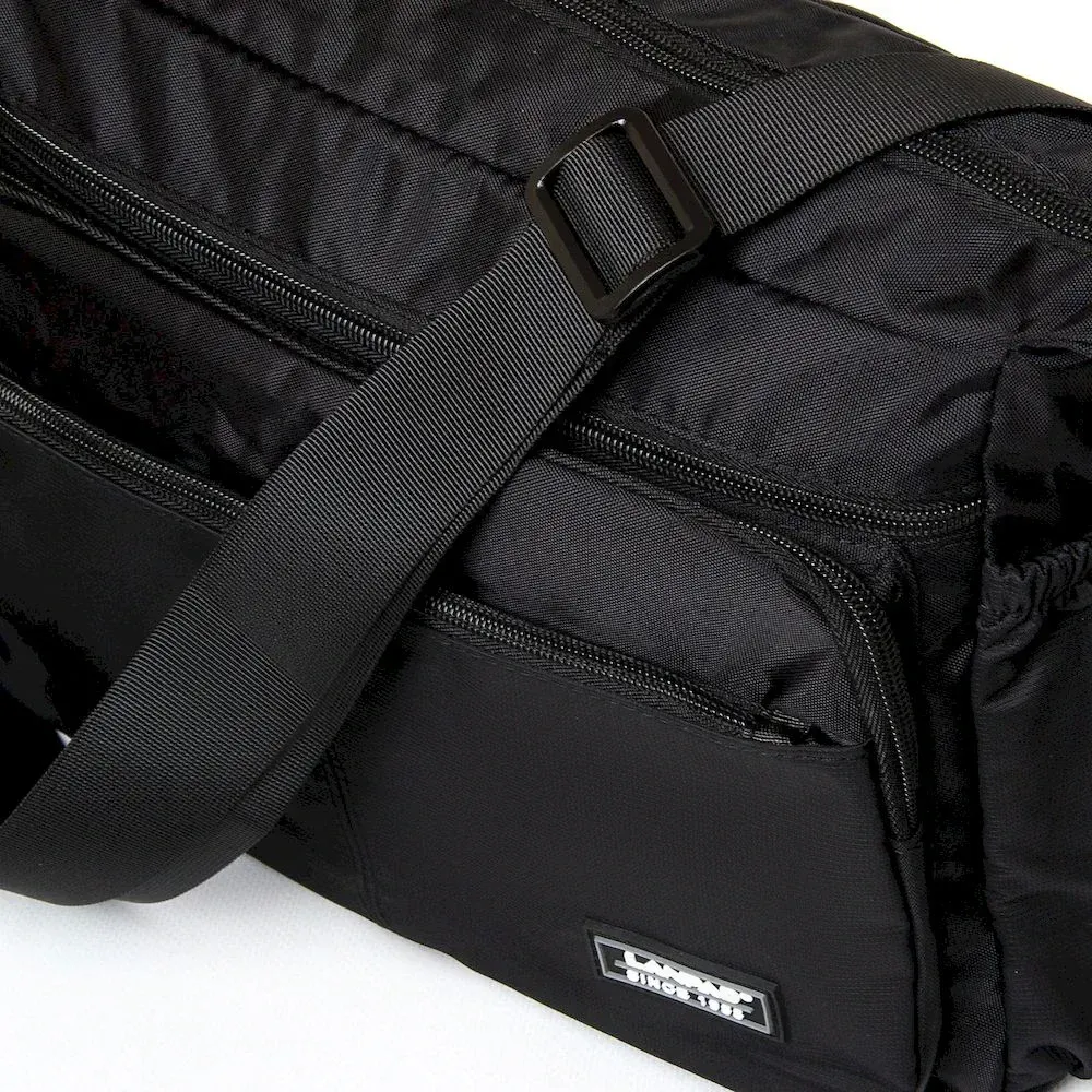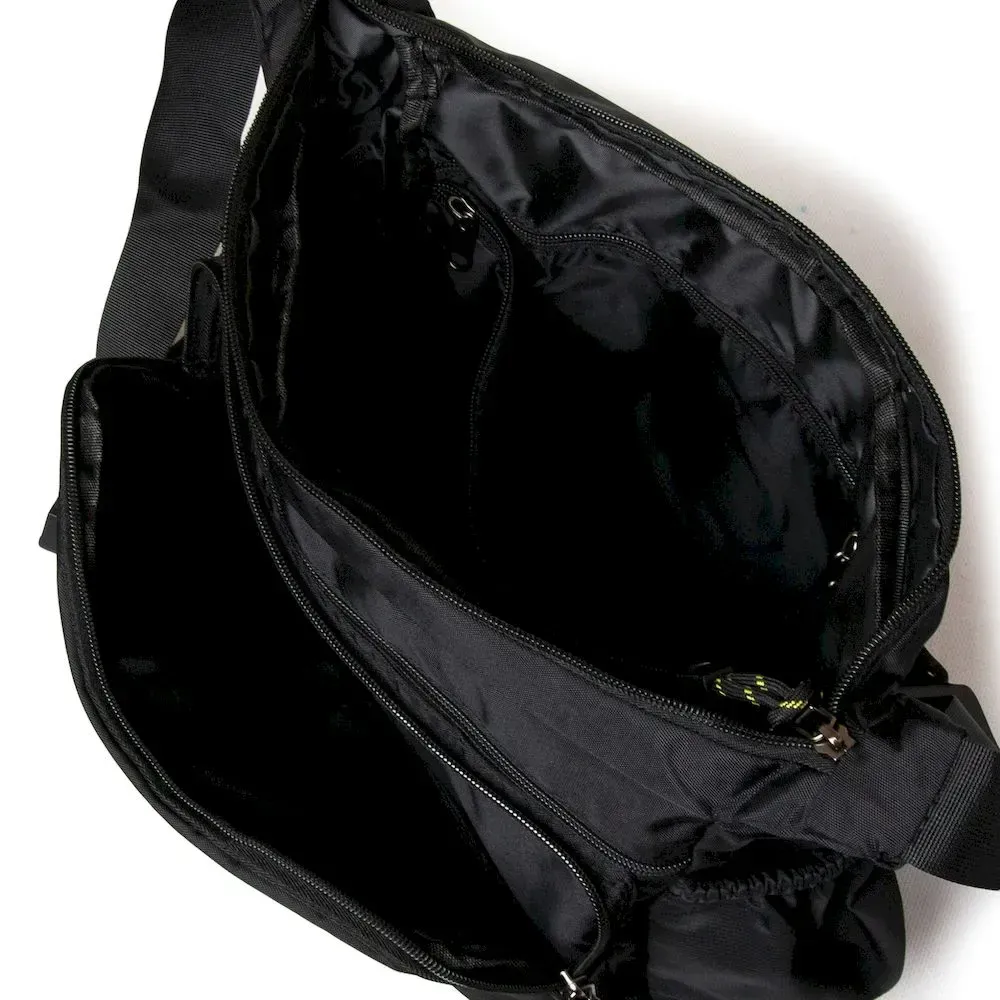 Чоловіча сумка Lanpad. Закривається на блискавку. Усередині знаходиться подвійне відділення, розділене кишенею-перегородкою на блискавці, кишеню на блискавці та відкриту подвійну кишеню. На фасаді та зворотному боці знаходяться місткі кишені на блискавці. На торцях сумки також розташовані відкриті кишені. Регульований плечовий ремінь, шириною 4см. Розмір (див.) 35*18*24
