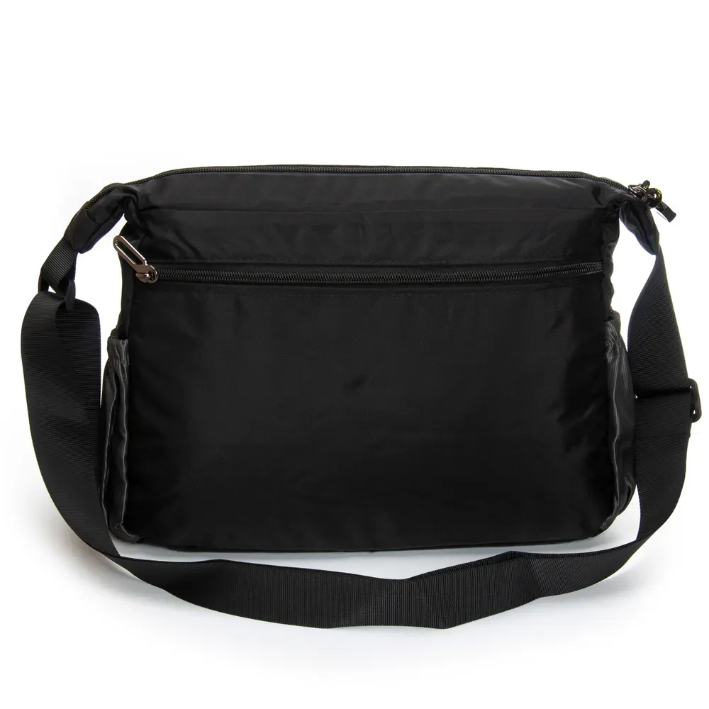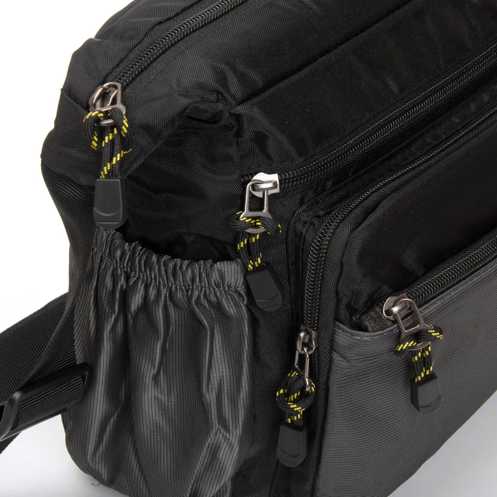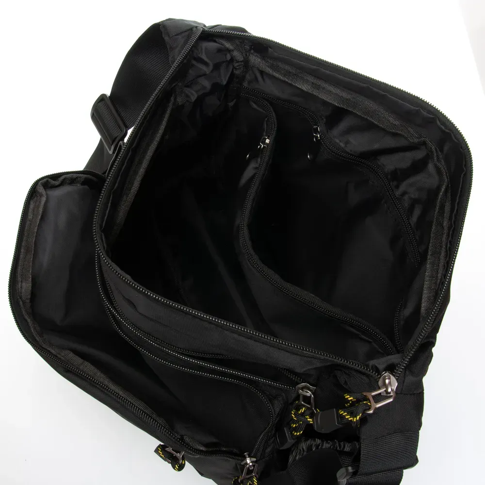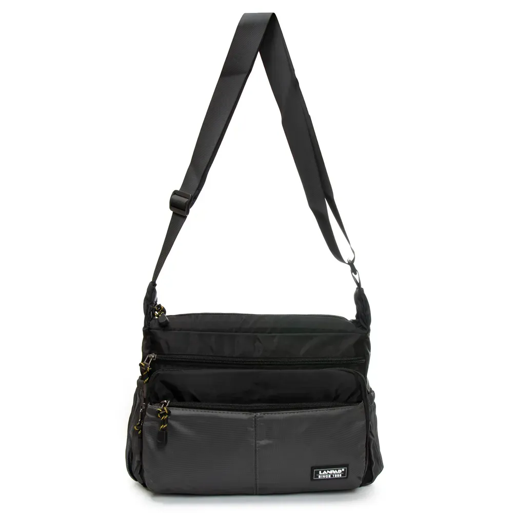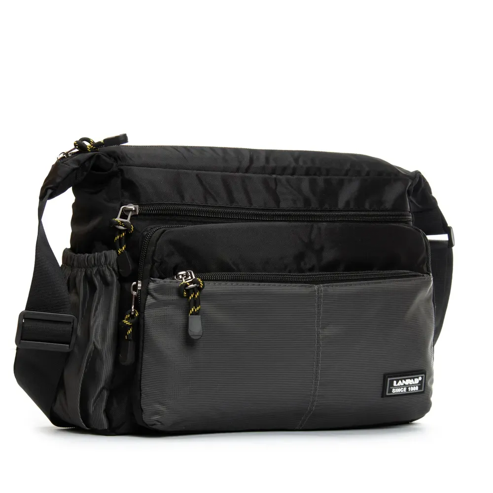Мужская сумка Lanpad. Закрывается на молнию. Внутри находится двойное отделение, разделенное карманом-перегородкой на молнии, карман на молнии и открытый двойной карман. На фасаде и обратной стороне находятся вместительные карманы на молнии. На торцах сумки также расположены открытые карманы. Регулируемый плечевой ремень, шириной 4см.