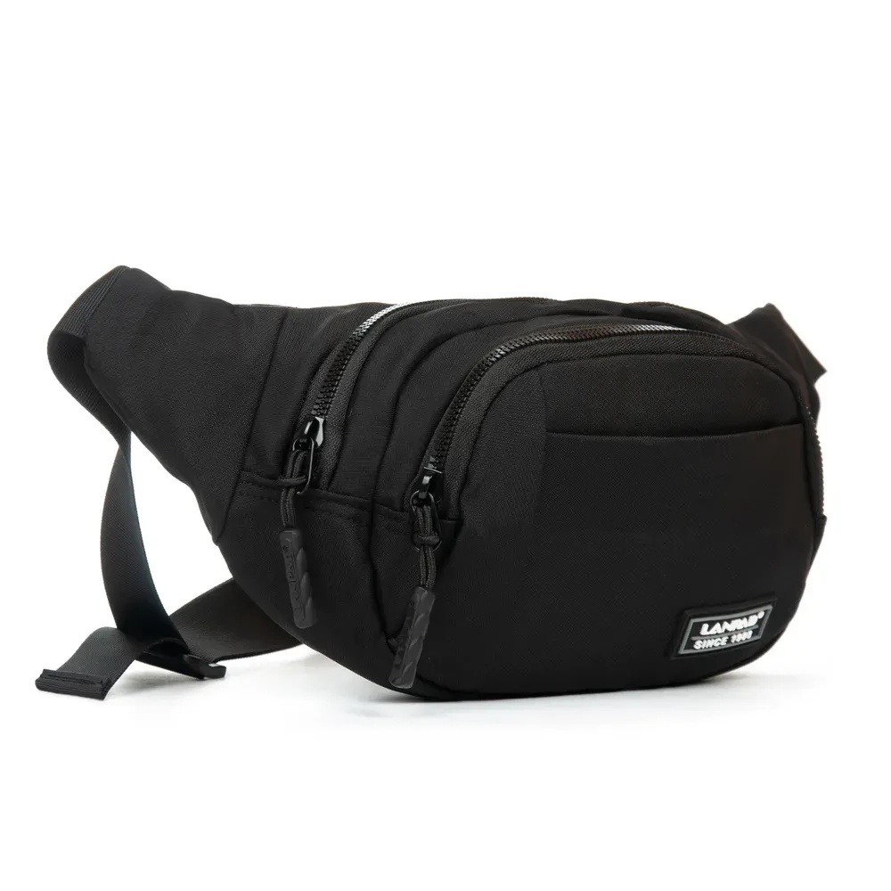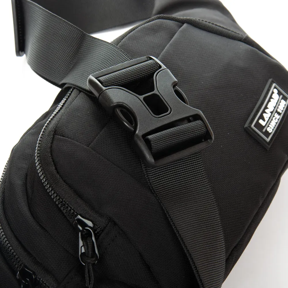 Мужская сумка на пояс/плечо Lanpad. Два отделения, закрываются на молнию. Внутри основного отделения есть боковой карман на молнии. На фасаде находится карман на застежке-липучке, а на обратной стороне сумки - на молнии.