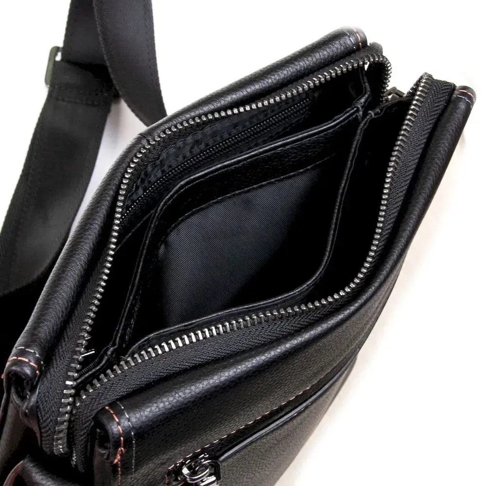 Чоловіча шкіряна сумка-планшет Bretton. Закривається на блискавку. Усередині знаходиться подвійне відділення, розділене кишенею-перегородкою, бічна кишеня на блискавці та відкрита кишеня. На фасаді сумки та на звороті розташовані великі кишені на блискавці. Регульований плечовий ремінь.