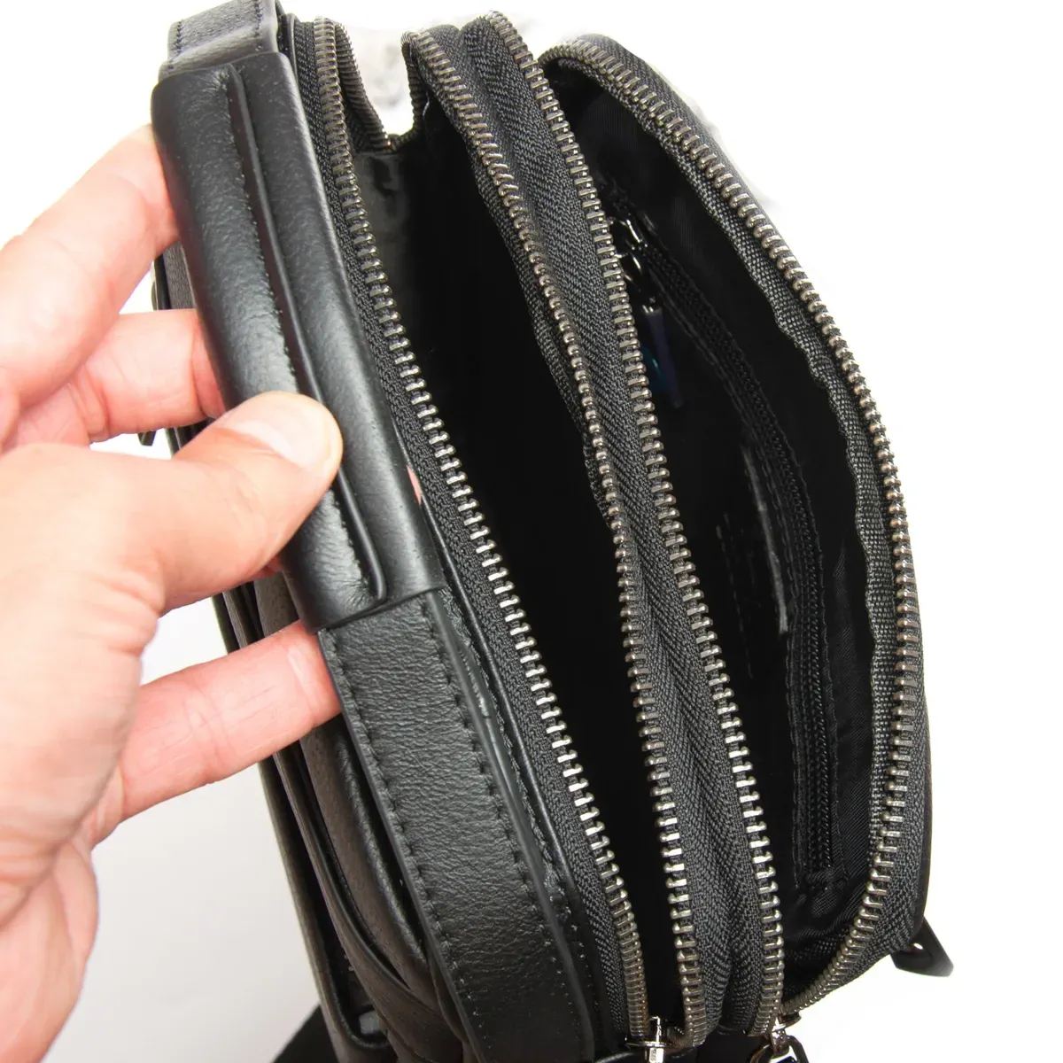 Изготовлена из мягкой натуральной кожи. Два отделения, закрываются на молнию. Внутри отделений есть открытый карман и боковой карман на молнии. На фасаде находятся два кармана на молнии и один на магнитной кнопке, а на обратной стороне сумки есть карман на молнии.