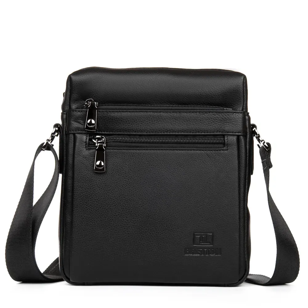 Мужская кожаная сумка-планшет Bretton. Изготовлена из натуральной мягкой кожи. Одно отделение, закрывается на молнию. Внутри есть открытый карман и боковой карман на молнии. На фасаде сумки и на обратной стороне расположены карманы на молнии. Регулируемый плечевой ремень.