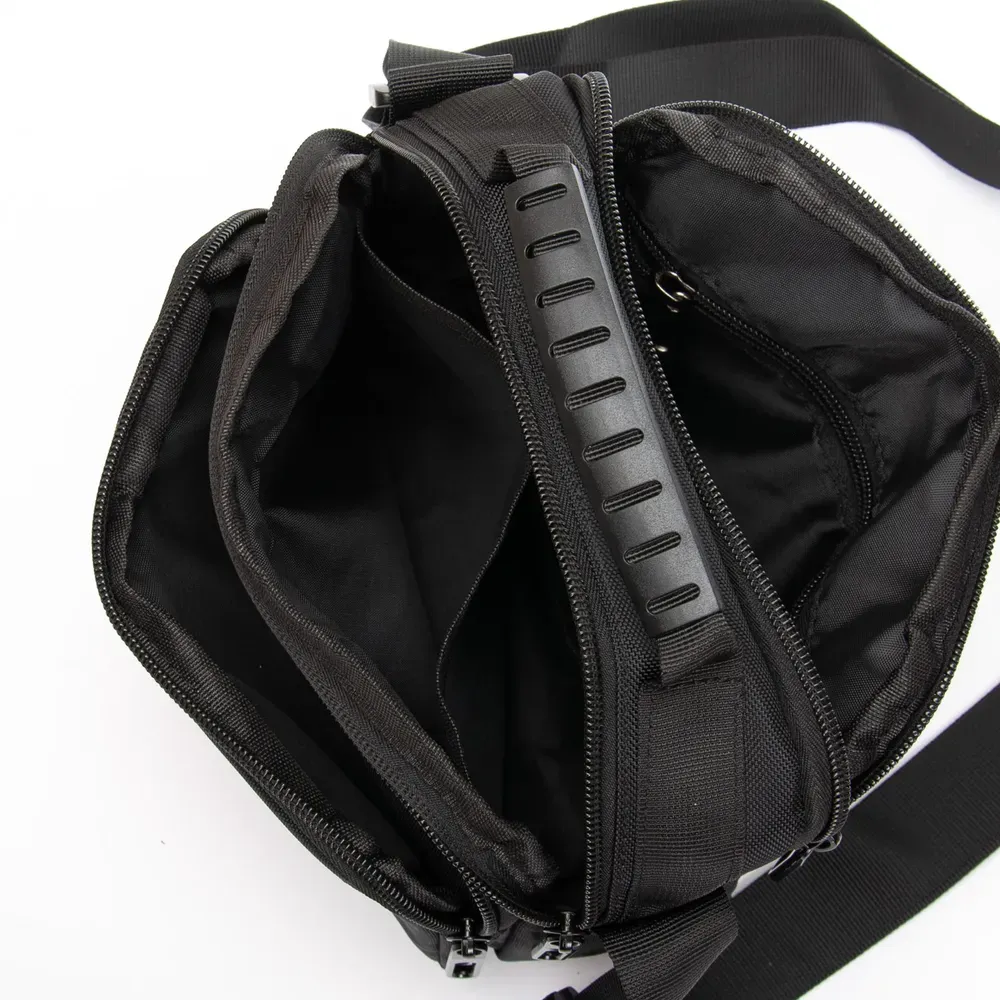 Мужская горизонтальная сумка кросс-боди Lanpad. Два отделения, закрываются на молнии. Внутри отделений есть боковой карман на молнии и открытый карман. На фасаде расположены 2 вместительных кармана на молнии, а на обратной стороне один большой карман на молнии.