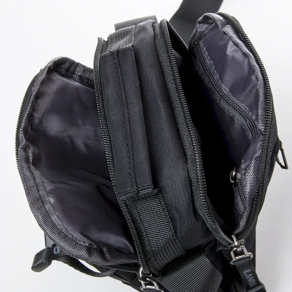Чоловіча сумка-планшет Lanpad. Два відділення, що закриваються на блискавку. Усередині відділення розташована кишеня на блискавці. На фасаді є три кишені на блискавці та одна кишеня на звороті. Регульований плечовий ремінь.