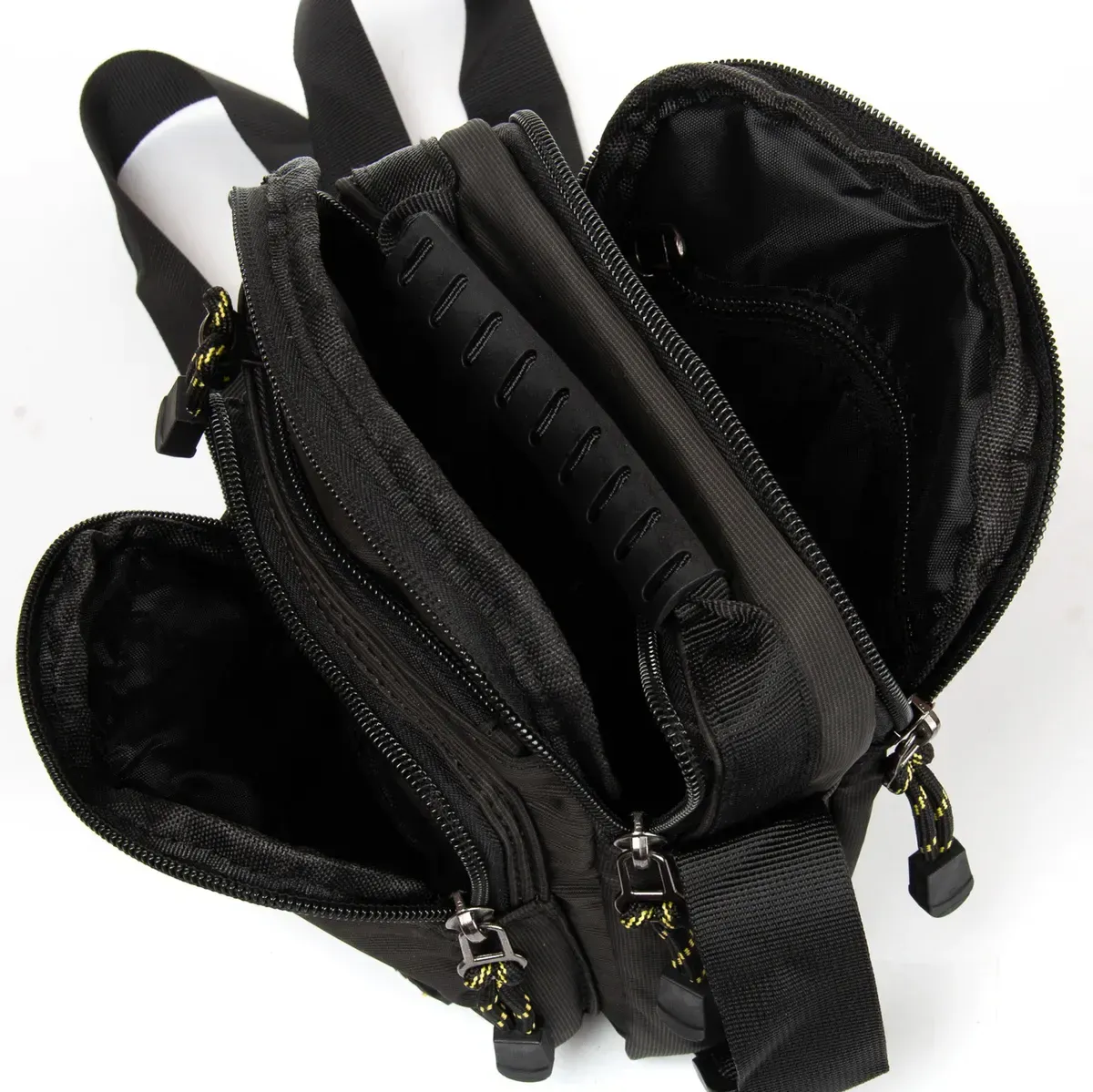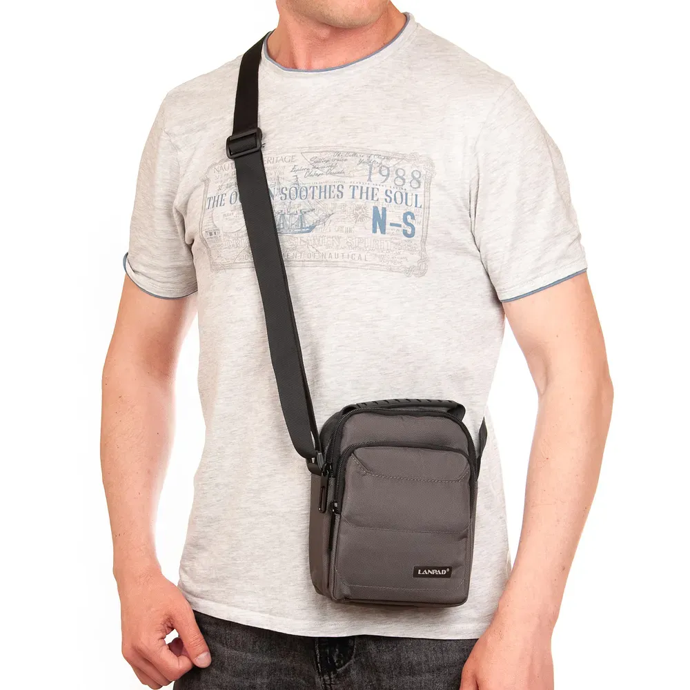 Чоловіча сумка Lanpad. Два відділення, що закриваються на блискавку. Усередині відділень є кишеня на блискавці. На фасаді знаходяться три кишені на блискавці. Регульований плечовий ремінь шириною 3см. Розмір (см) 16*20*9