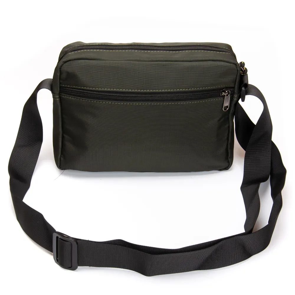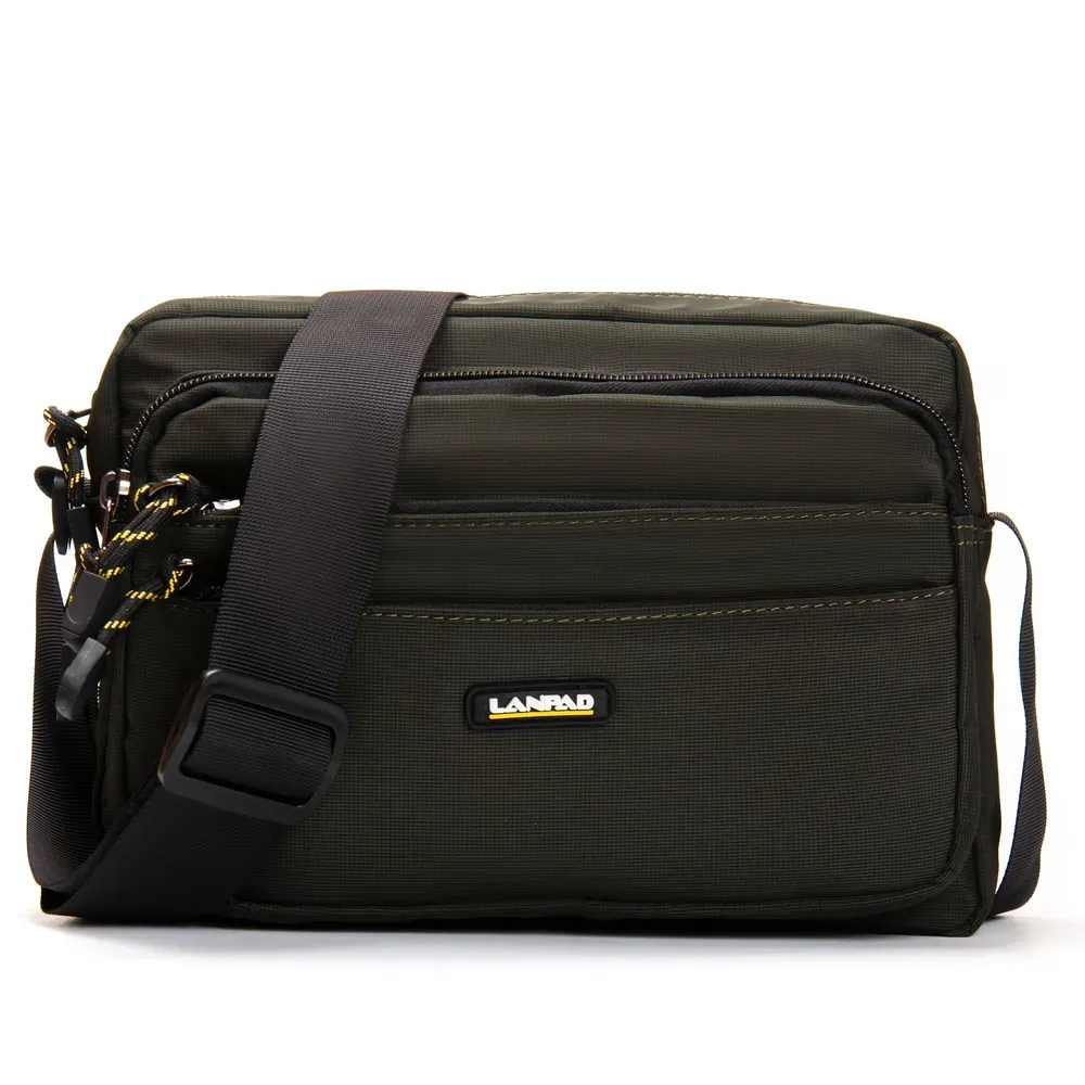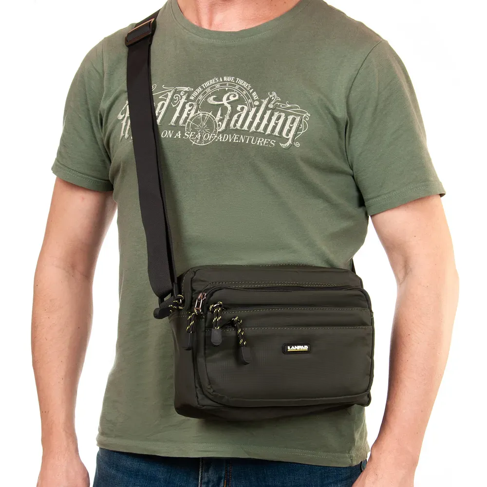 Мужская горизонтальная сумка кросс-боди Lanpad. Одно отделение, закрывается на молнию. Внутри отделения есть боковой карман на молнии и открытый карман. На фасаде расположены 3 вместительных кармана на молнии, а на обратной стороне один большой карман на молнии.