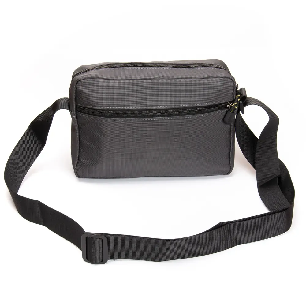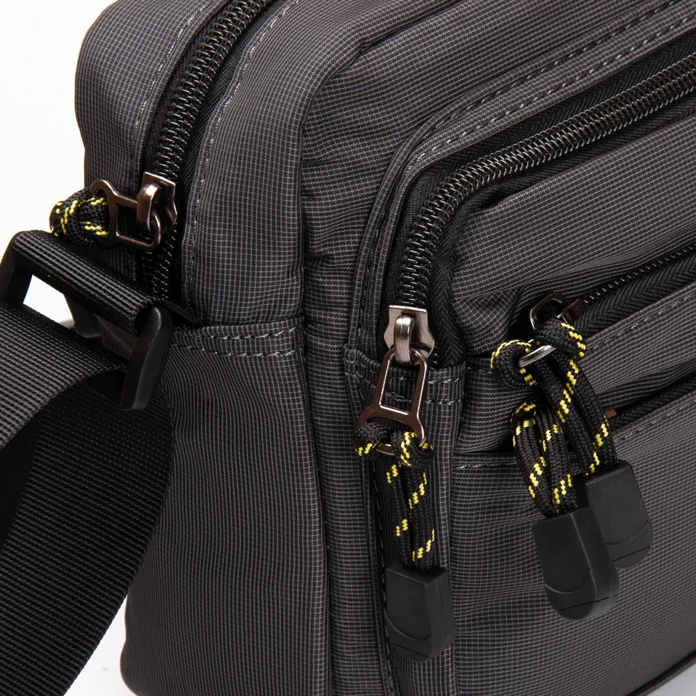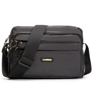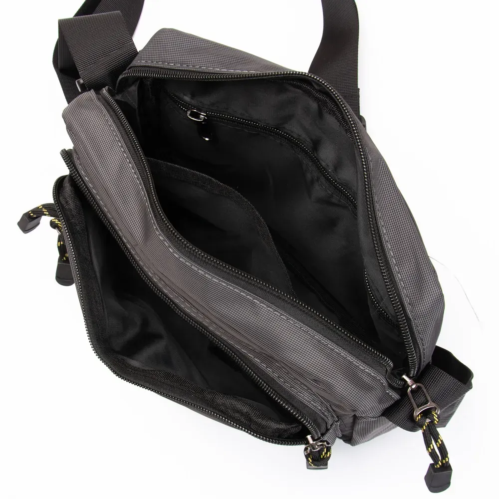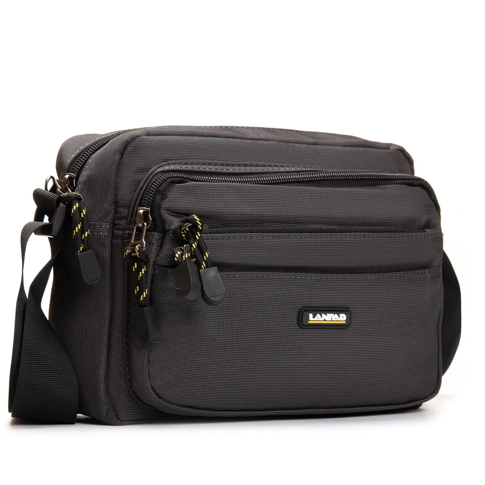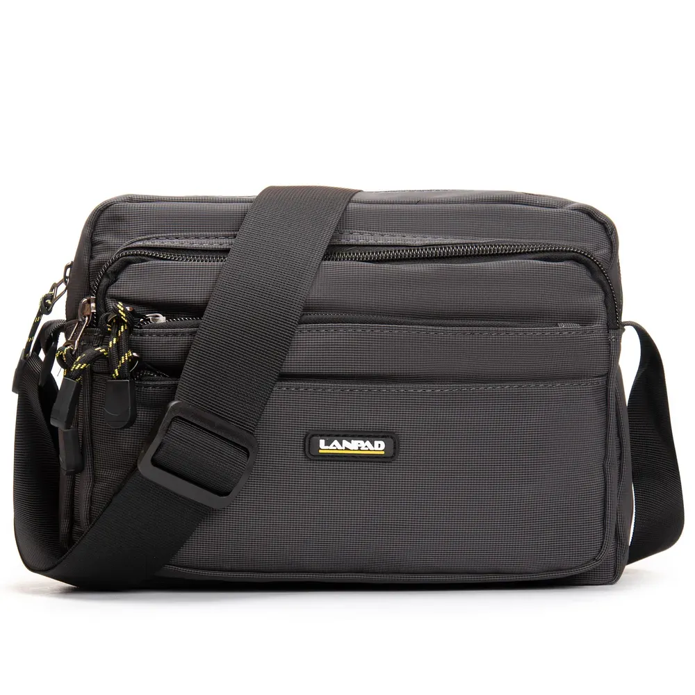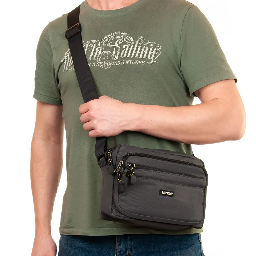 Мужская горизонтальная сумка кросс-боди Lanpad. Одно отделение, закрывается на молнию. Внутри отделения есть боковой карман на молнии и открытый карман. На фасаде расположены 3 вместительных кармана на молнии, а на обратной стороне один большой карман на молнии.