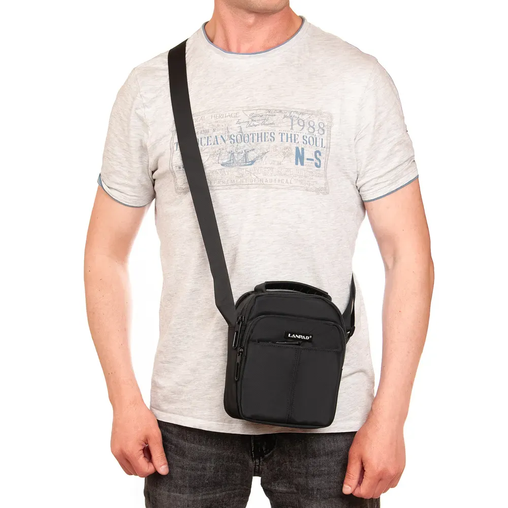 Чоловіча сумка Lanpad. Два відділення, що закриваються на блискавку. Усередині відділень є кишеня на блискавці та відкрита кишеня. На фасаді на звороті є кишені на блискавці. Регульований плечовий ремінь, шириною 4см. Розмір (див.) 20*25*10