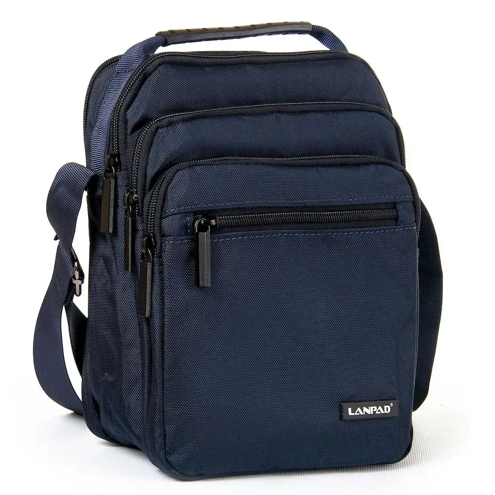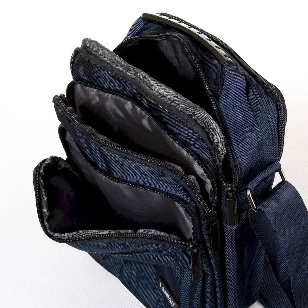 Чоловіча сумка Lanpad. Два відділення, що закриваються на блискавку. Усередині відділень розташована кишеня на блискавці. На фасаді розташовані три кишені на блискавці. Регульований плечовий ремінь.
