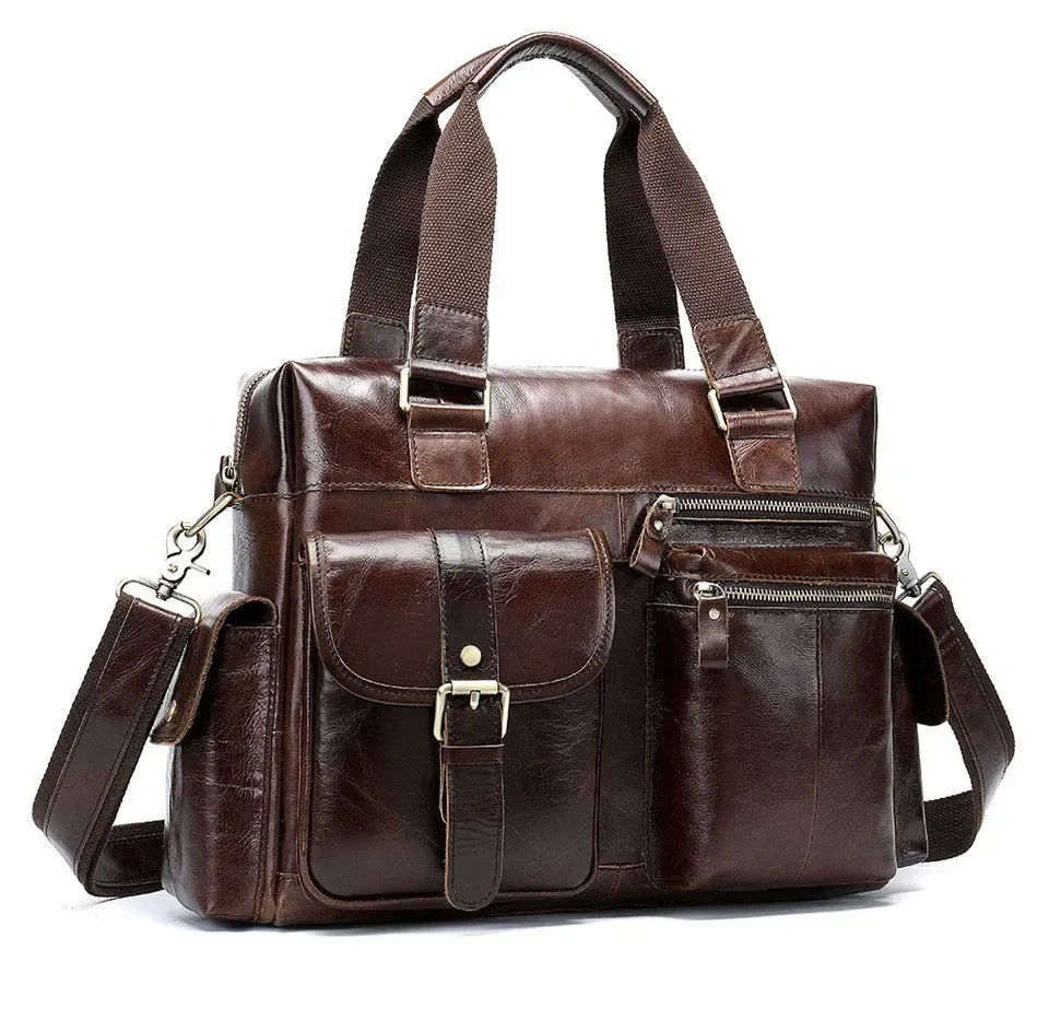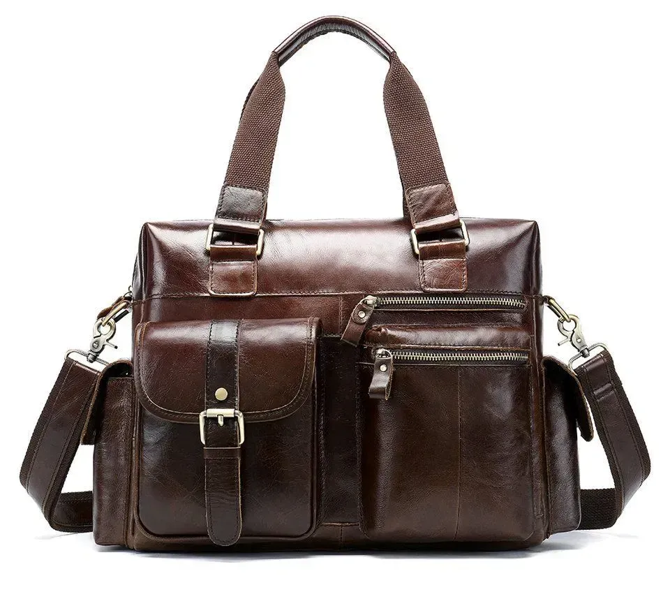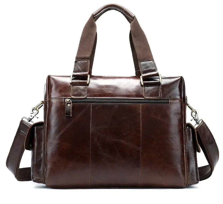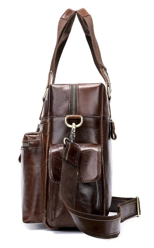 Містка сумка для ноутбука з натуральної шкіри. Підійде для зустрічей та роботи. У сумці можна носити папки із документами. Чудово підходить для ділових поїздок. Фурнітура у сумці золотистого кольору з міцного металу. Її легко носити в руках, так і на плечі за допомогою ручки, що знімається. Модель приємна на дотик і має гарний колір, що переливається на сонці. Аксесуар прошитий темно-коричневою ниткою. Може бути чудовим подарунком для близької людини.