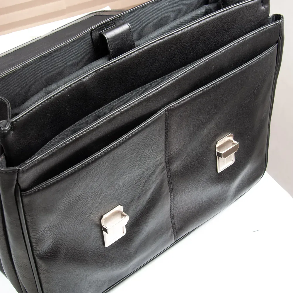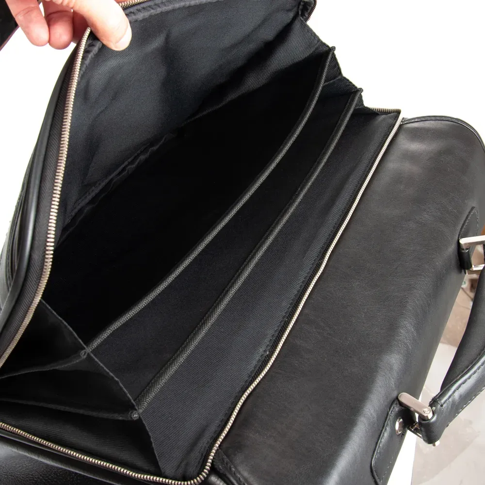 Под клапаном находятся два отделения разделенные перегородкой. Внутри одного отделения есть карман для ноутбука и бумаг, а во втором отделениии расположены открытые карманы для визиток, ручек, смартфона. Под клапаном на фасаде расположены два открытых кармана. Снаружи портфеля на обратной стороне есть большой карман на молнии с тремя отсеками для бумаг формата А4, а также крепление на ручку чемодана.