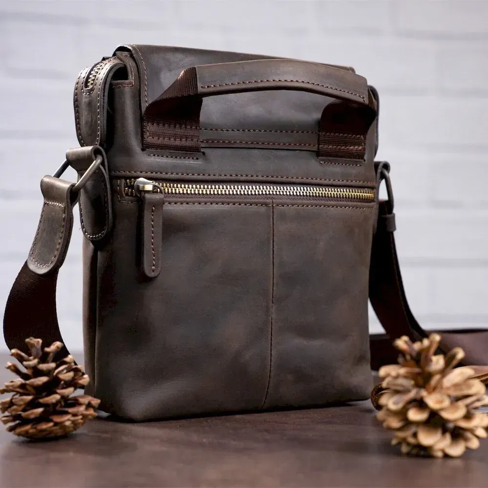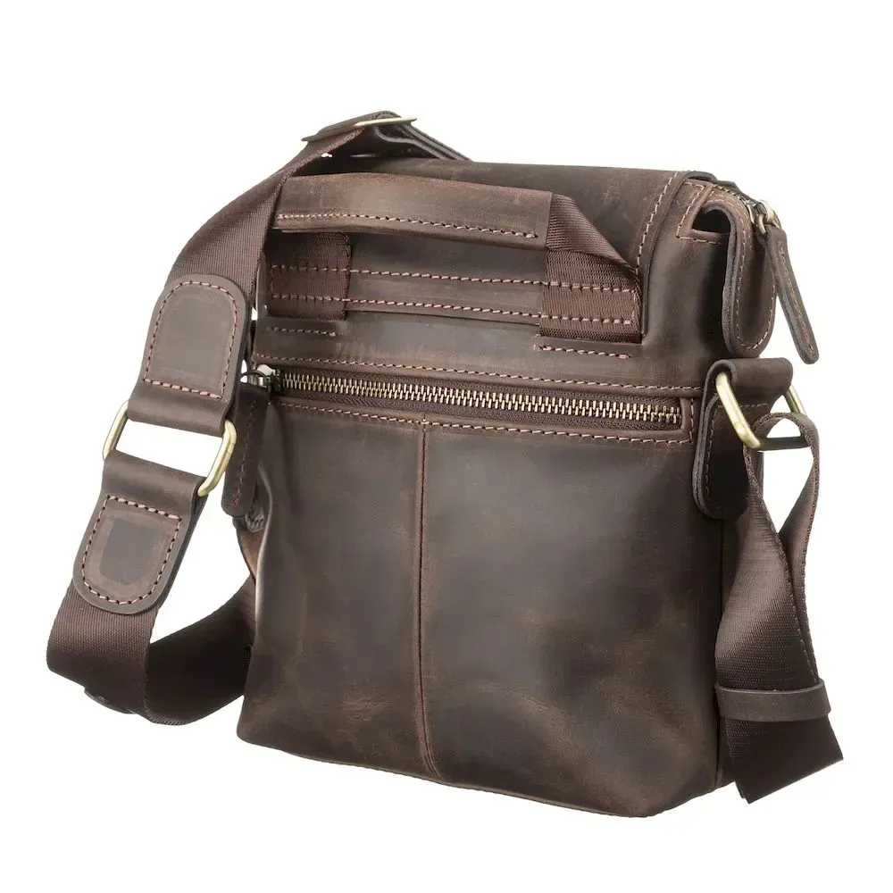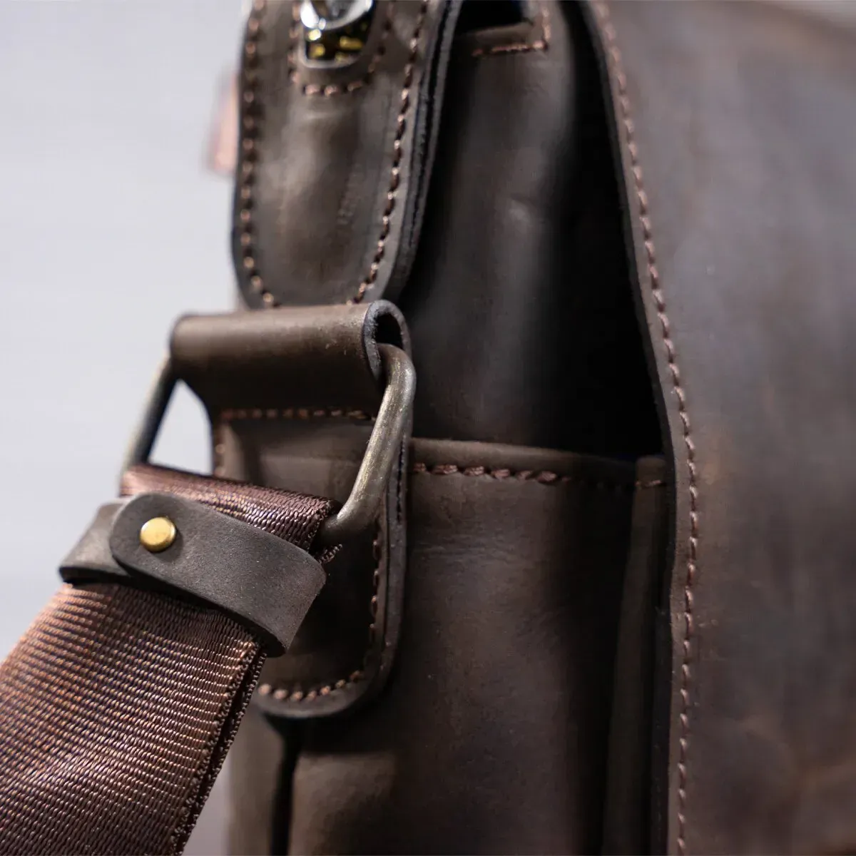 Чоловіча шкіряна сумка невеликого розміру із клапаном. Аксесуар виконаний з натуральної вінтажної шкіри, характерними ознаками якої є: неоднорідність забарвлення та потертості, які надають виробу вишуканого, індивідуального вигляду.