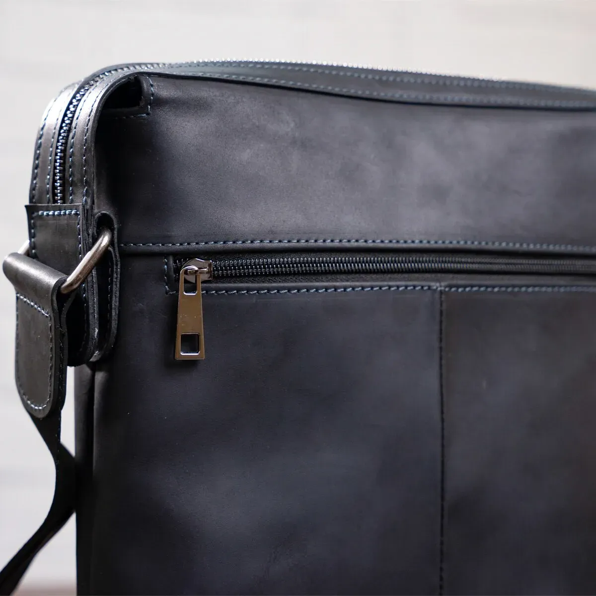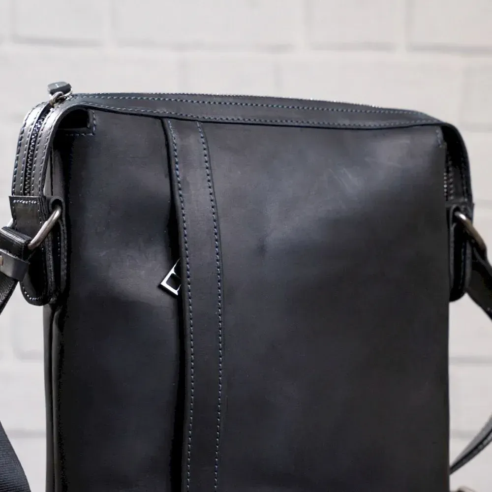 Красива сумка для стильних чоловіків виконана з натуральної вінтажної шкіри, характерними ознаками якої є: неоднорідність забарвлення та потертості, які надають виробу вишуканого, індивідуального вигляду. Усередині: кишеня-перегородка на блискавці, кишеня для телефону, відділення для ручок і дрібниць,