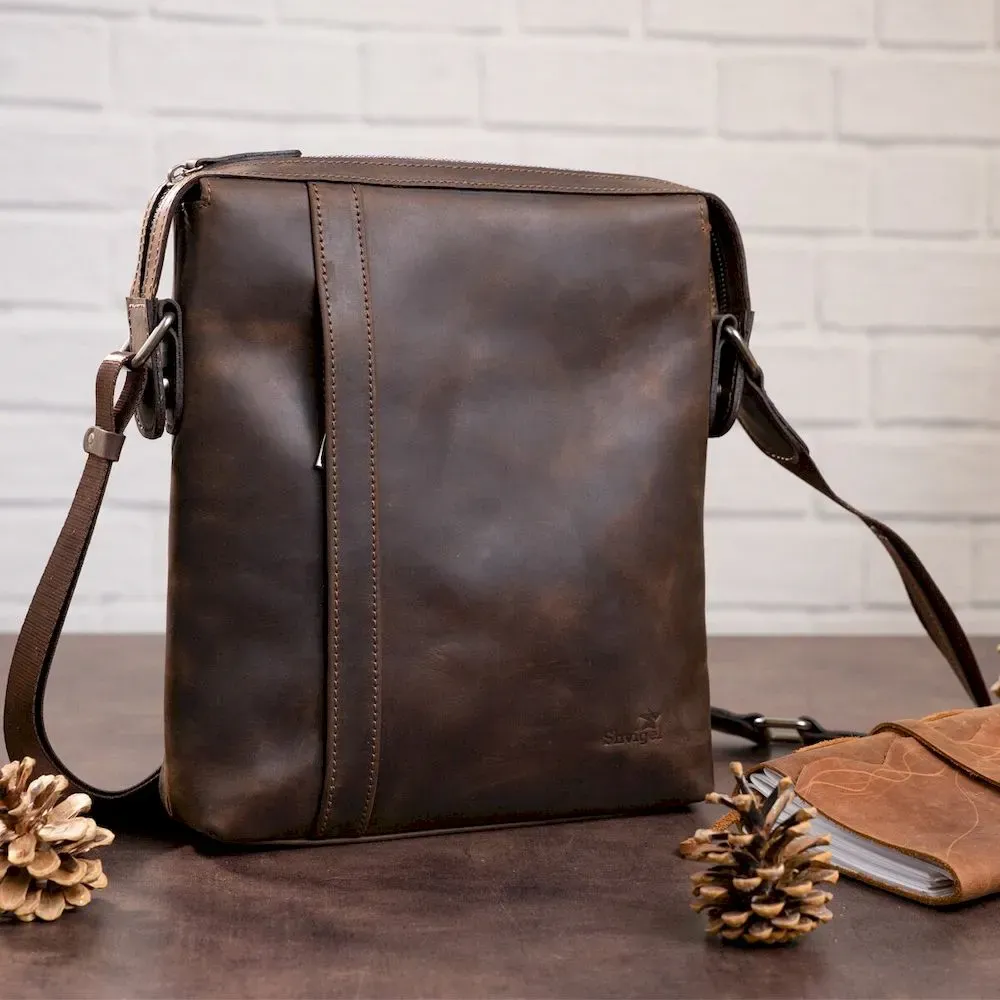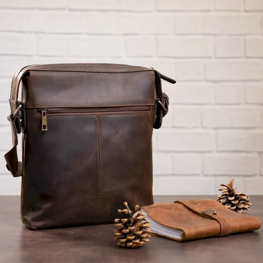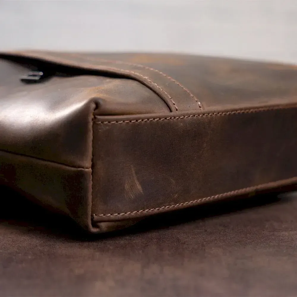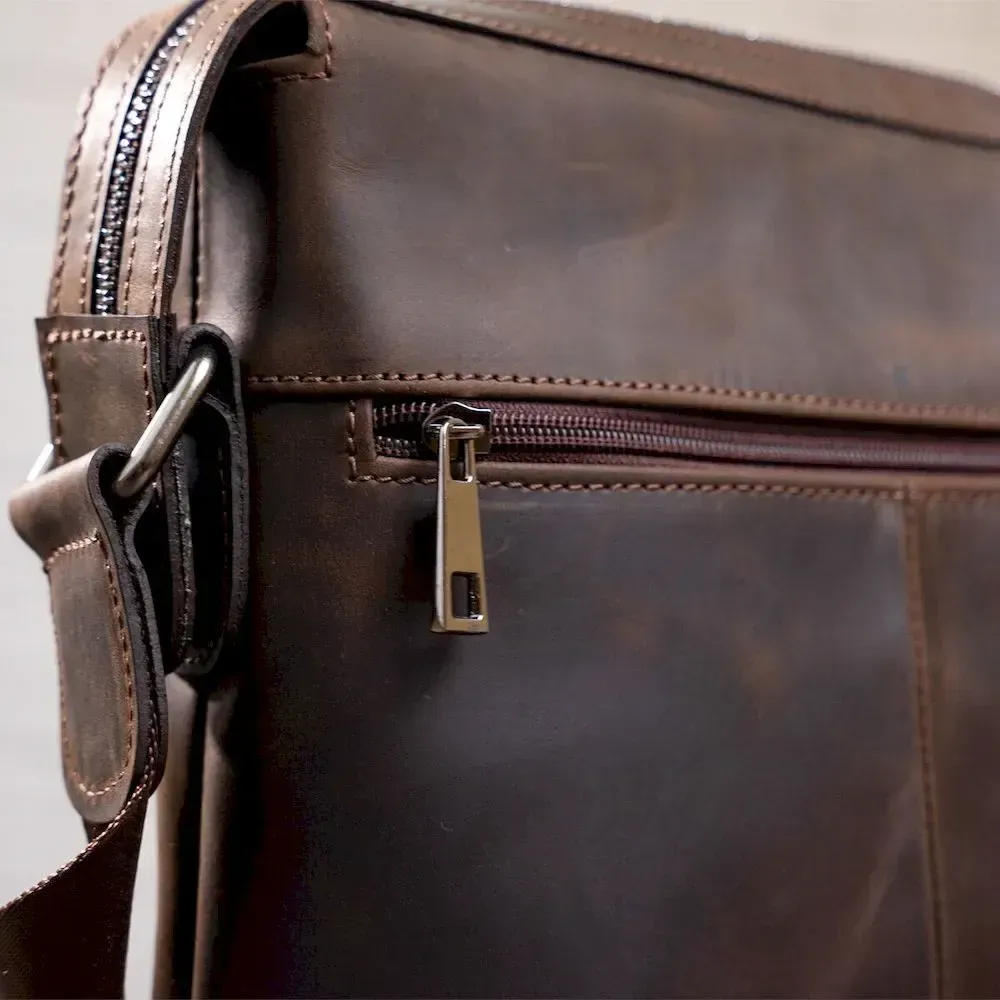 Надійна сумка для стильних чоловіків виконана з натуральної вінтажної шкіри, характерними ознаками якої є: неоднорідність забарвлення та потертості, які надають виробу вишуканого, індивідуального вигляду. Усередині: кишеня-перегородка на блискавці, кишеня для телефону, відділення для ручок і дрібниць,