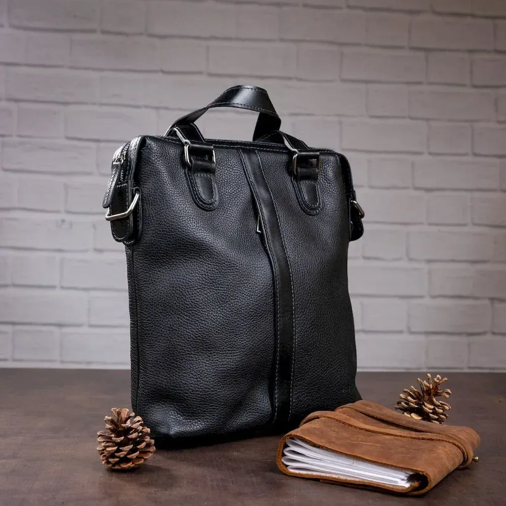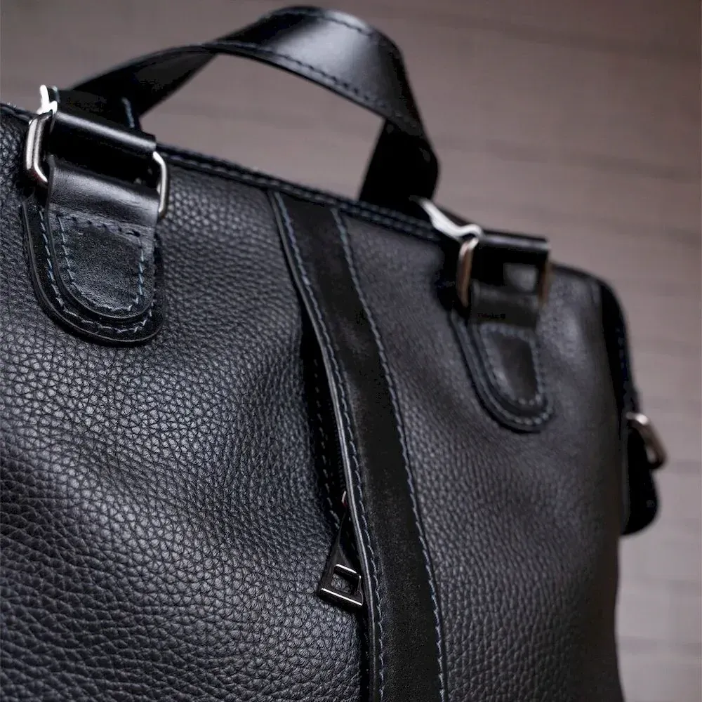 Ділова сучасна сумка з натуральної зернистої шкіри, з двома шкіряними ручками з гладкої шкіри.